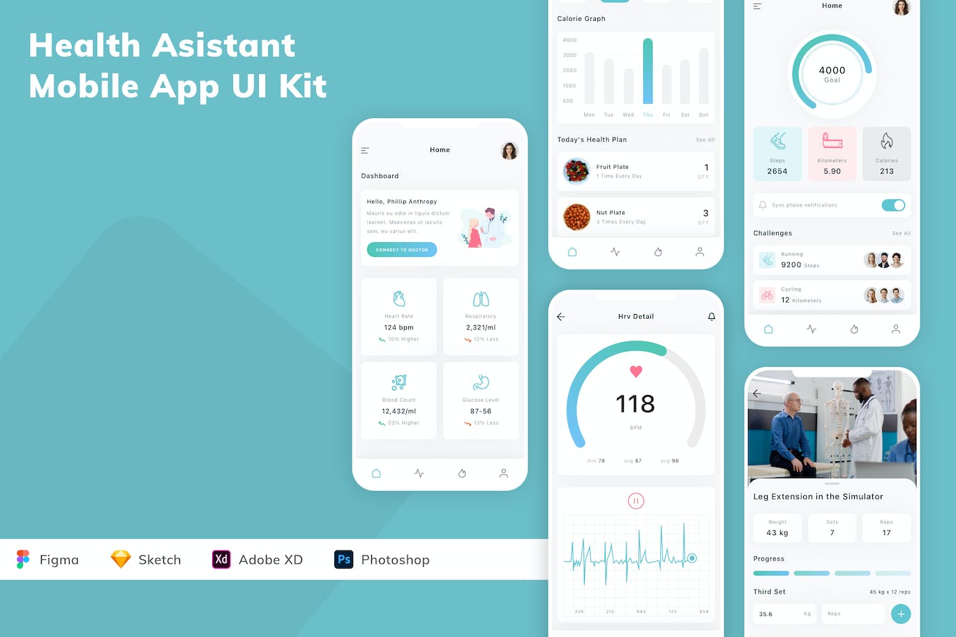 Health Asistant Mobile App UI Kit采用现代设计趋势设计。