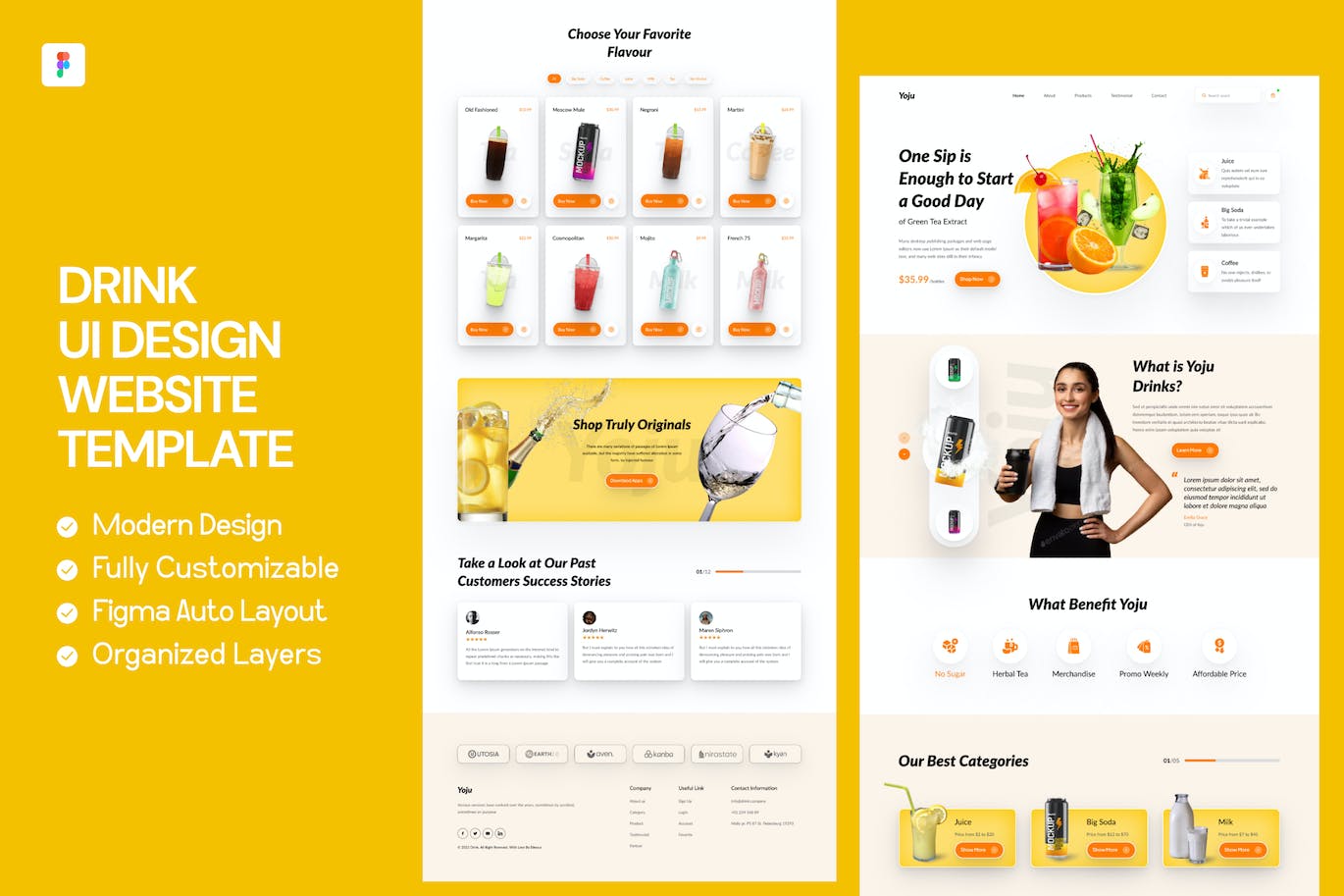 这个饮料用户界面设计网站模板具有现代和简约的风格。这个概念很容易编辑、自定义和调整大小,因为有矢量形状和组织得很好的层。