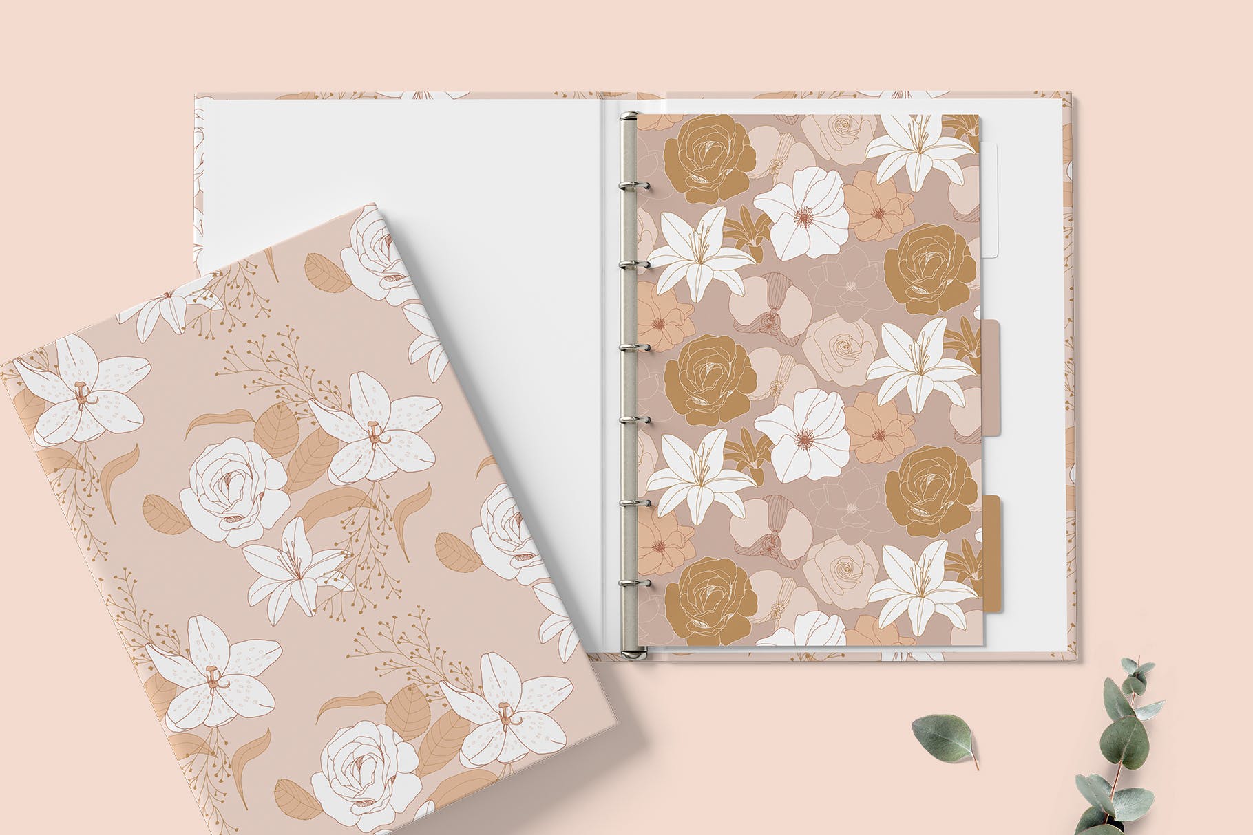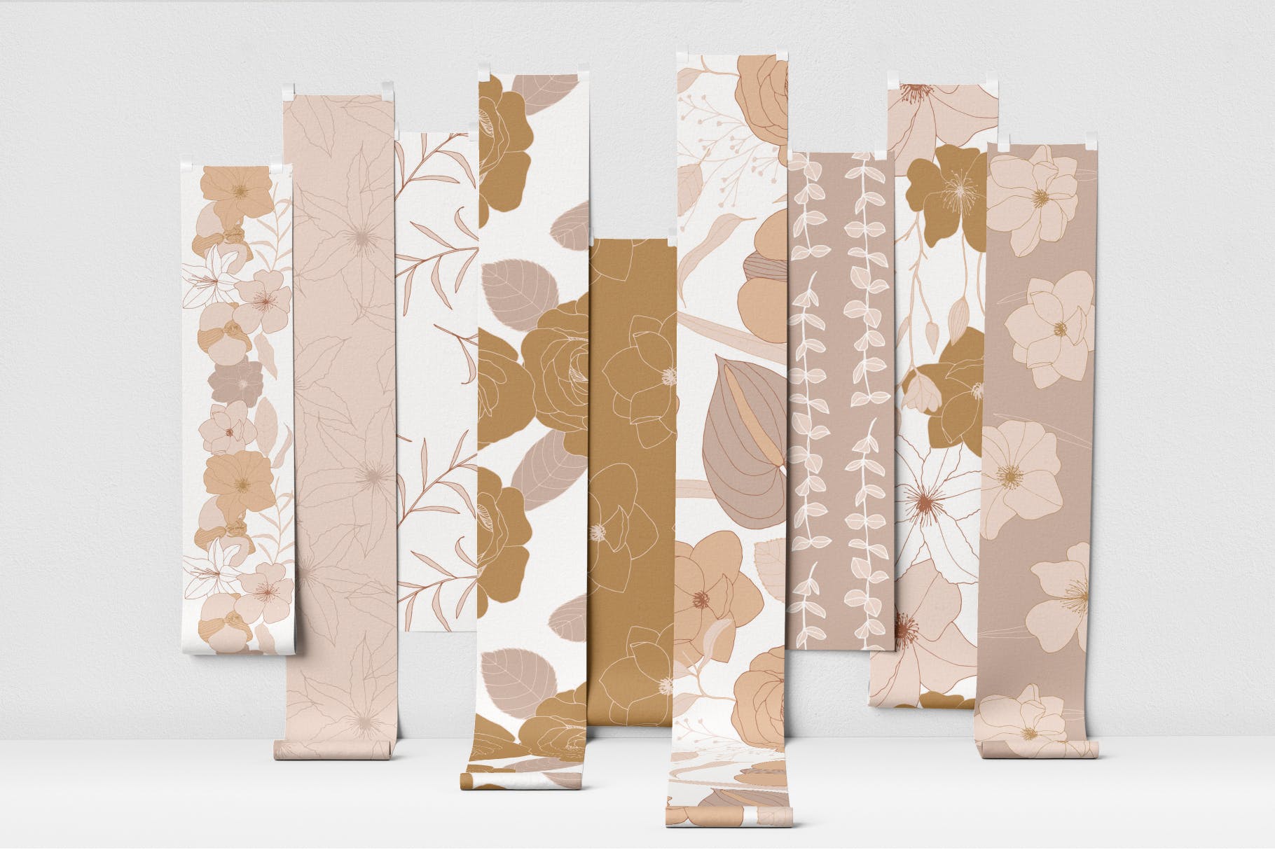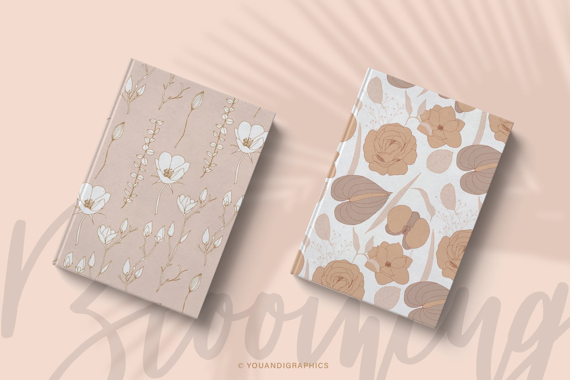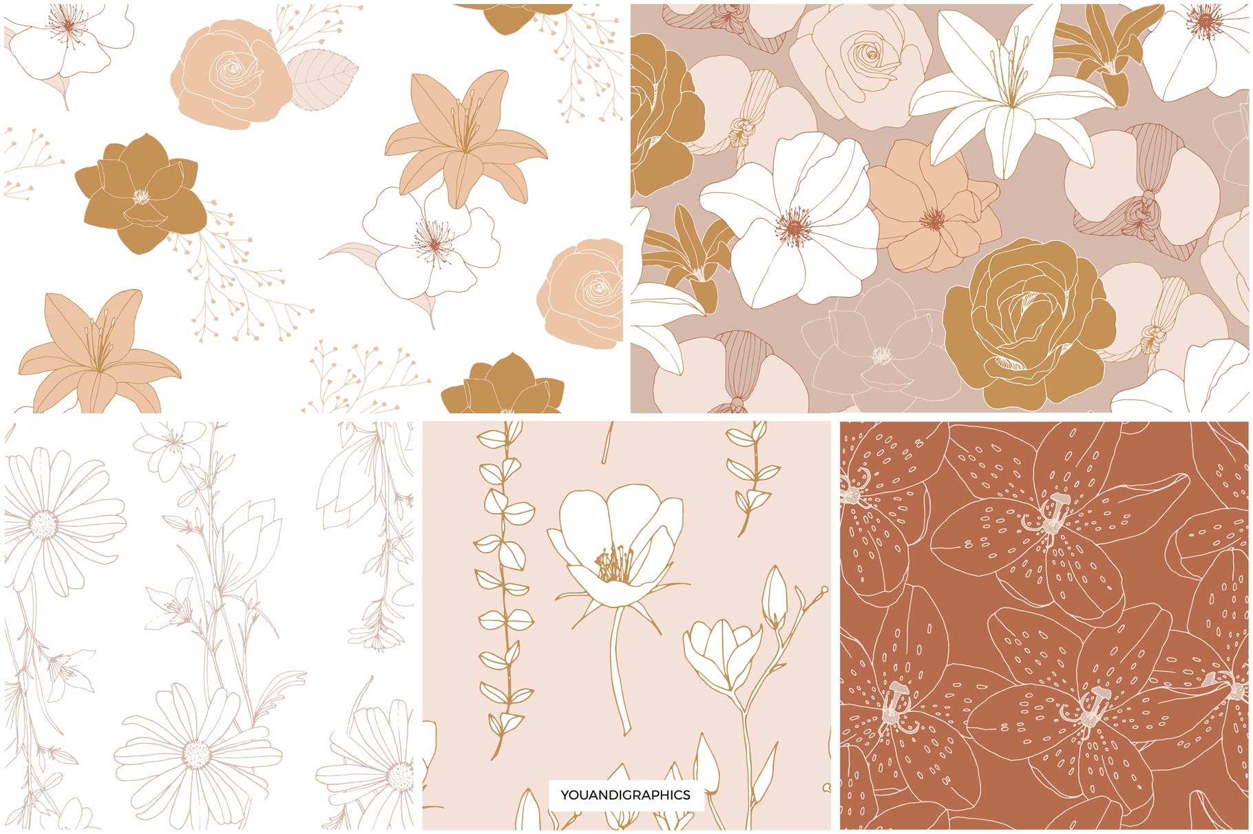 这组盛开的花园花卉图案是一套无缝矢量图案,由线条手绘花卉插图组成。