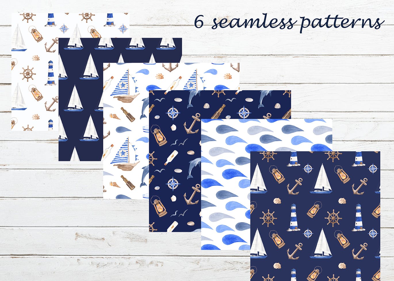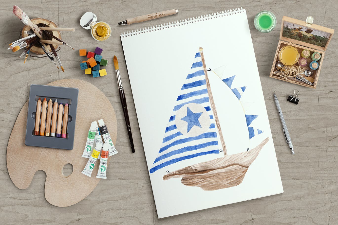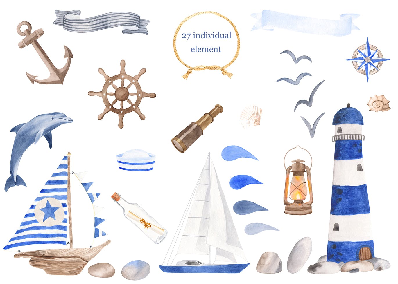 这一套航海主题水彩图案包括:船,游艇,灯塔,海豚,舵轮,海绳,灯笼,丝带,望远镜,锚,指南针等元素,所有图片均为PNG格式水彩画,具有高分辨率(300 dpi),背景透明。