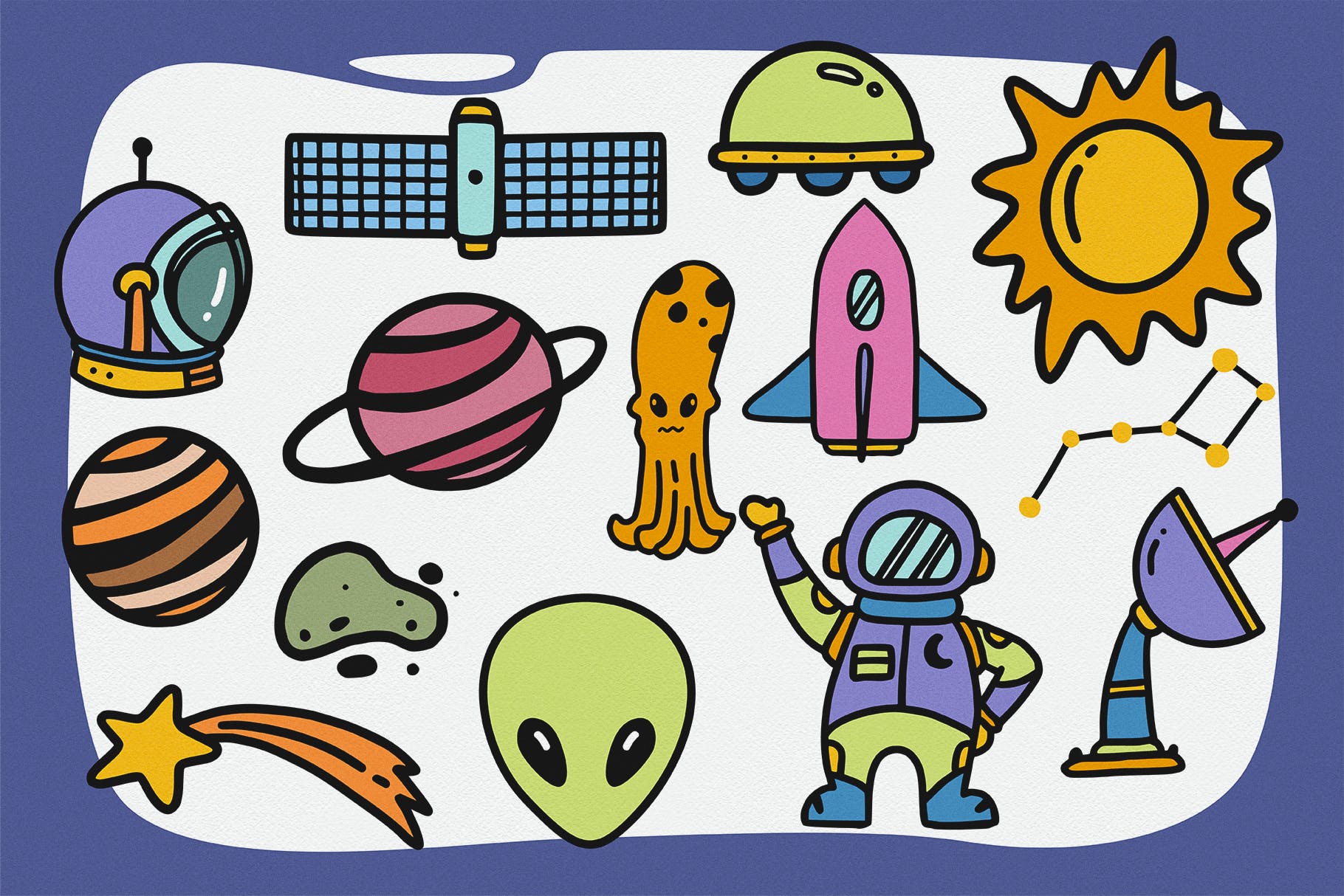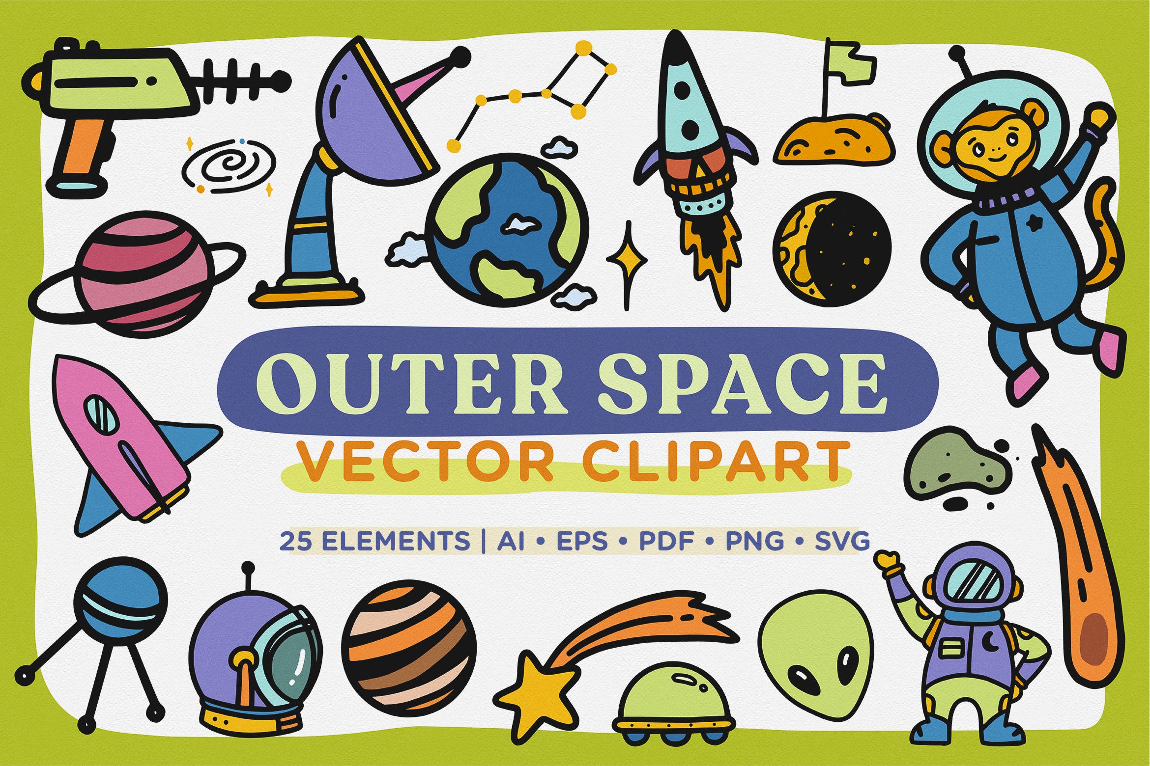 这组合集包括了25个可爱的外太空涂鸦剪贴画,已保存为矢量格式。可用于展示许多艺术作品,如:图案,纪念品,包装,商品,书籍封面,海报,小册子,信息图表,传单,社交媒体,横幅或任何其他宣传媒体。