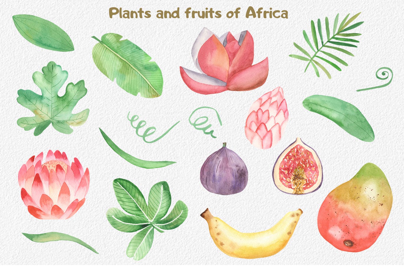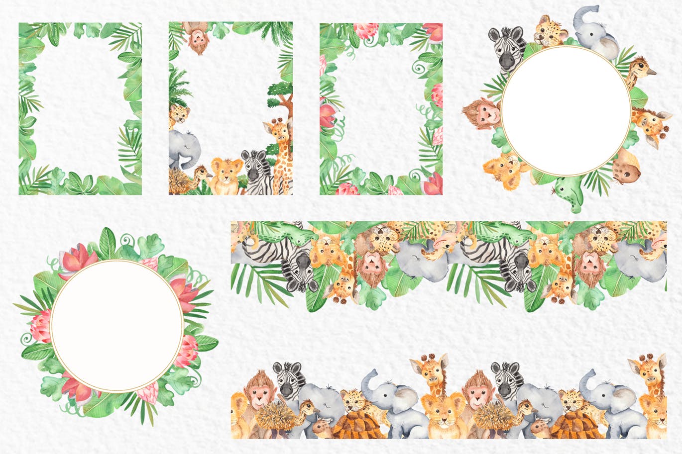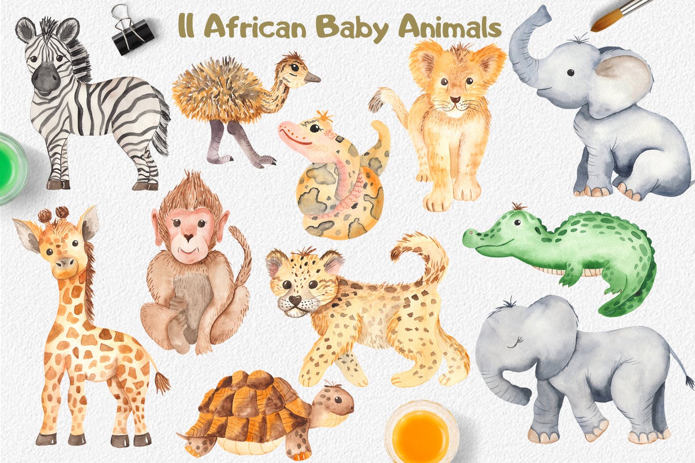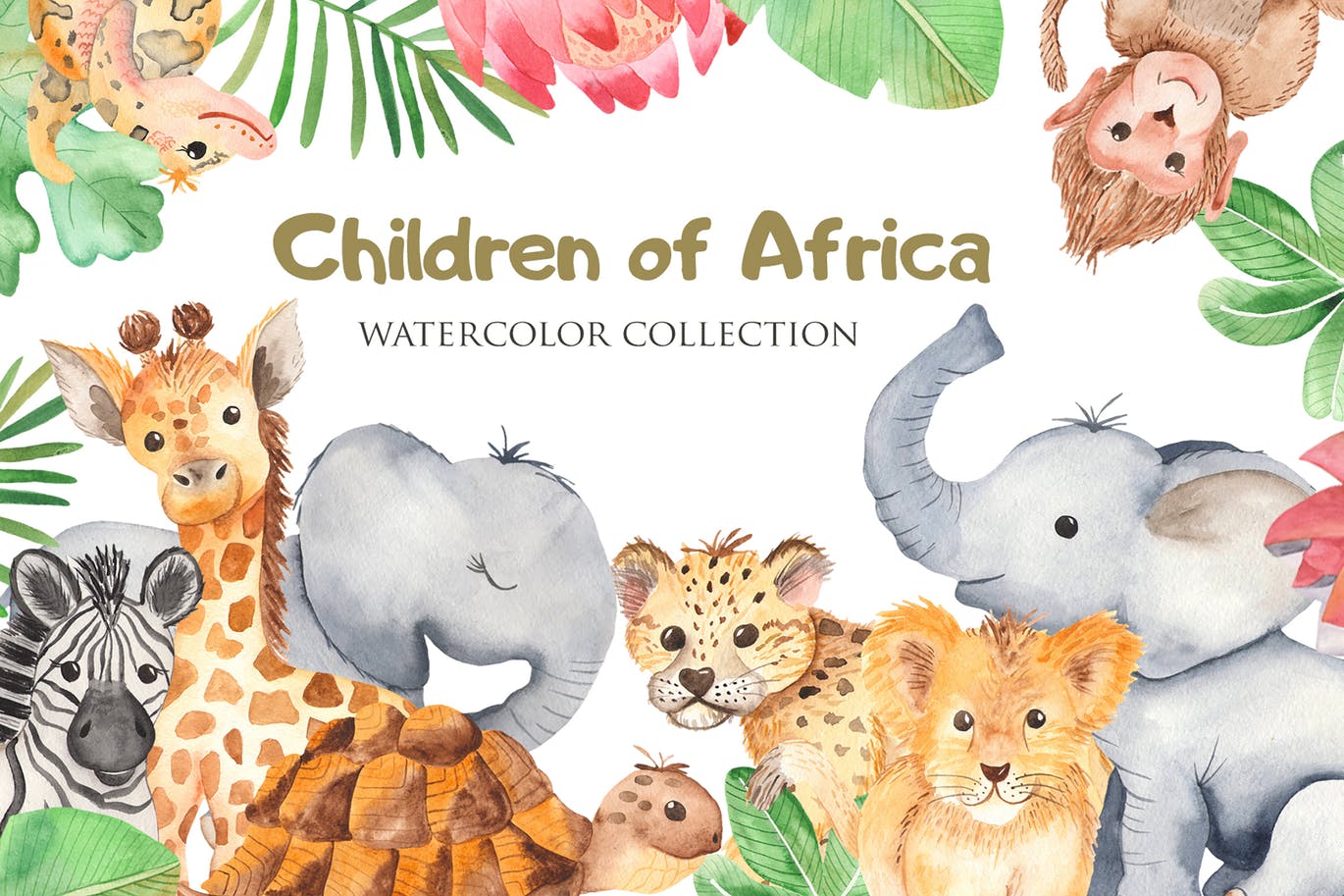 这组可爱的小动物剪贴画合集包括了长颈鹿、大象、鸵鸟、斑马、乌龟、鳄鱼、蟒蛇等动物,还包括了植物、鲜花、水果。