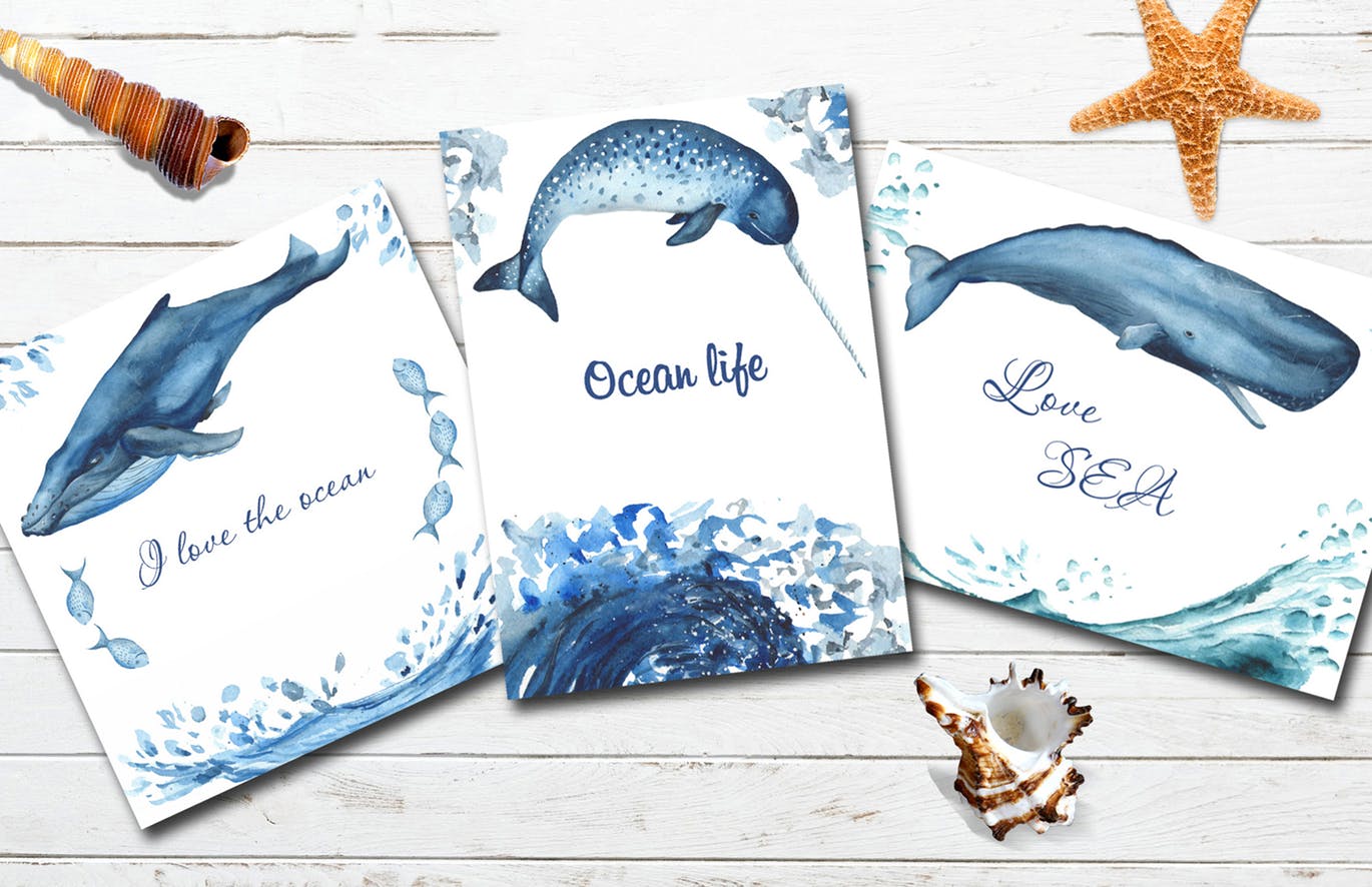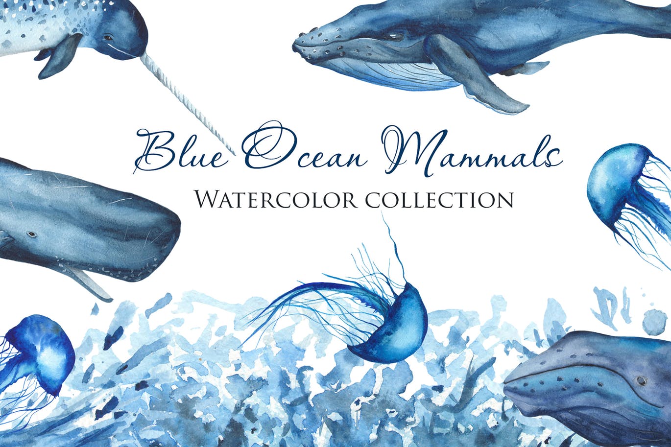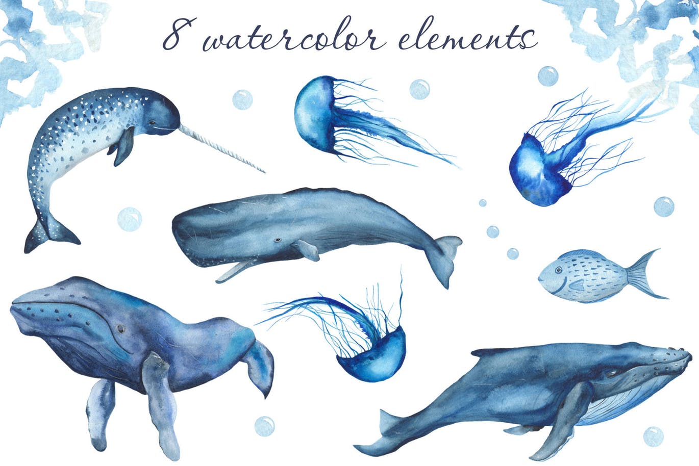 这组合集包括了鲸鱼,抹香鲸,独角鲸,水母,海浪,海啸等元素,所有图片均保存为PNG格式水彩画,具有高分辨率(300 dpi),背景透明。