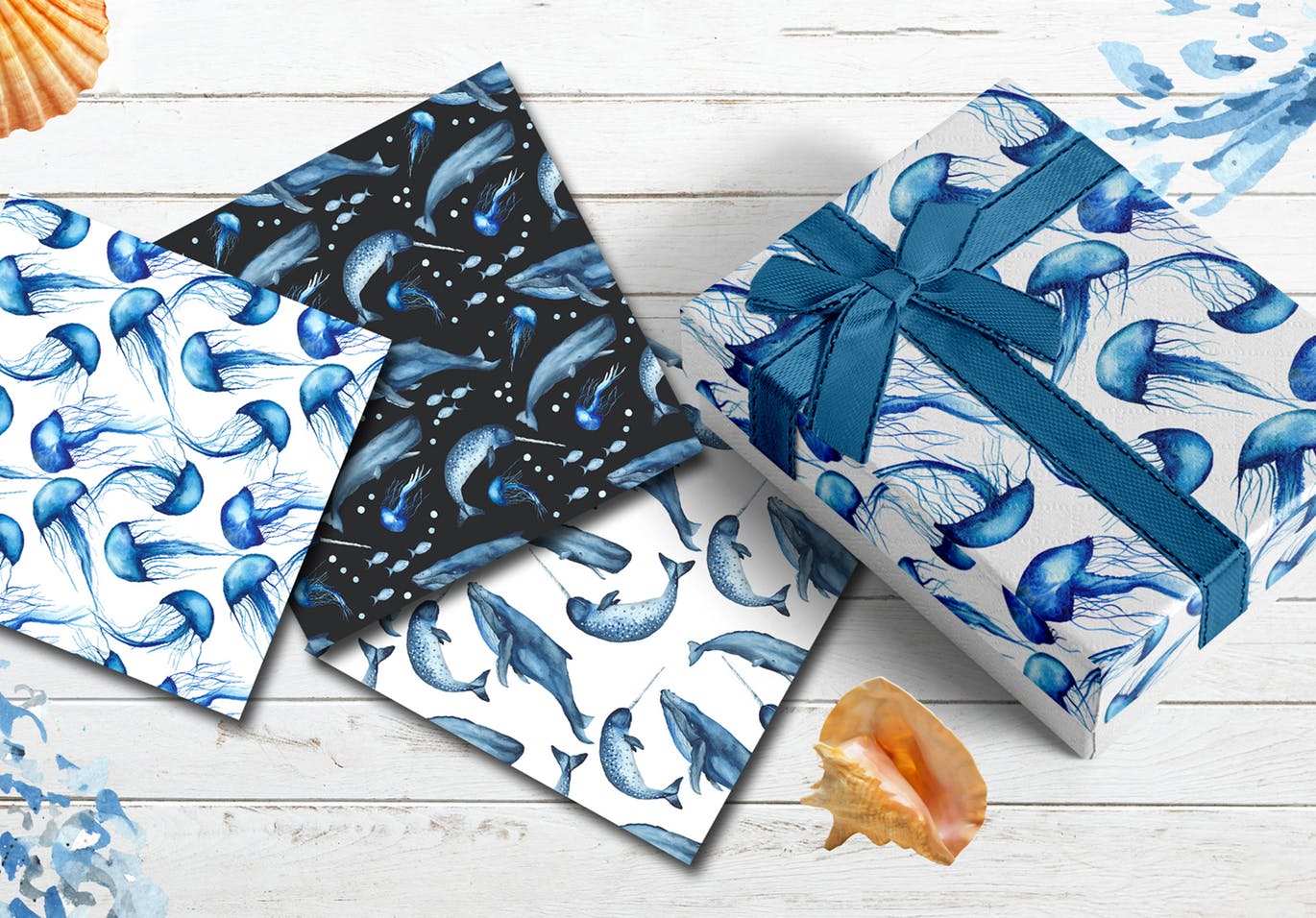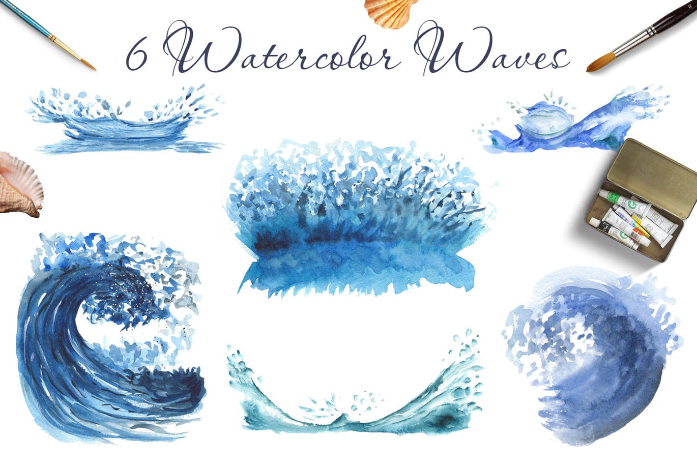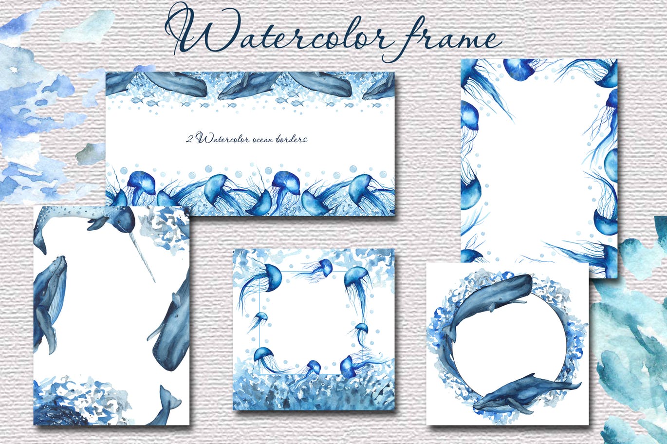 这组合集包括了鲸鱼,抹香鲸,独角鲸,水母,海浪,海啸等元素,所有图片均保存为PNG格式水彩画,具有高分辨率(300 dpi),背景透明。