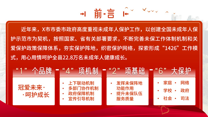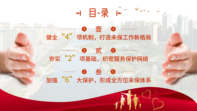 简介:红黄简约未成年人保护工作汇报ppt模板,本模板共12P,包含封面页、目录页、过渡页、图表页、逻辑图示页、内容页等页面,采用红黄色+简约图示进行设计,红黄配色营造温暖的感觉,剪影的使用契合主题,图示的使用逻辑清晰,整体简约干净,希望这个作品的设计和氛围感能够让你喜欢,P界达人 空山风月 作品。