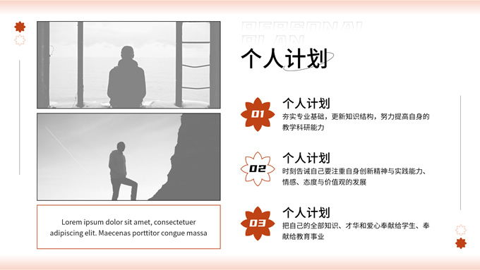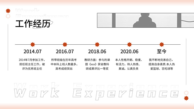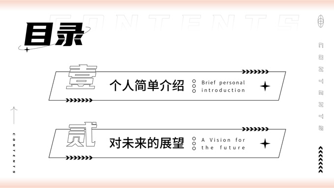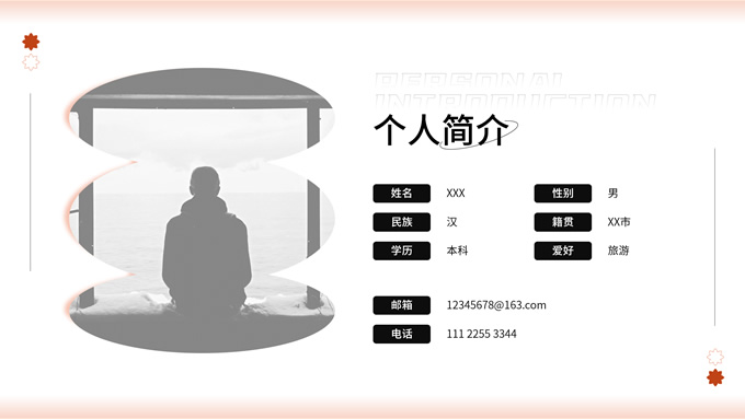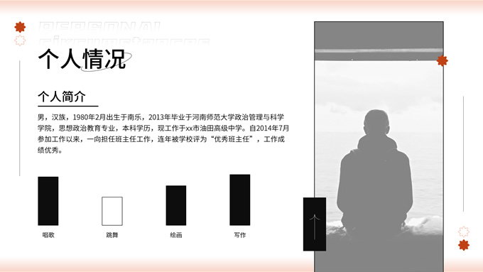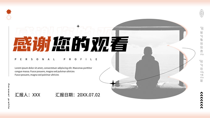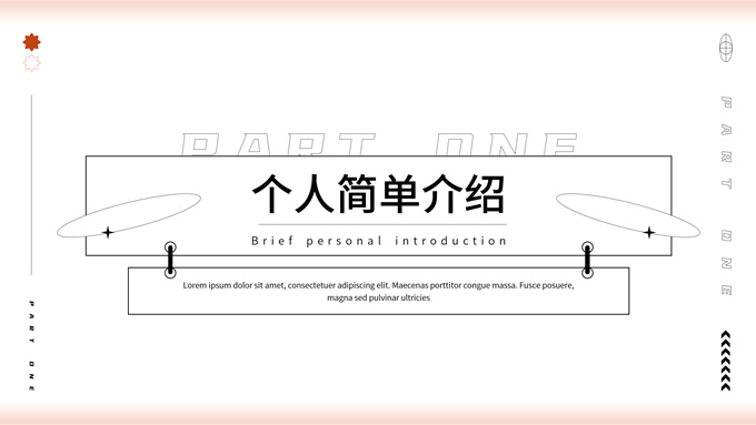 简介:轻量感个人求职简历ppt模板,本模板共10P,在版式上涵盖了封面页、目录页、过渡页、内容页、图表页等,在颜色上,本套模板选取了橙色,加上渐变,营造一种轻量的感觉,在小元素的添加上多使用星星、弧线等,希望本套模板里的一些元素、配色、能给你带来启发,P界达人 骷髅玉 作品。