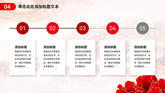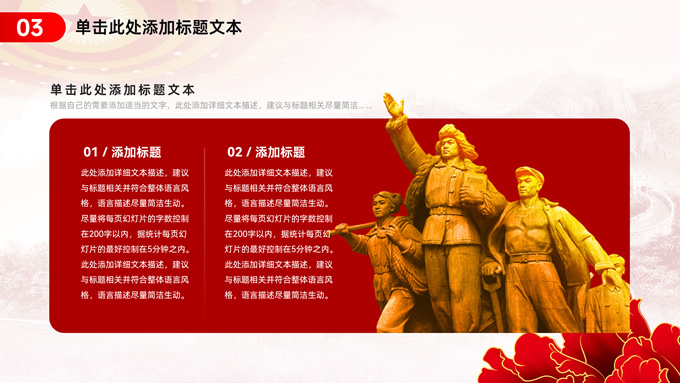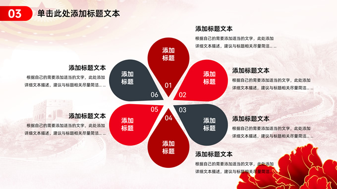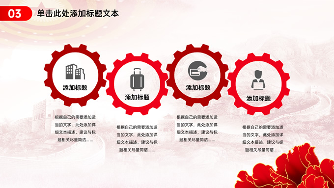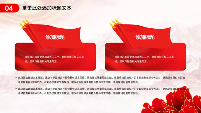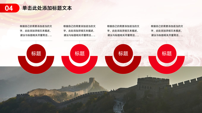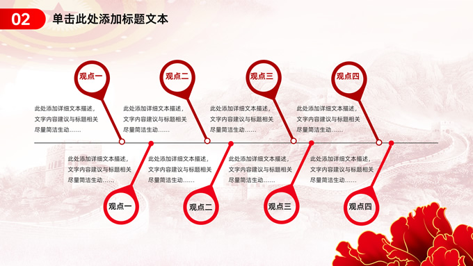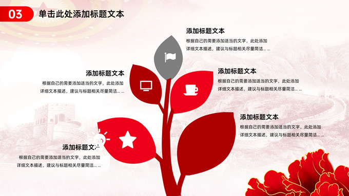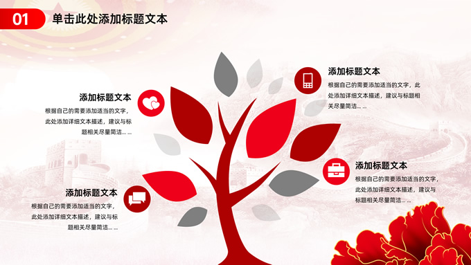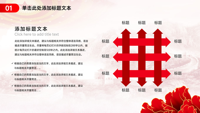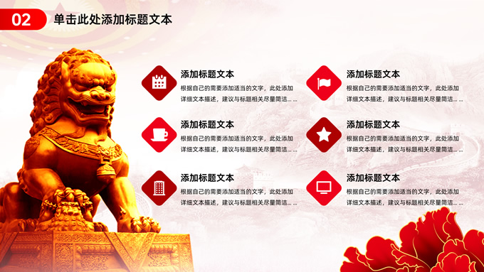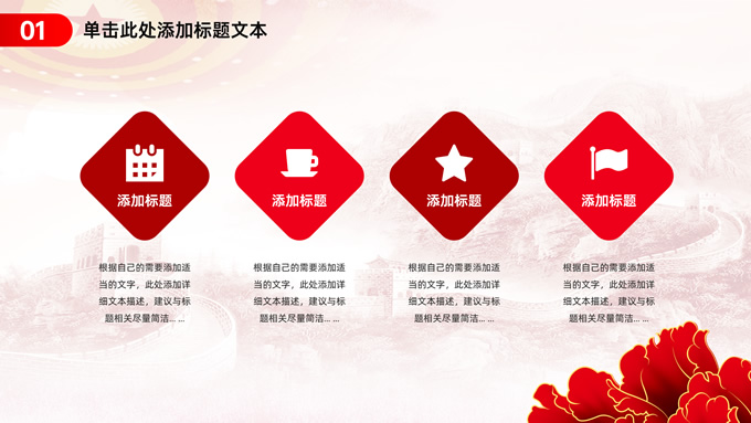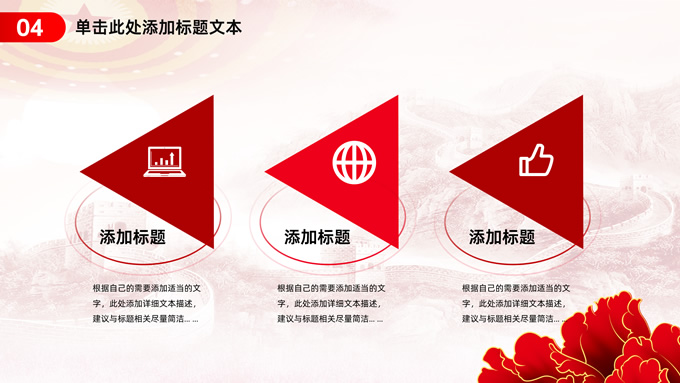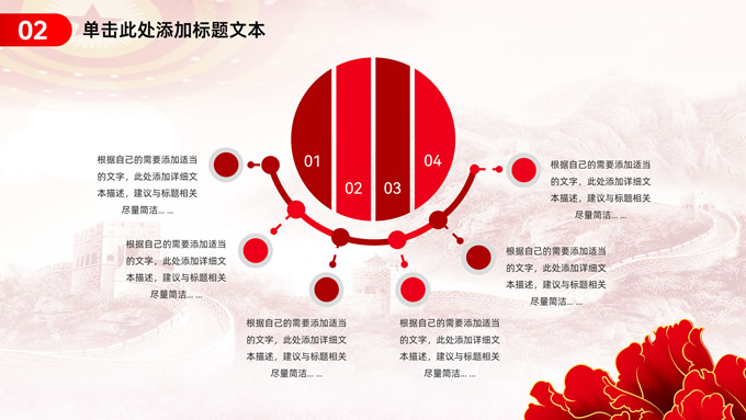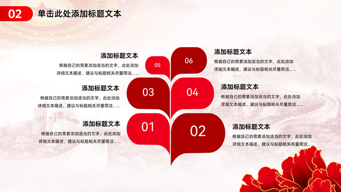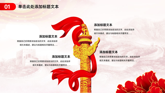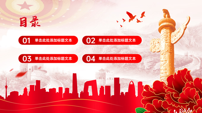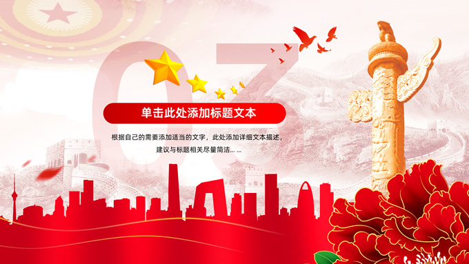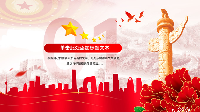 简介:简约实用党建工作汇报通用ppt模板,本模板共23P,淡雅万里长城背景,人民大会堂顶灯、华表、国花牡丹、城市剪影、流光线条、和平鸽元素毛笔字标题创意封面,中国红配色,简约党政风版式内容页,适合党建工作汇报、党课课件、学习心得等场景应用的党建主题ppt模板。