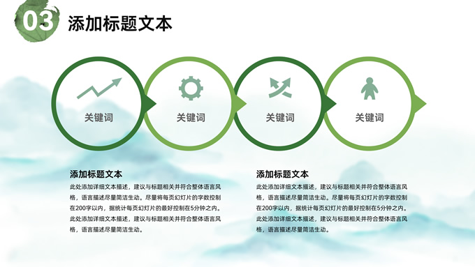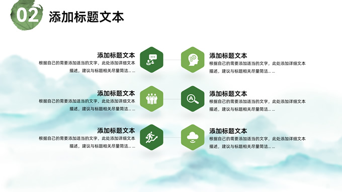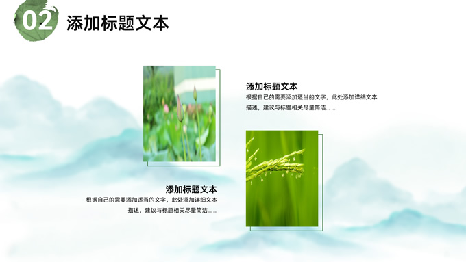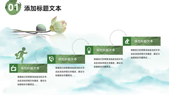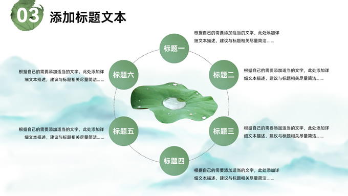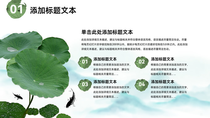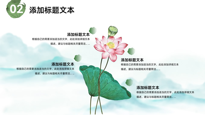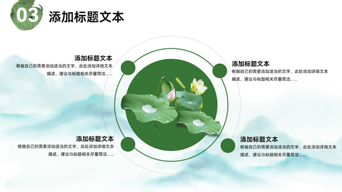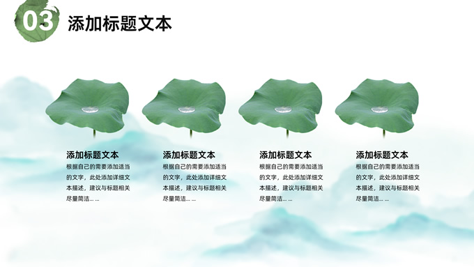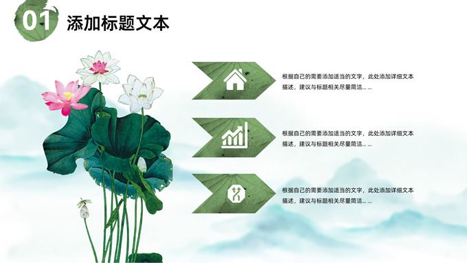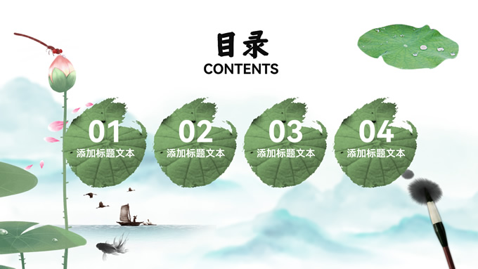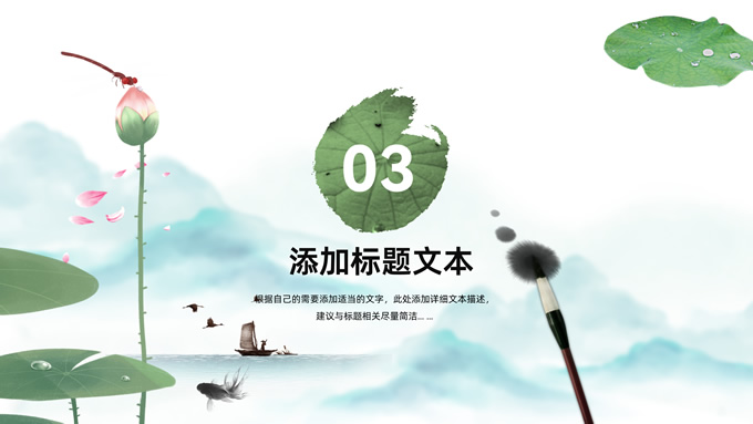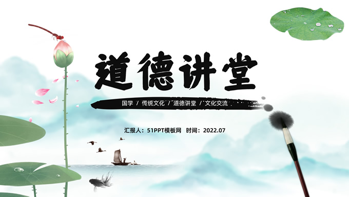 简介:简约清新中国风道德讲堂ppt模板,本模板共23P,淡雅清新水墨山川背景,荷叶、荷花、毛笔、墨点、蜻蜓、帆船、金鱼、花瓣元素毛笔字创意封面,刷迹元素目录页、过渡页,小清新绿配色,简约中国风版式内容页,适合文化交流、传统文化宣讲、道德讲堂等场景应用的中国风主题ppt模板。