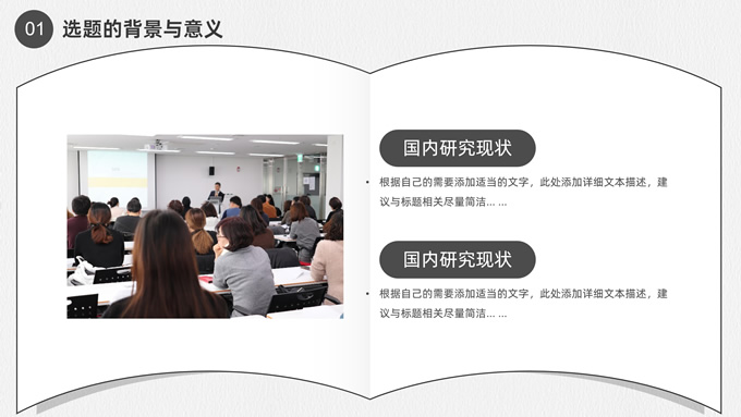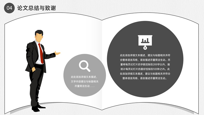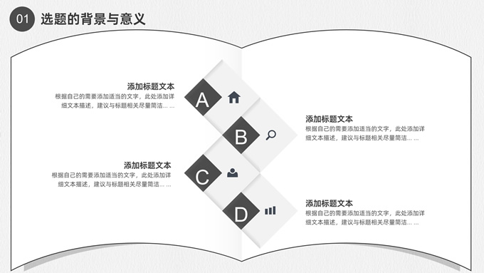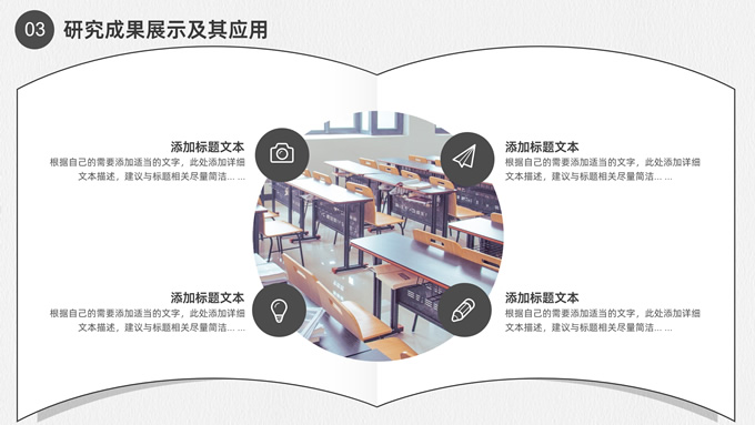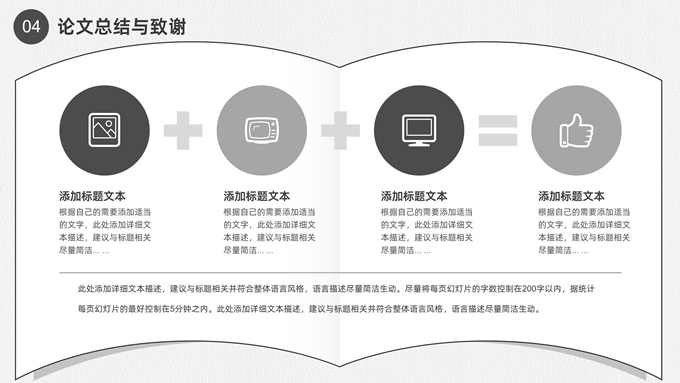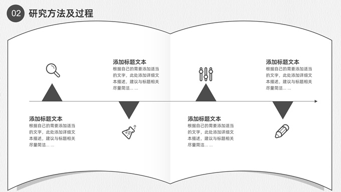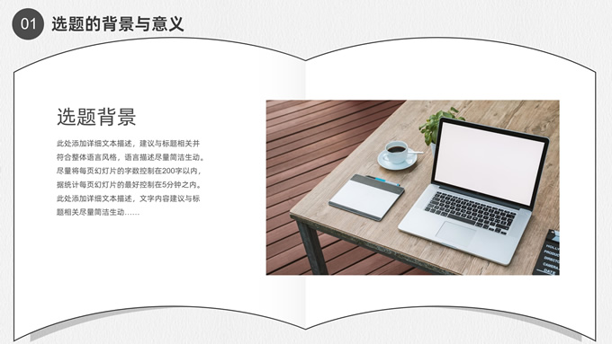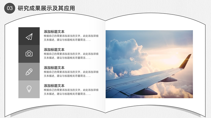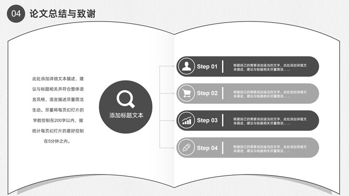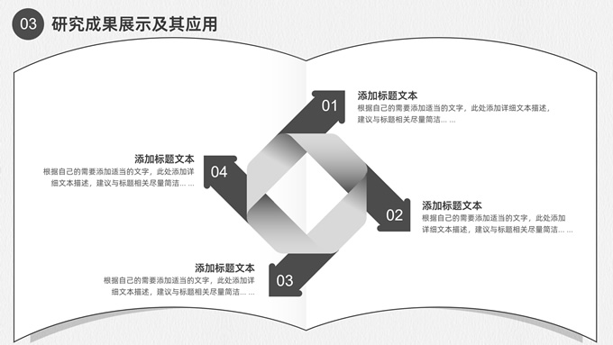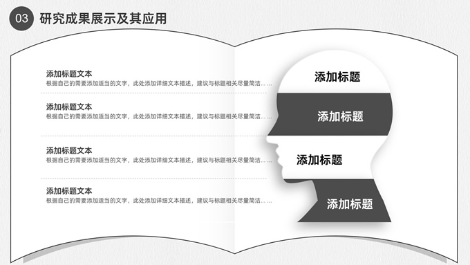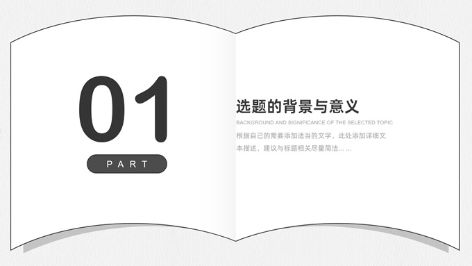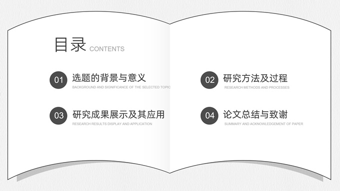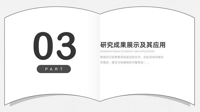 简介:翻书创意极简论文答辩通用ppt模板,本模板共23P,目录:选题的背景与意义、研究方法及过程、研究成果展示及应用、论文总结与致谢,纸张质感背景,翻开的书籍线条元素极简标题文字封面、目录页、过渡页,素雅灰配色,扁平化图表,简约内容版式,适合论文答辩、开题报告、学术汇报、毕业汇报等场景应用的简约答辩通用型ppt模板。