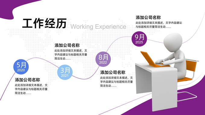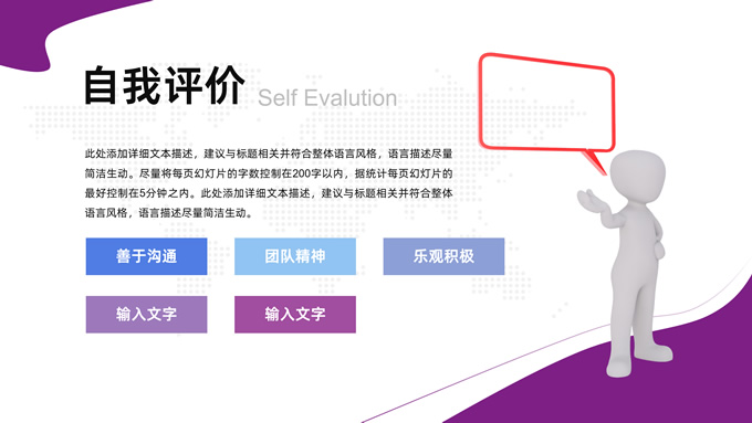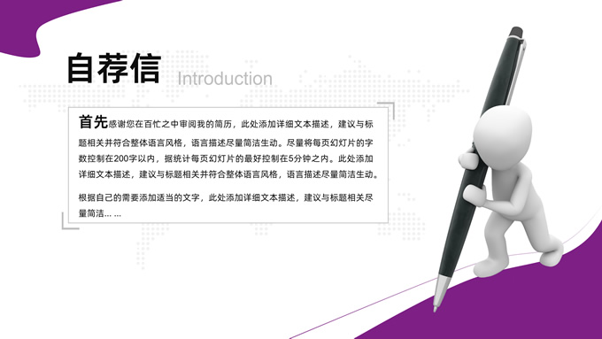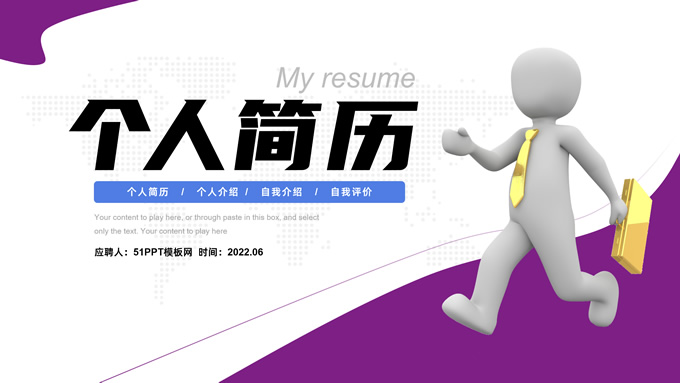 简介:3D小人创意个人简历ppt模板,本模板共12P,简历内容包括自荐信、求职意向、个人信息、工作经历、职业技能、教育背景、自我评价、个人荣誉、兴趣爱好、发展目标等,应景3D小人配图流体几何风版式内容页,适合个人简历、自荐信等场景应用。