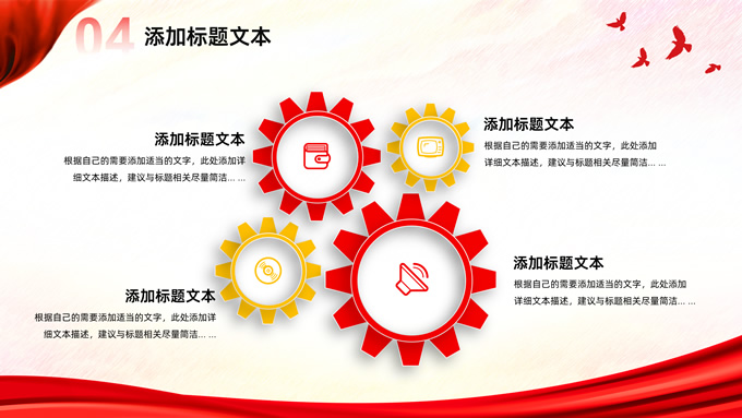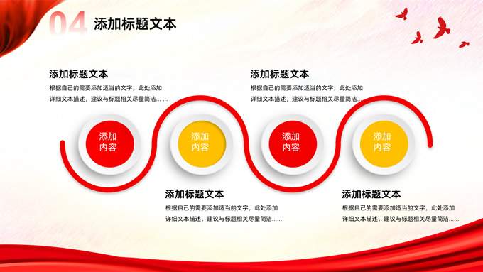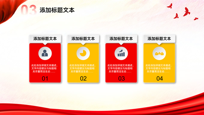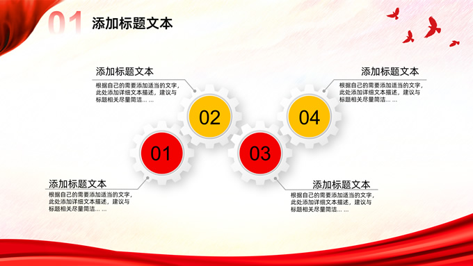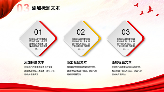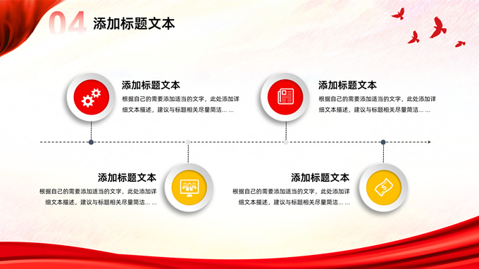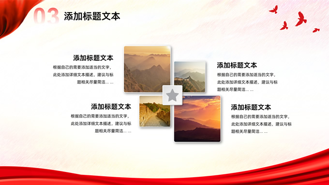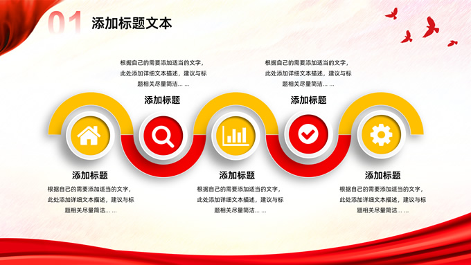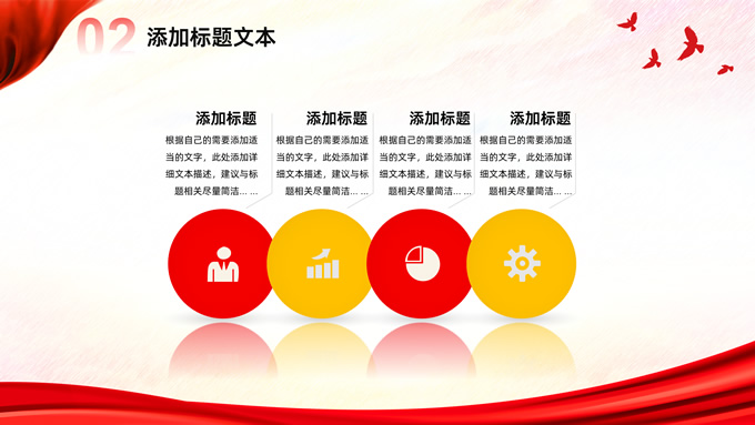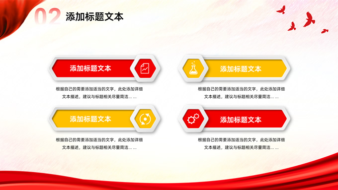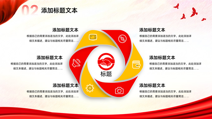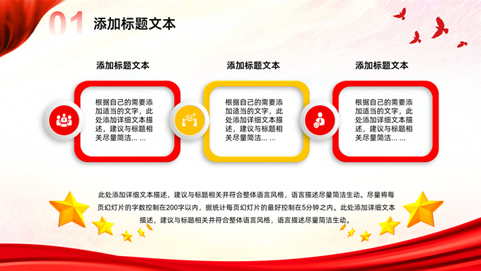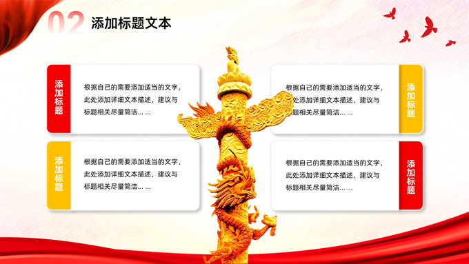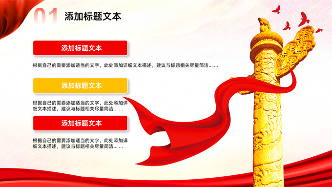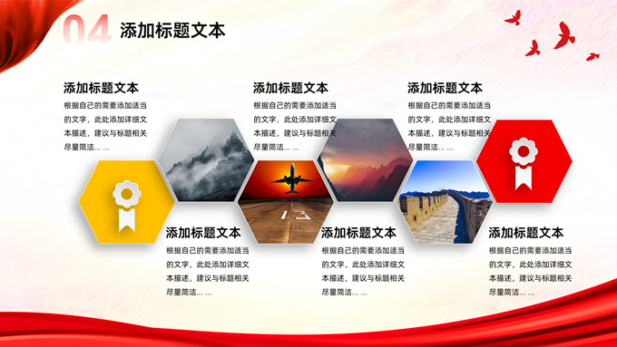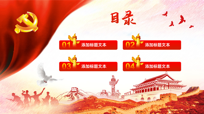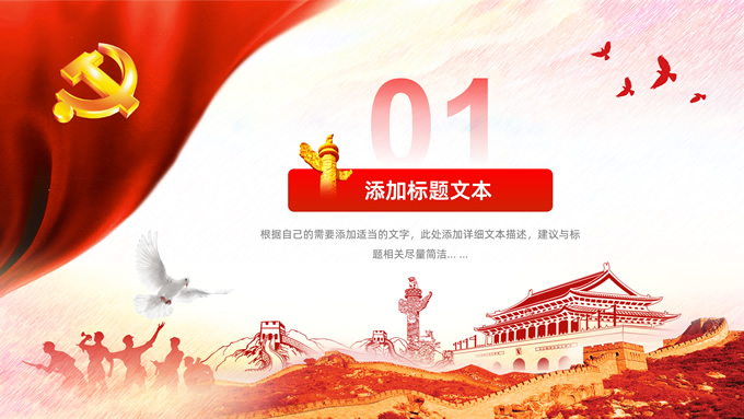 简介:伟大征程 美好与共——党建汇报通用ppt模板,本模板共23P,金色立体党徽、飘扬的旗帜、和平鸽、天安门、万里长城、军人剪影、华表元素创意字体封面、目录页、过渡页,中国红配色,微立体风格图表,党政风版式内容页,适合工作汇报、党课心得等场景应用建党节通用型ppt模板。