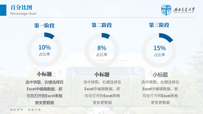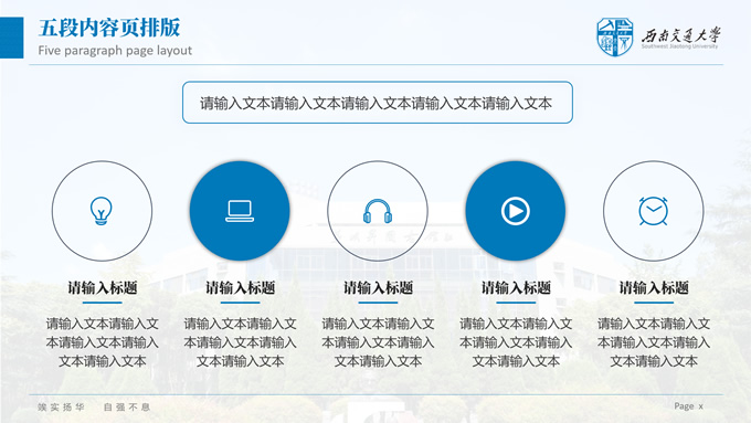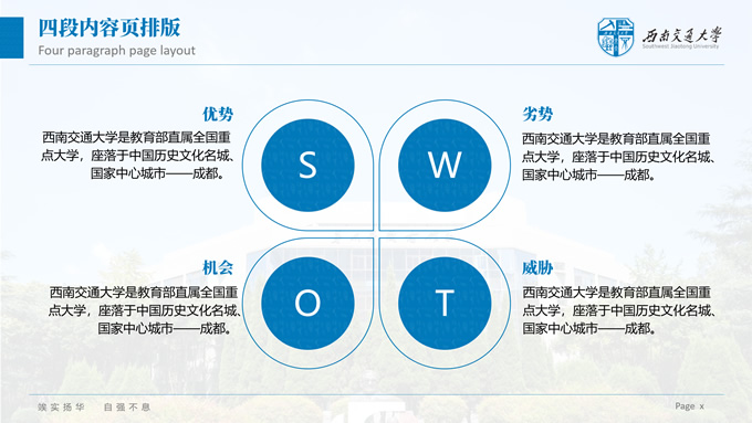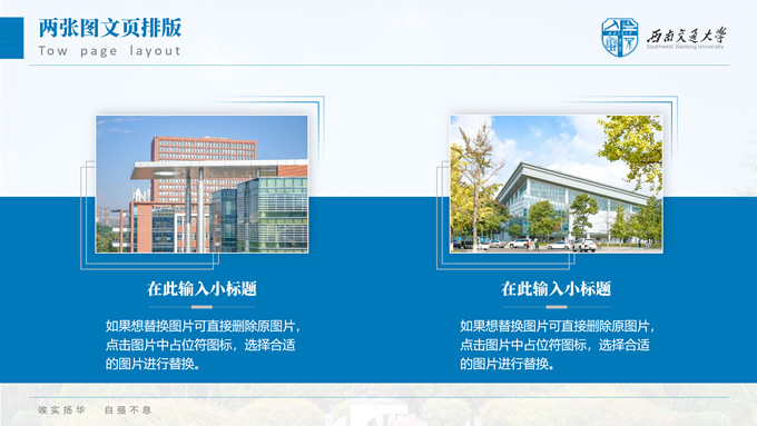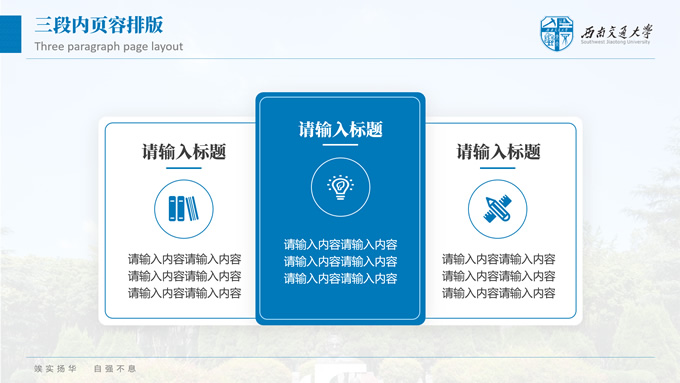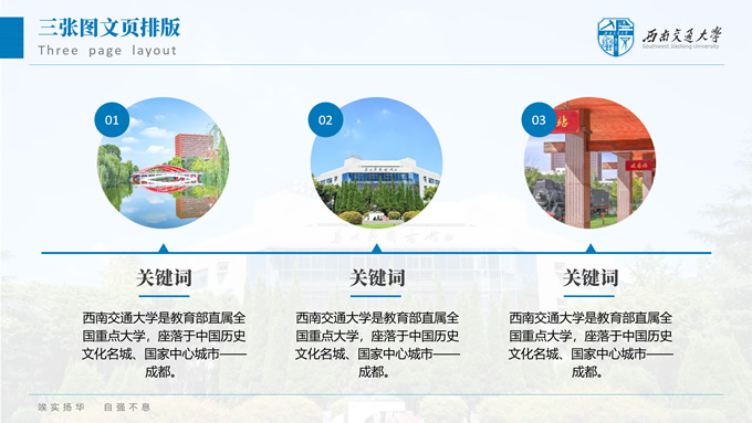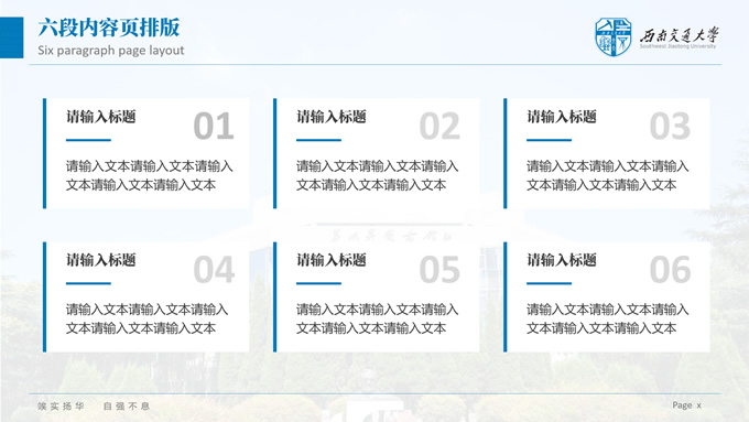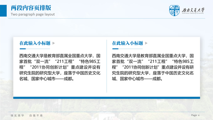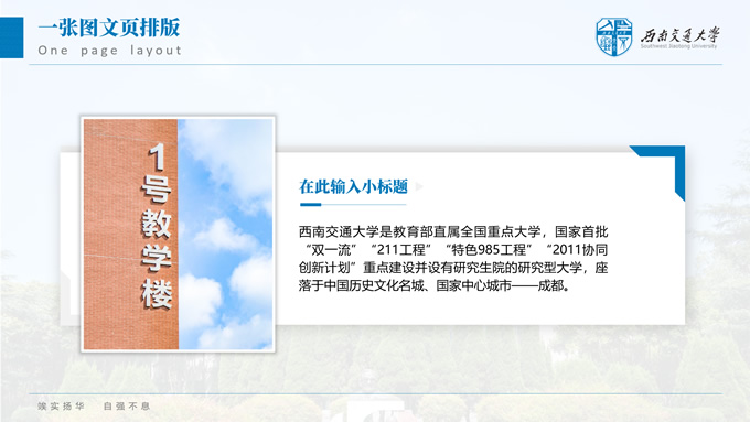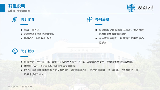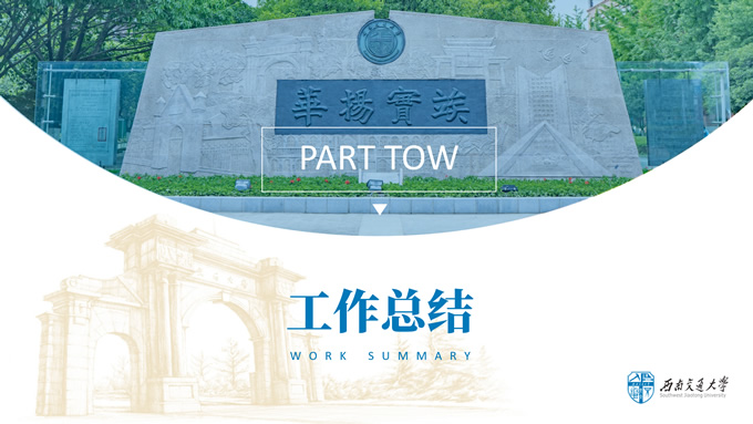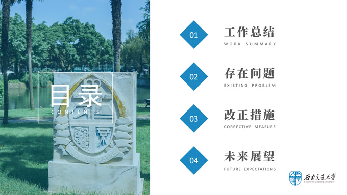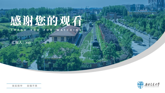 简介:清新学术风西南交通大学项目答辩ppt模板,本模板共20P,目录:项目概述、工作总结、存在问题、改正措施、未来展望,西南交大标志性校园风光主图背景,校徽、标题文字封面、几何风目录页、过渡页,经典蓝配色,简约学术风版式内容页,适合项目汇报、毕业总结、论文答辩等场景应用的西南交通大学通用型ppt模板。