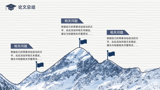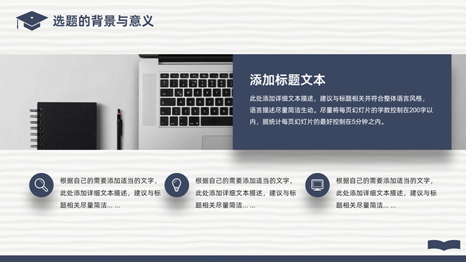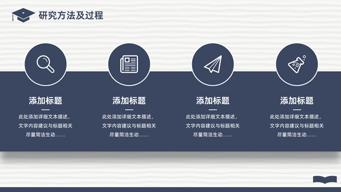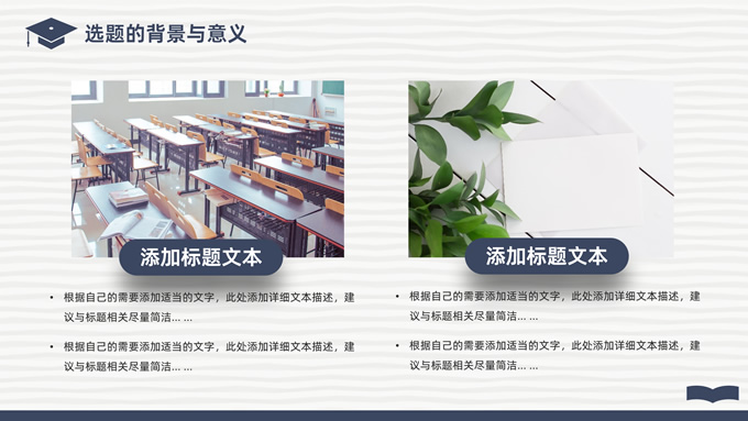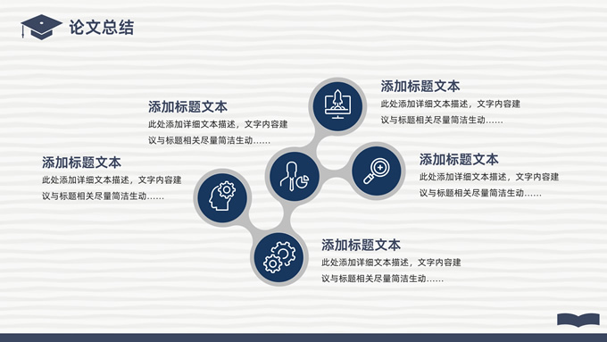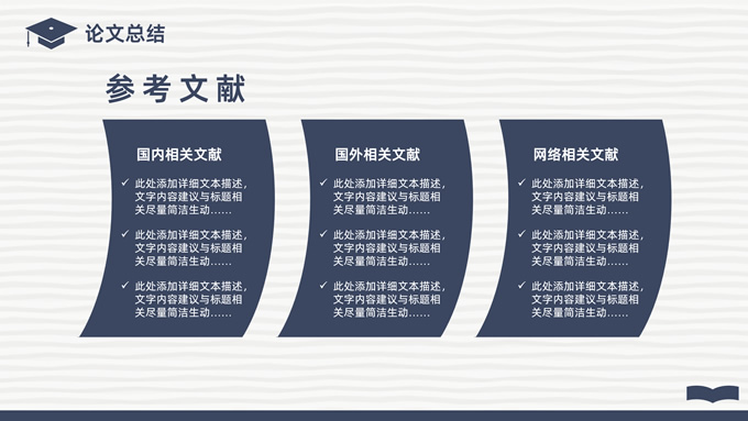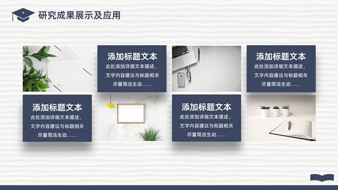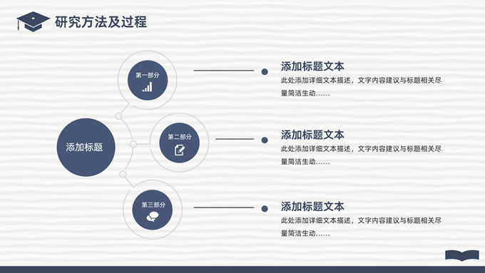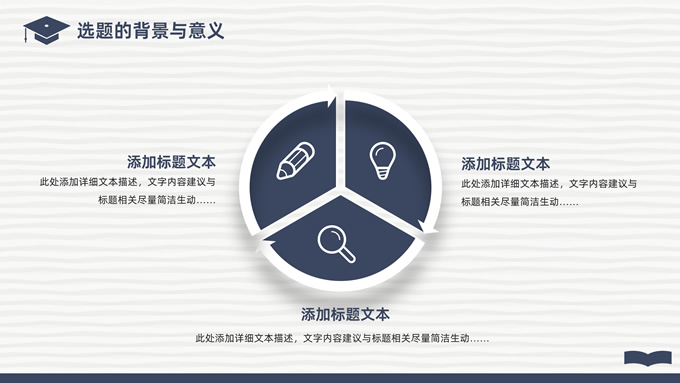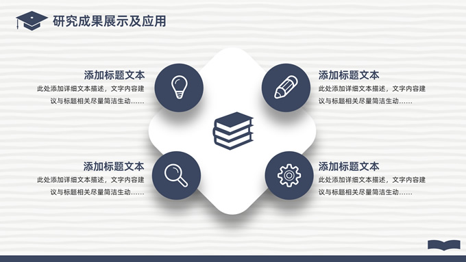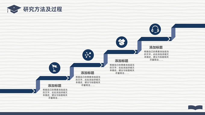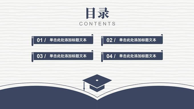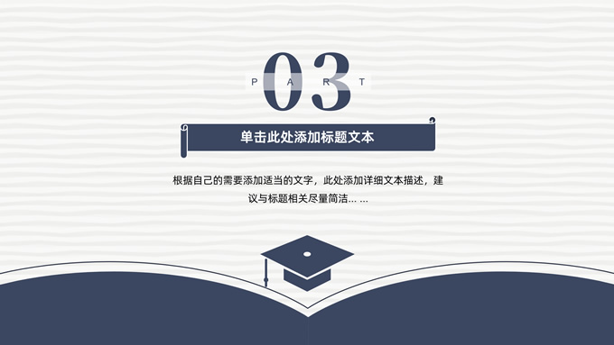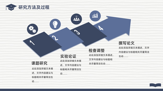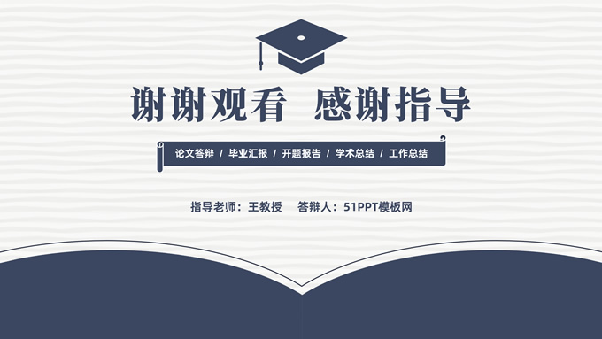 简介:简洁实用论文答辩演讲通用ppt模板,本模板共22P,淡雅灰艺术条纹背景,翻开的书本元素创意、博士帽、标题文字封面、目录页、过渡页,经典蓝配色,阴影风格图表,简约学术风版式内容页,适合论文答辩、毕业汇报、开题报告等场景应用的答辩演讲通用ppt模板。