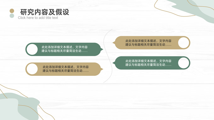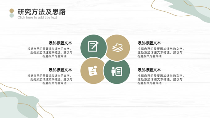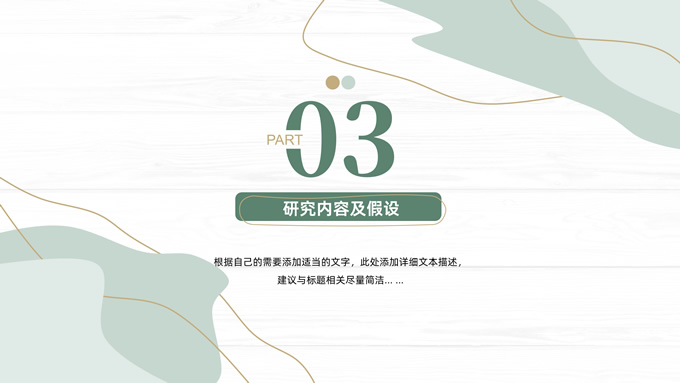 简介:莫兰迪色调流体几何毕业论文开题报告ppt模板,本模板共19P,目录:研究背景及意义、研究方法及思路、研究内容及假设、时间安排规划,淡雅灰木纹木板背景,流体几何图形线条艺术创意标题文字封面、目录页、过渡页,莫兰迪色系配色,扁平化图表,简约艺术风版式内容页,适合论文答辩、毕业汇报、开题报告等场景应用的答辩总结通用ppt模板。