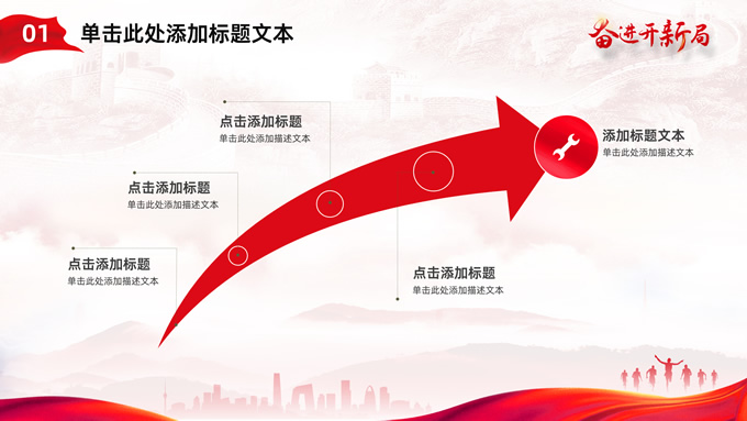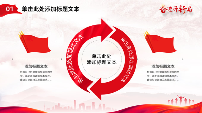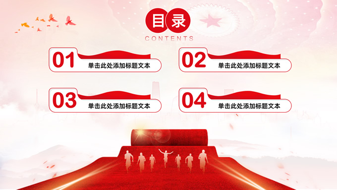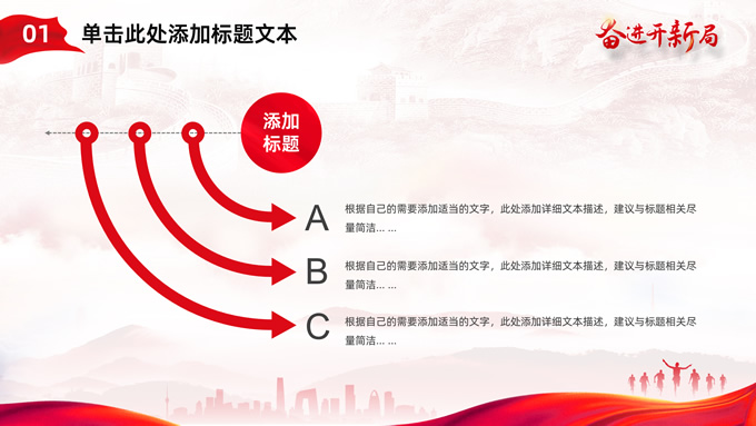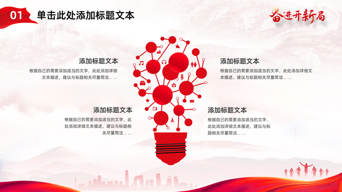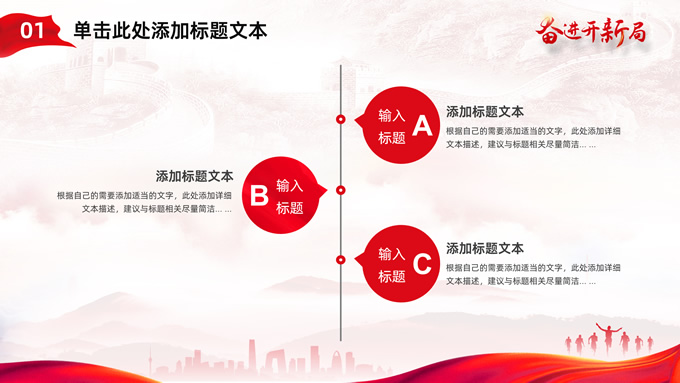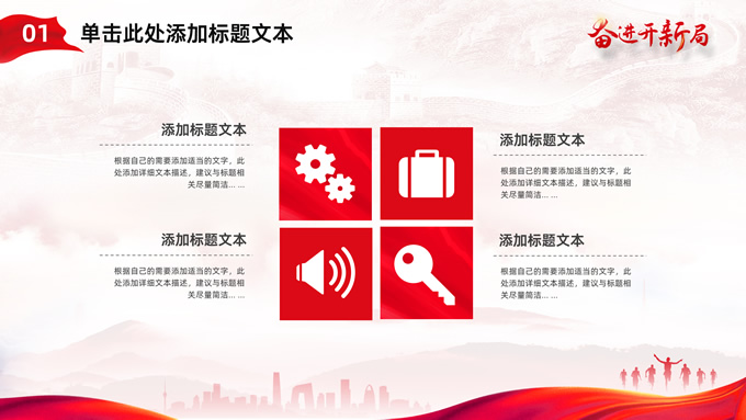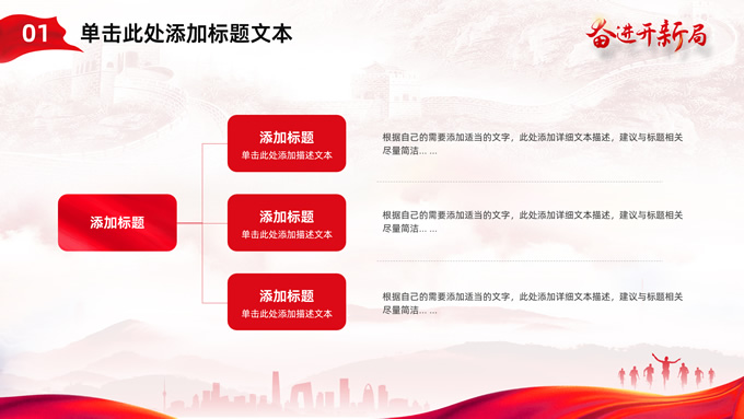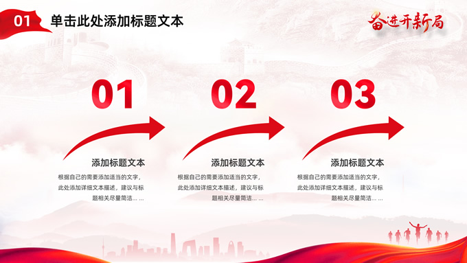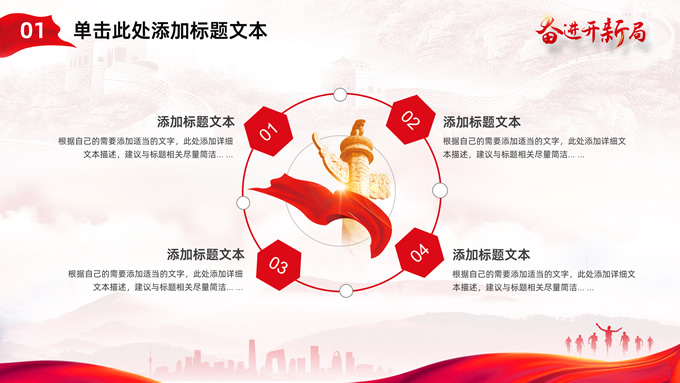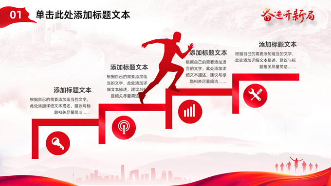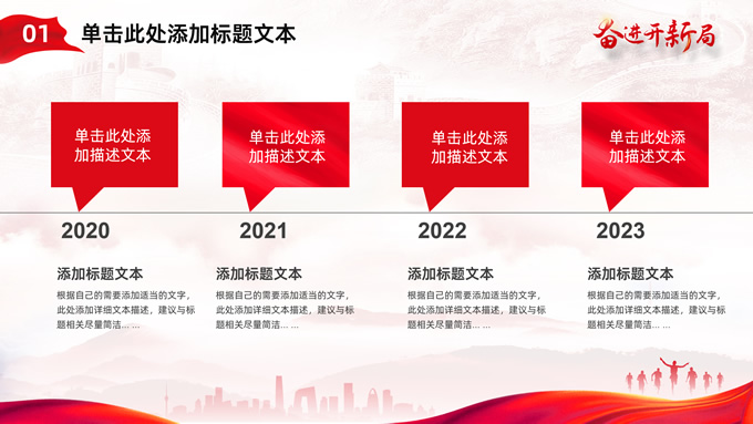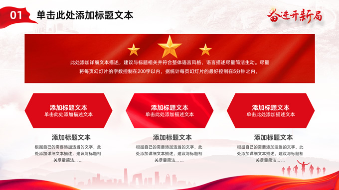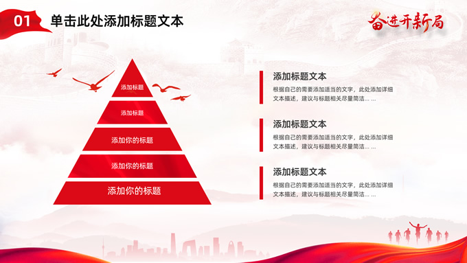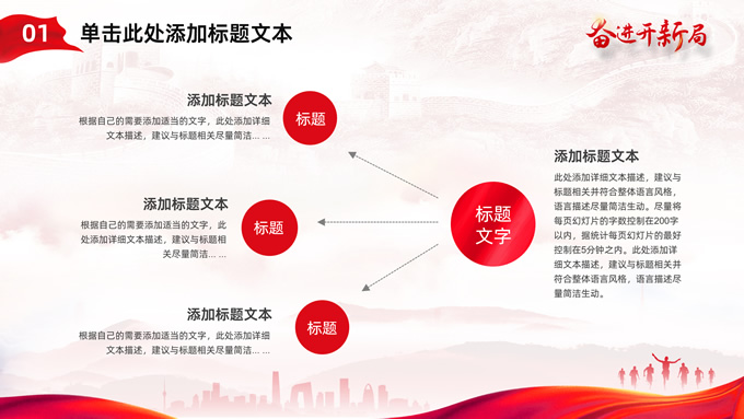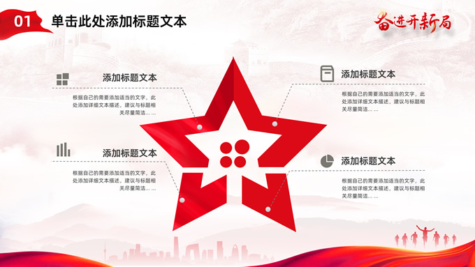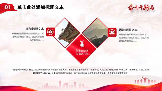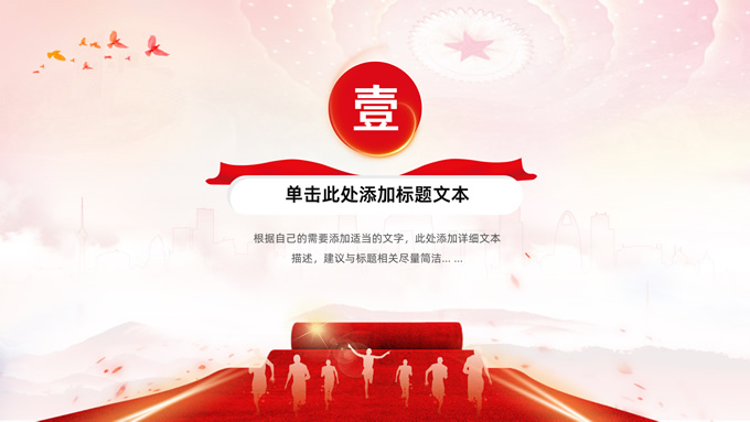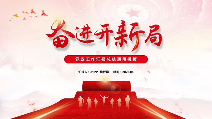 简介:奋进开新局——党政工作总结汇报通用ppt模板,本模板共25P,线条高楼、水墨山川、人民大会堂顶灯背景,和平鸽、红地毯、光芒、赛跑的运动员剪影毛笔字标题文字封面、目录页、过渡页,中国红配色,简约大气版式内容页,适合党政工作汇报、工作总结、党课课件、心得体会等场景应用的党建通用ppt模板。