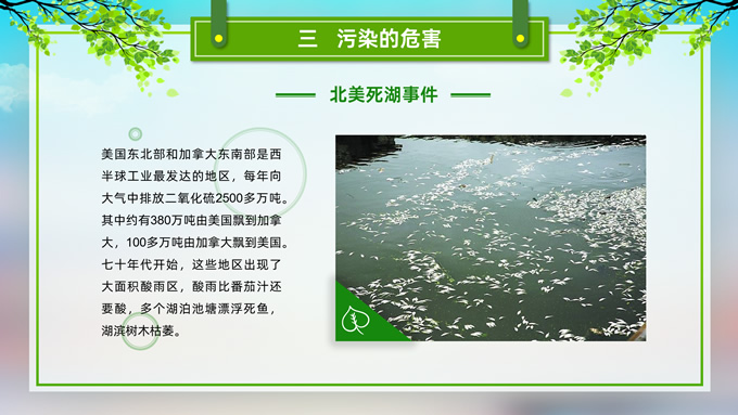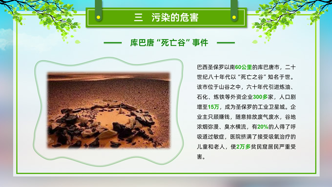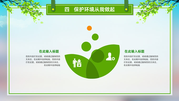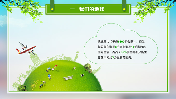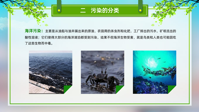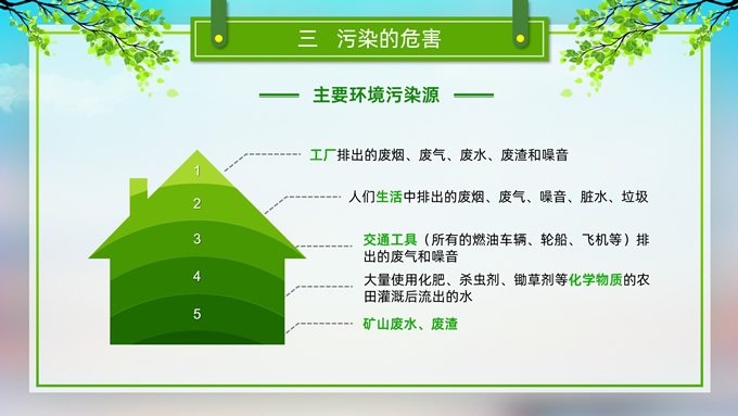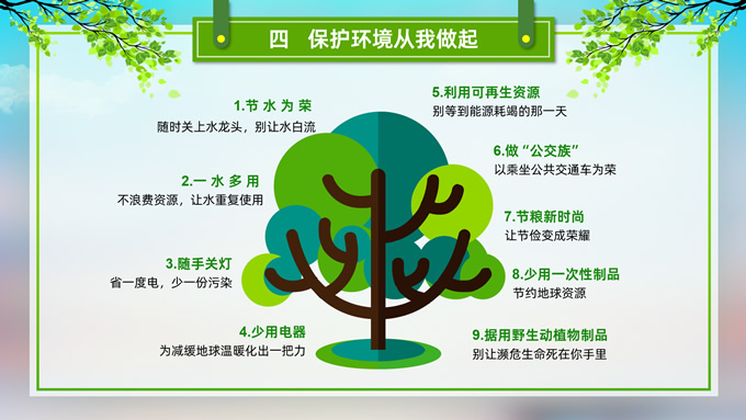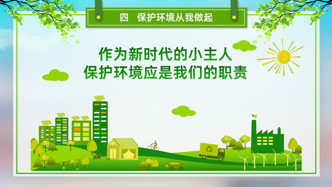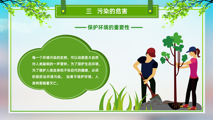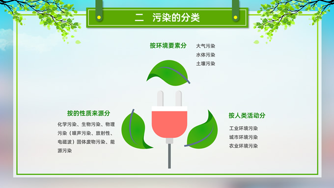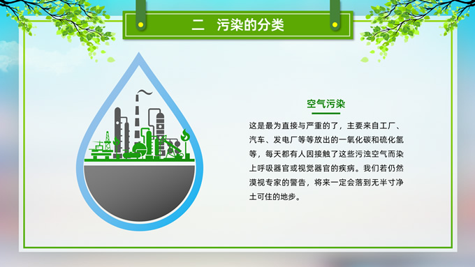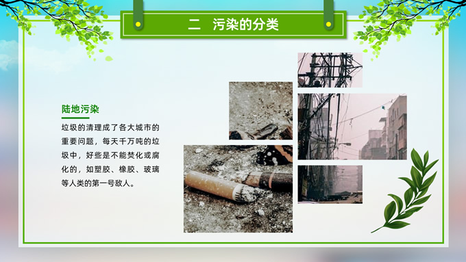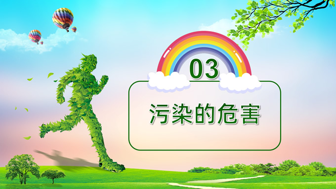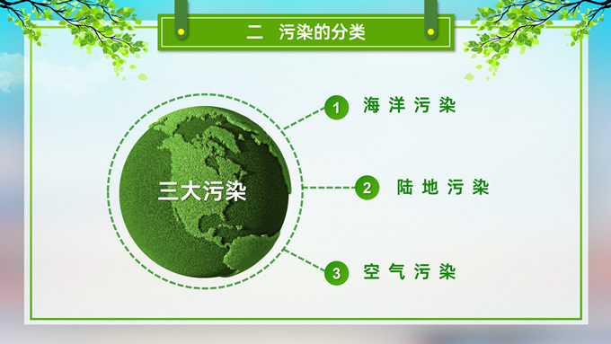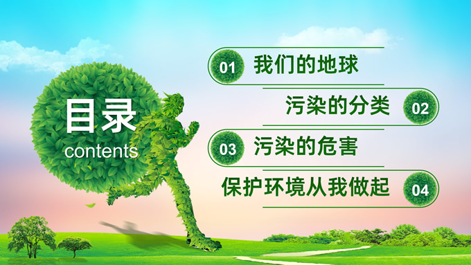 简介:环境污染与环境保护公益知识宣讲ppt模板,本模板共21P,目录:我们的地球、污染的分类、污染的危害、保护环境从我做起,草地、彩虹、树木、绿叶自行车、人物剪影标题文字创意封面、目录页、过渡页,环保绿配色,完整内容框架简约版式内容页,适合环保知识宣讲、环保公益活动等场景应用的环保主题ppt模板。