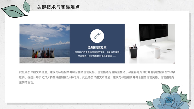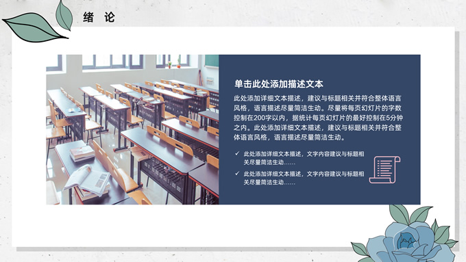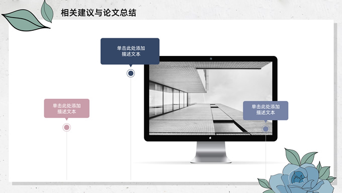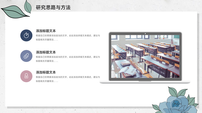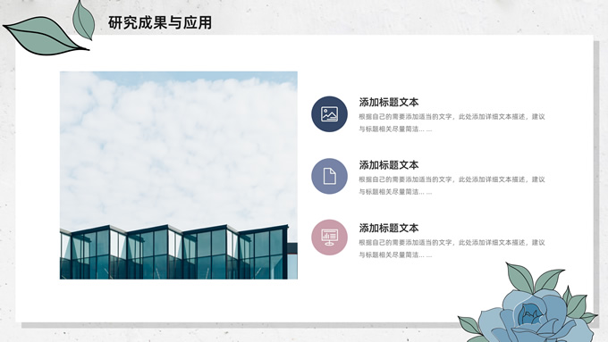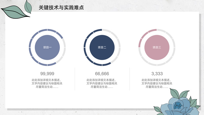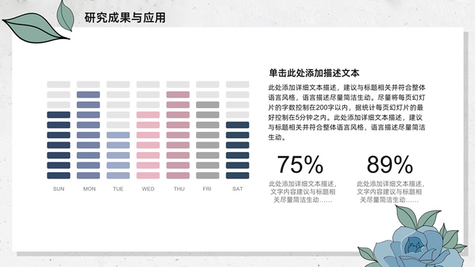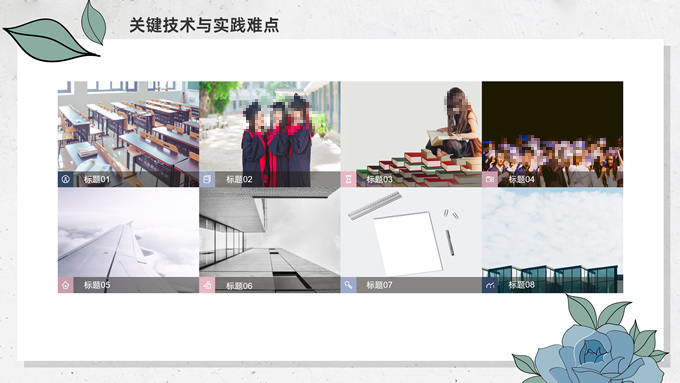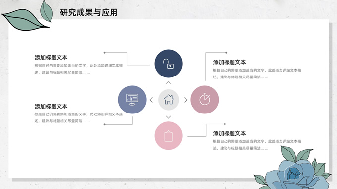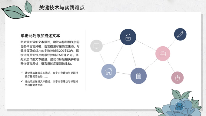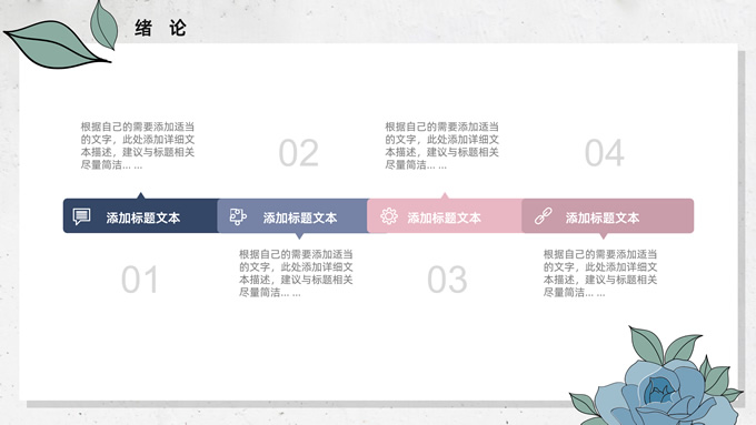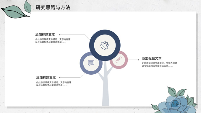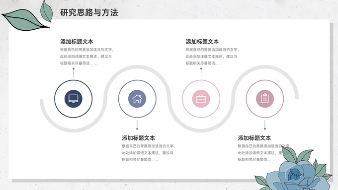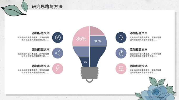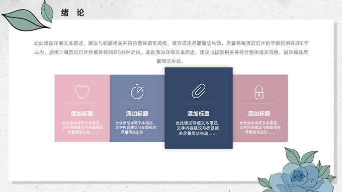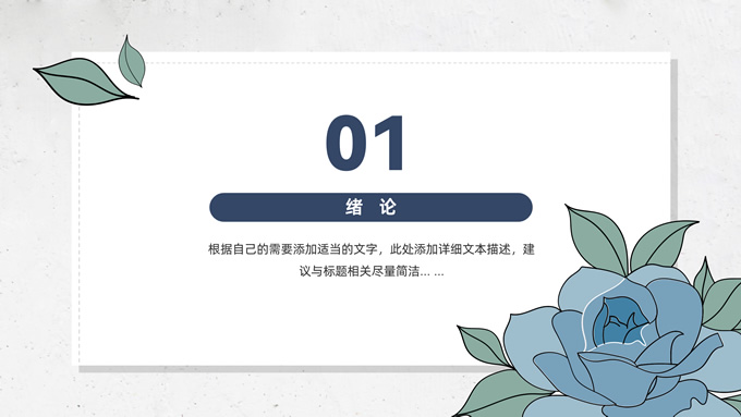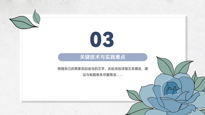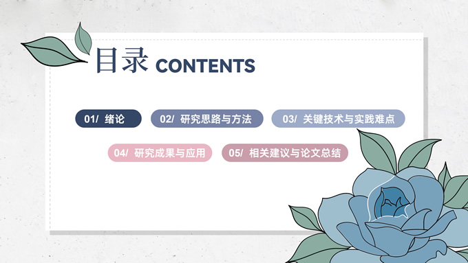 简介:矢量花朵叶子简约清新毕业答辩ppt模板,本模板共27P,目录:绪论、研究思路与方法、关键技术与实践难点、研究成果与应用、相关建议与论文总结,淡雅灰怀旧纸张背景,矢量花朵叶子悬浮框标题文字封面、目录页、过渡页,蓝紫配色,扁平化图表,极简约清新版式内容页,适合论文答辩、毕业答辩等场景应用的答辩通用型ppt模板。