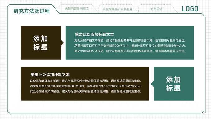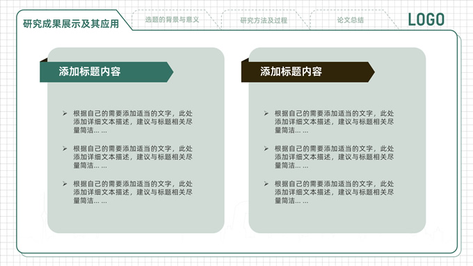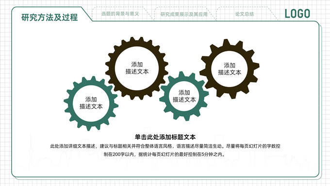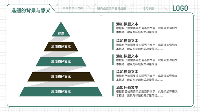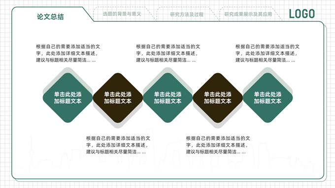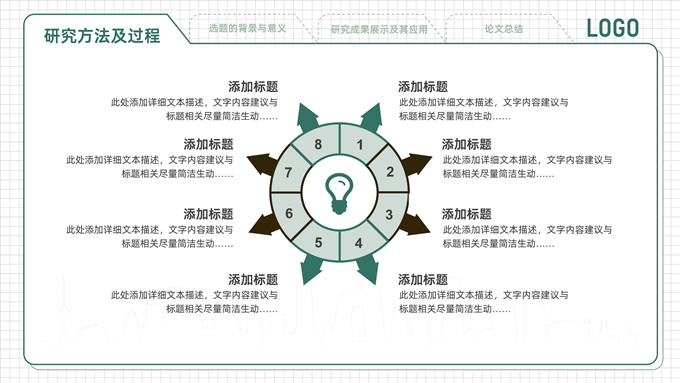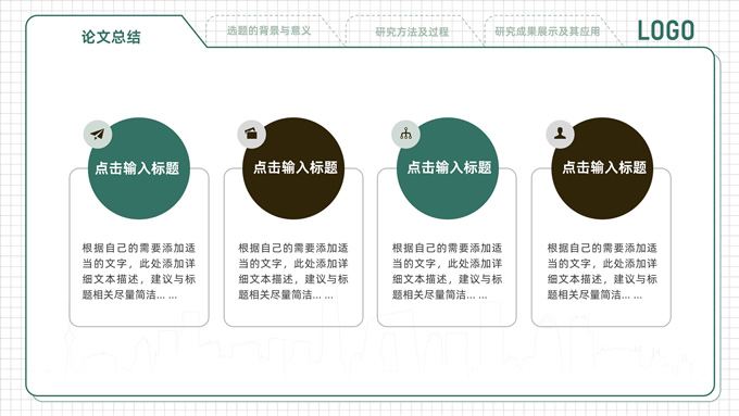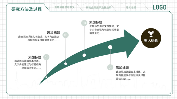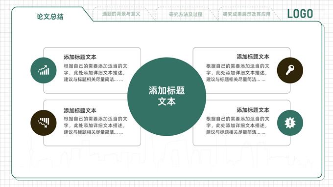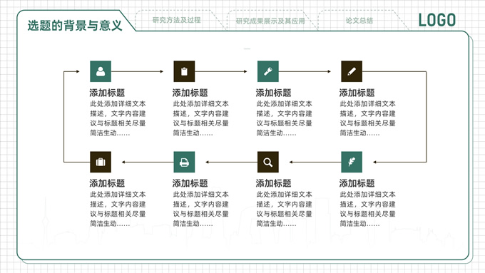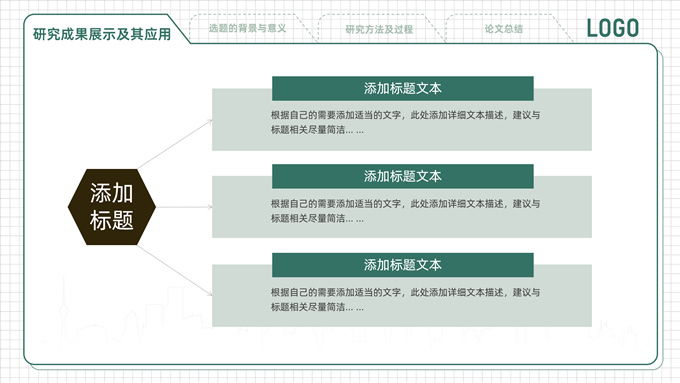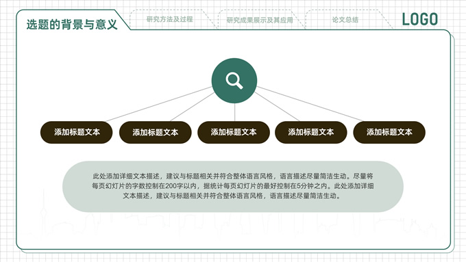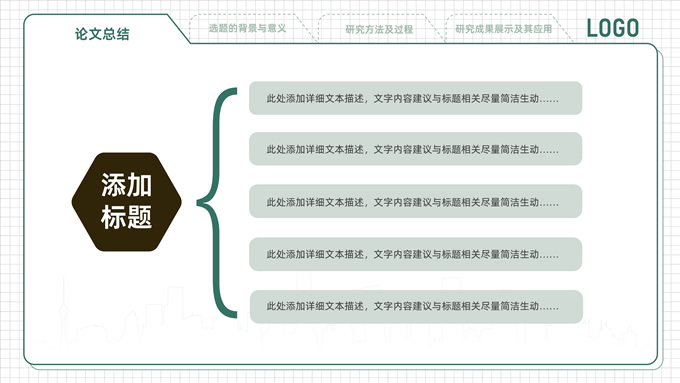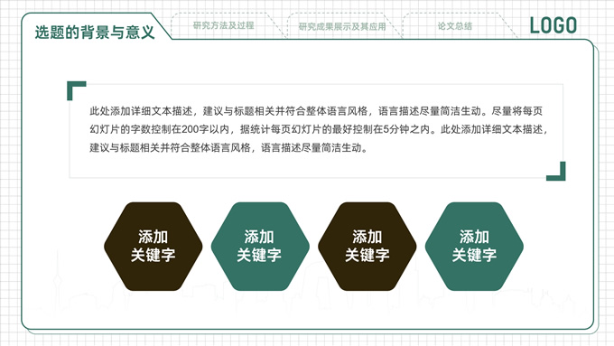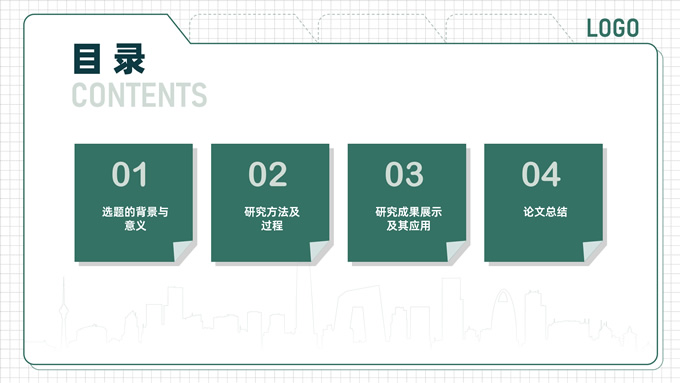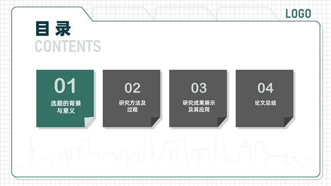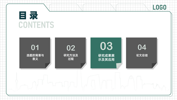 简介:极简扁平毕业论文答辩通用ppt模板,本模板共23P,目录:选题的背景与意义、研究方法及过程、研究成果展示及应用、论文总结,淡雅灰方格子背景,线条城市、便签、电脑文件夹创意标题文字封面、目录页、过渡页,绿灰配色,扁平化图表,极简约学术风版式内容页,适合论文答辩、毕业汇报、开题报告、学术总结、工作汇报等场景应用的答辩通用ppt模板。