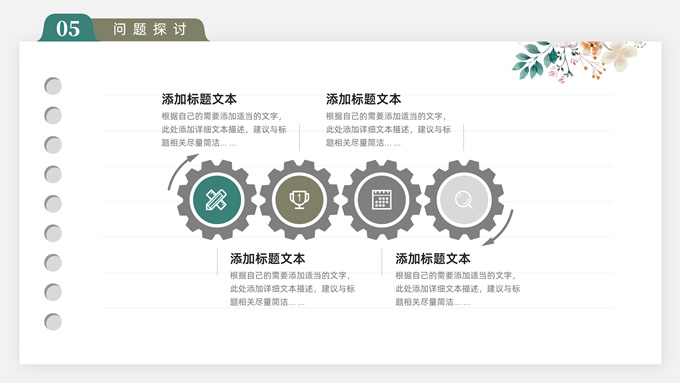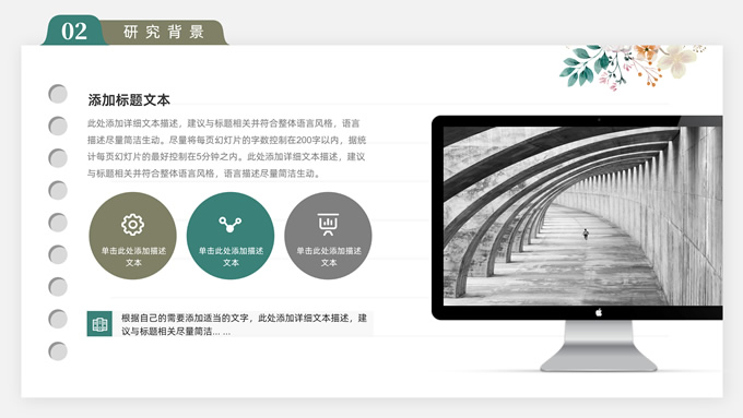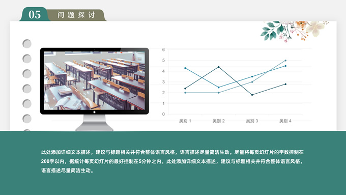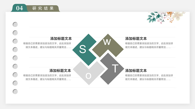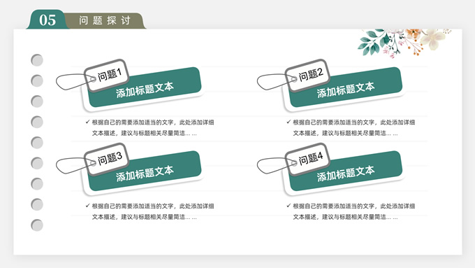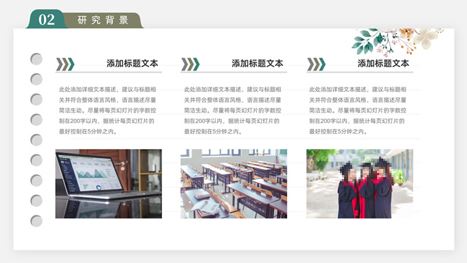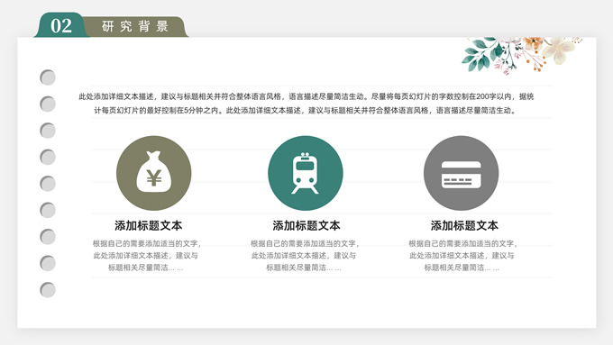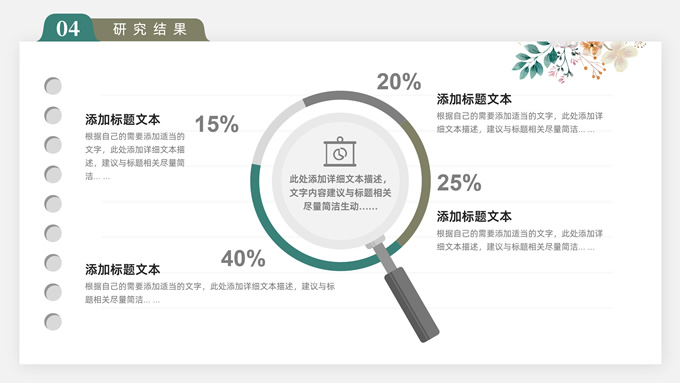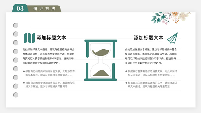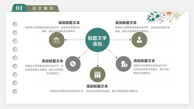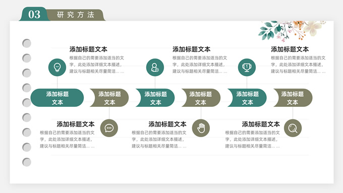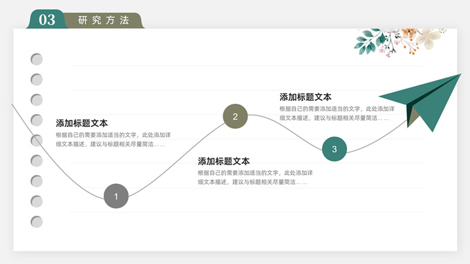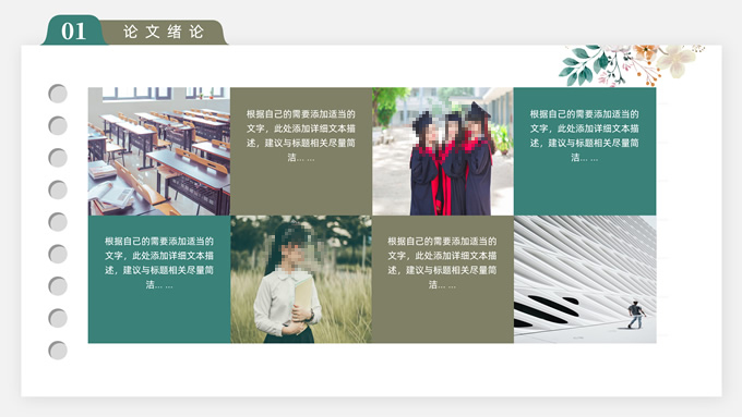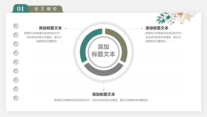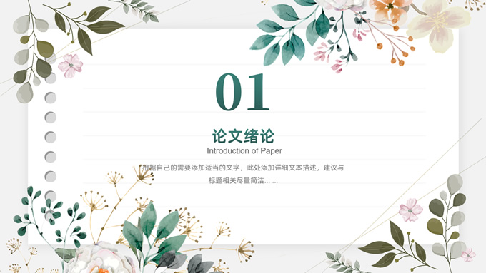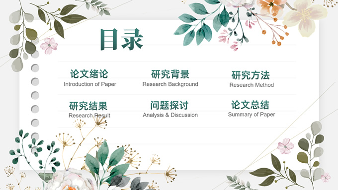 简介:水彩植物花卉文艺清新论文答辩ppt模板,本模板共28P,目录:论文绪论、研究背景、研究方法、研究结果、问题讨论、论文总结,记事本横格背景,水彩枝丫藤叶主图标题文字封面、目录页、过渡页,绿灰清新风配色,扁平化图表,简约文艺风版式内容页,适合论文答辩、毕业汇报等场景应用的答辩通用ppt模板。