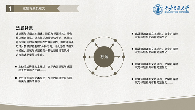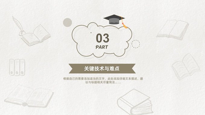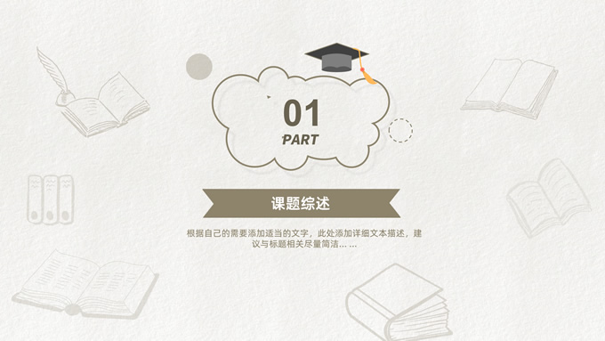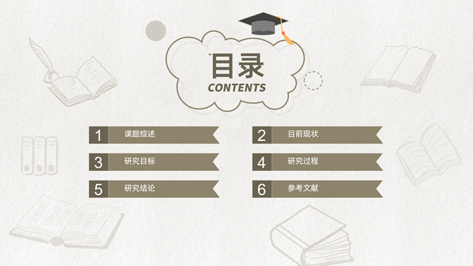 简介:精美卡通毕业设计论文答辩通用ppt模板,本模板共29P,目录:课题综述、目前现状、研究目标、研究过程、研究结论、参考文献,纸张质感背景,卡通书籍、博士帽、钢笔、云朵文本框标题文字简约封面、目录页、过渡页,黎色配色,扁平化图表,简约实用完整框架内容页,适合毕业设计、论文答辩、学术汇报等场景应用的答辩通用型ppt模板。