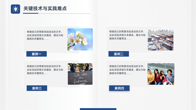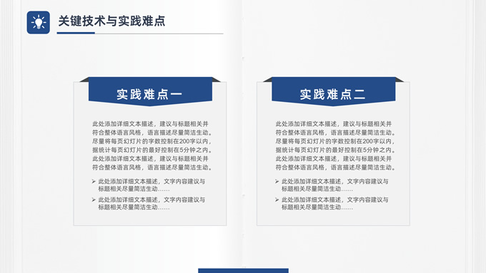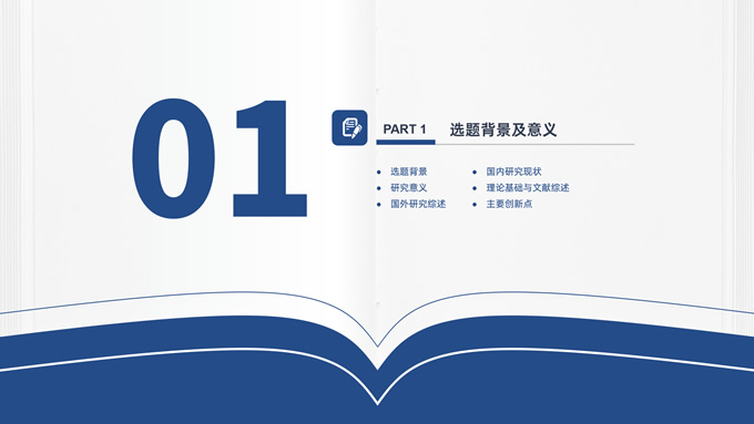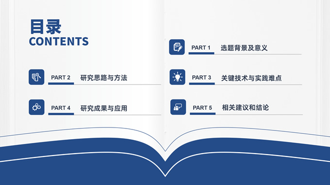 简介:翻开的书学术蓝简约实用毕业答辩开题报告ppt模板,本模板共32P,目录:选题背景及意义、研究思路与方法、关键技术与实践难点、研究成果与应用、相关建议和结论,翻开的空白书本背景,翻开的书本元素极简约标题文字封面、目录页、过渡页,学术蓝配色,扁平化图表,简约实用学术风版式内容页,适合论文答辩、毕业汇报、开题报告等场景应用的应届生答辩总结通用型ppt模板。