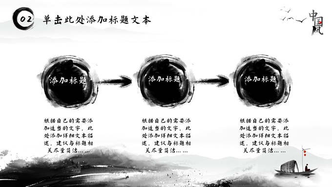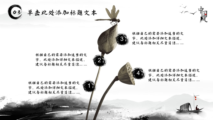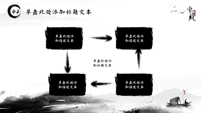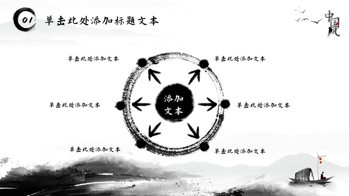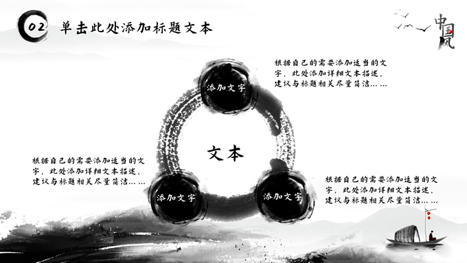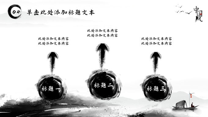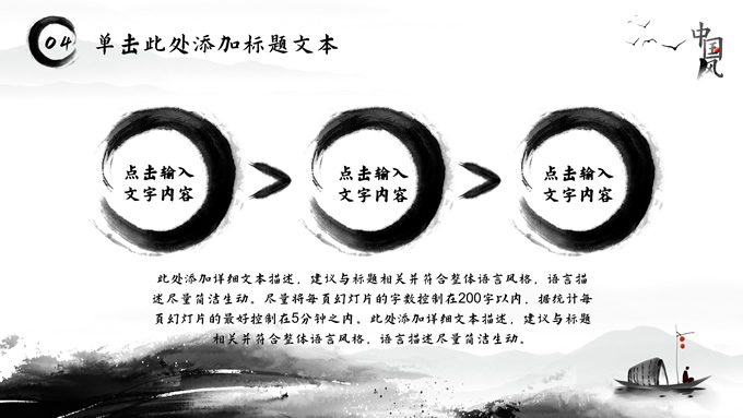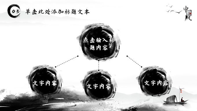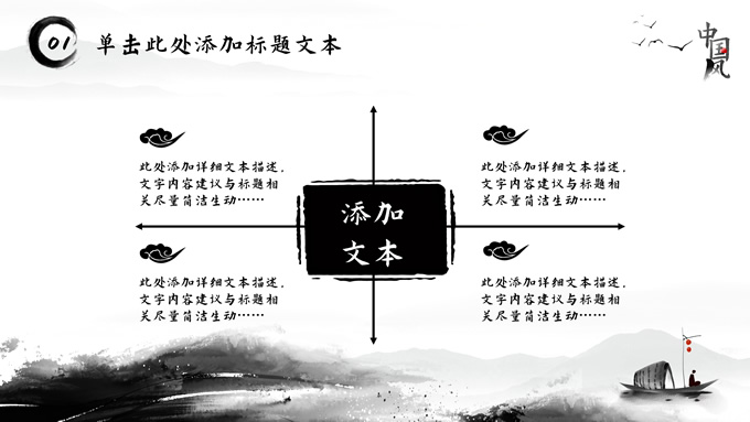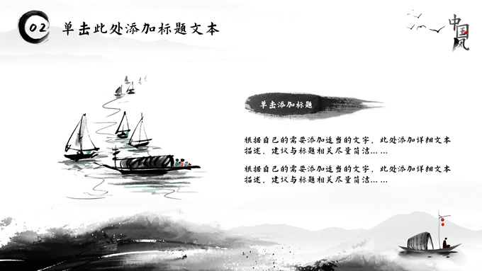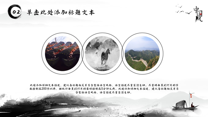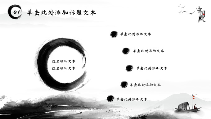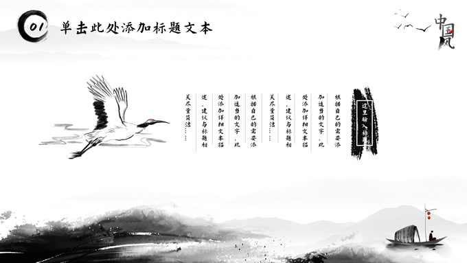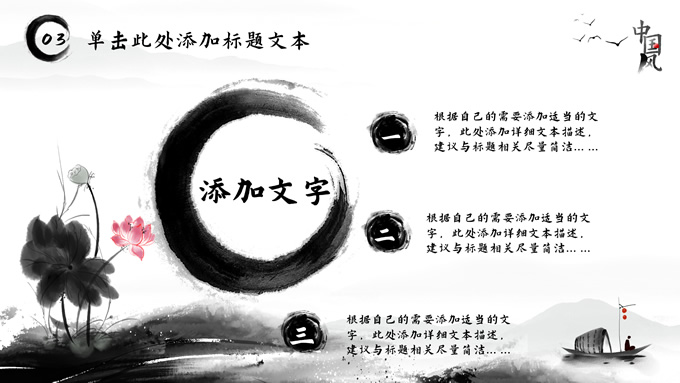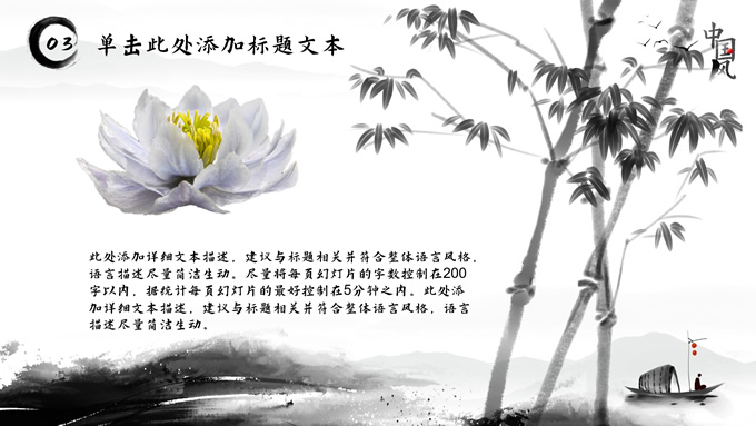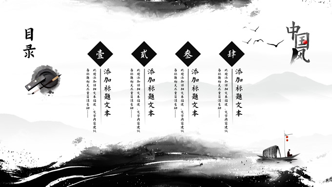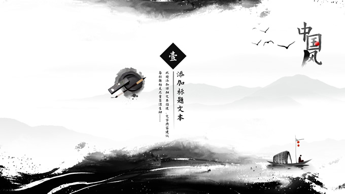 简介:简约水墨中国风工作总结报告ppt模板,本模板共25P,淡雅水墨山川背景,水墨元素、大雁、老翁垂钓、笔墨、中国风创意字体封面、目录页、过渡页,黑灰配色,水墨风格图表,莲花、竹、仙鹤、舟等素材配图简约中国风版式内容页,适合工作总结、工作汇报等场景应用的中国风主题ppt模板。
