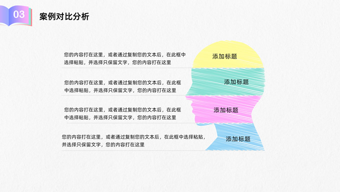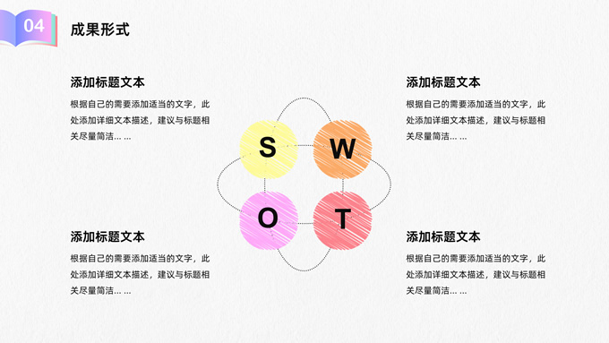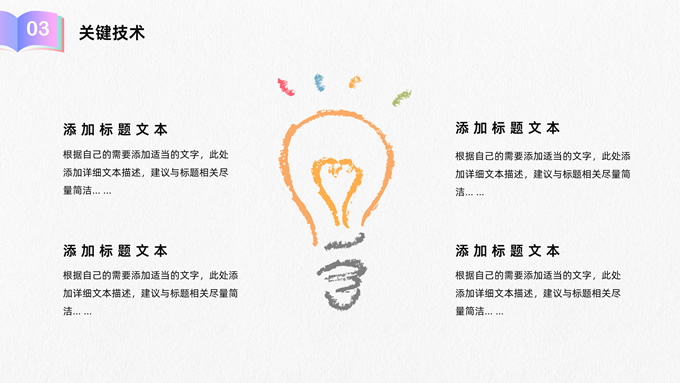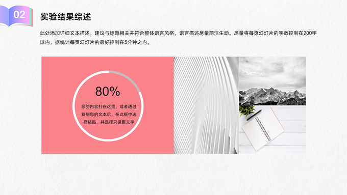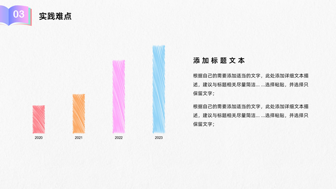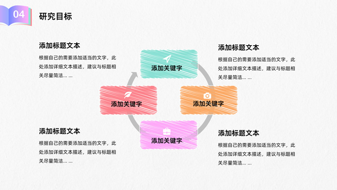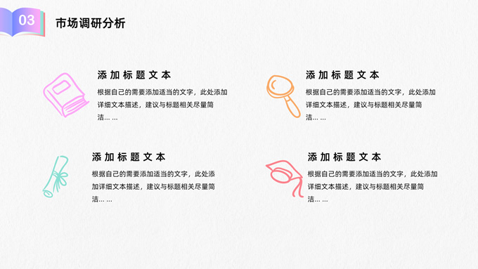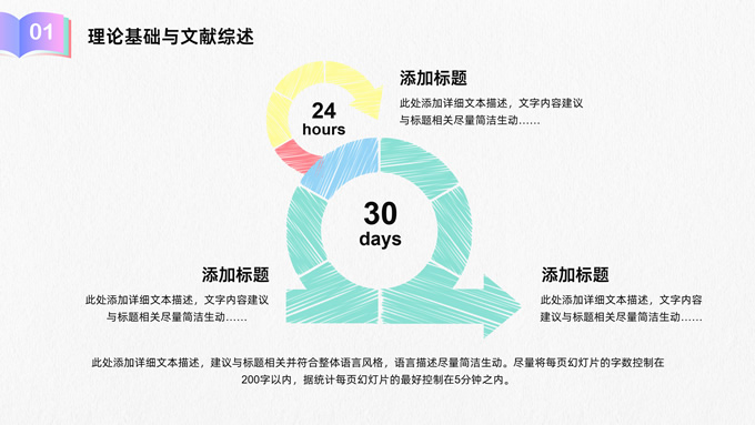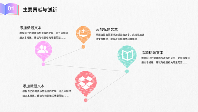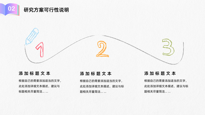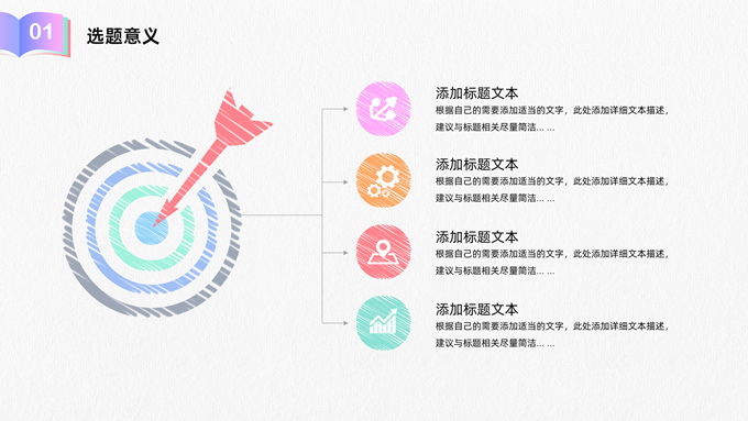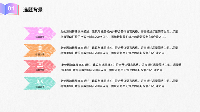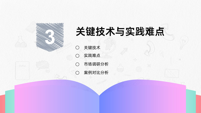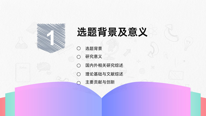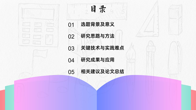 简介:简约实用毕业论文答辩开题报告通用ppt模板,本模板共30P,目录:选题背景及意义、研究思路与方法、关键技术与实践难点、研究成果与应用、相关建议及论文总结,糙纸纹理背景,手绘教育学习图标、翻开的书籍、矢量卡通毕业生元素标题文字创意封面、目录页、过渡页,多彩配色,扁平化图表,适合论文答辩、毕业设计、学术报告、开题报告等场景应用的通用型ppt模板。