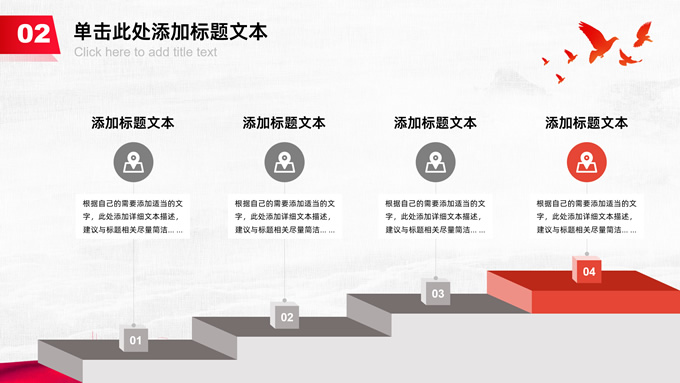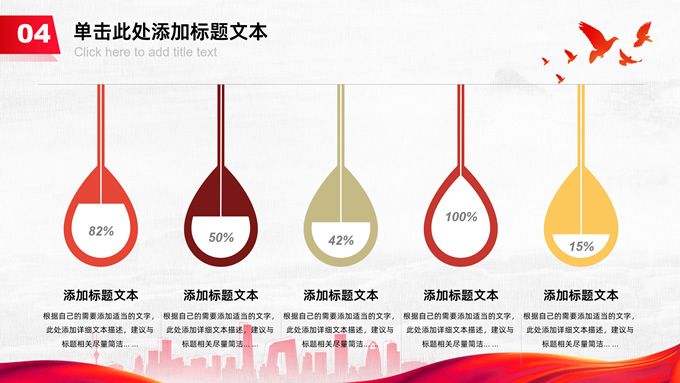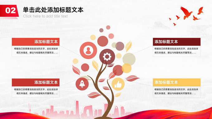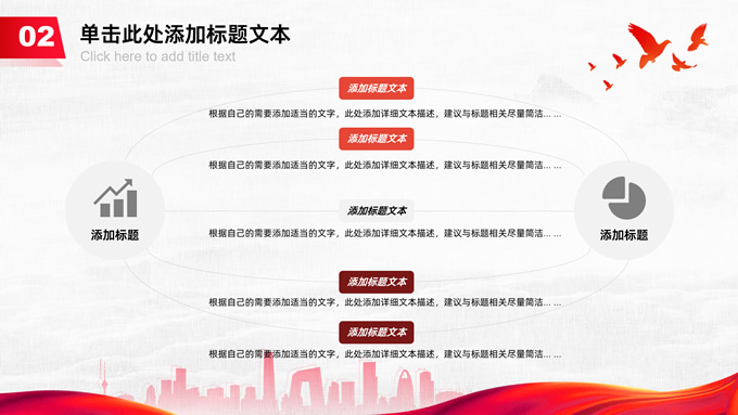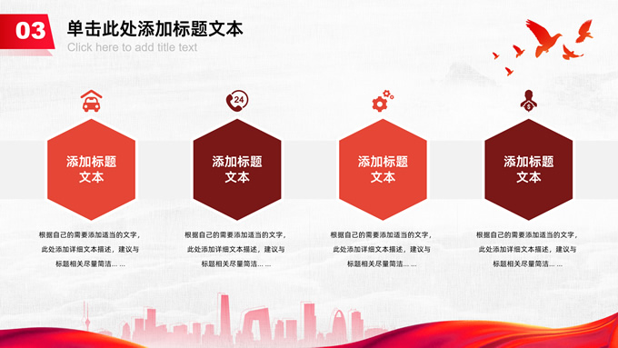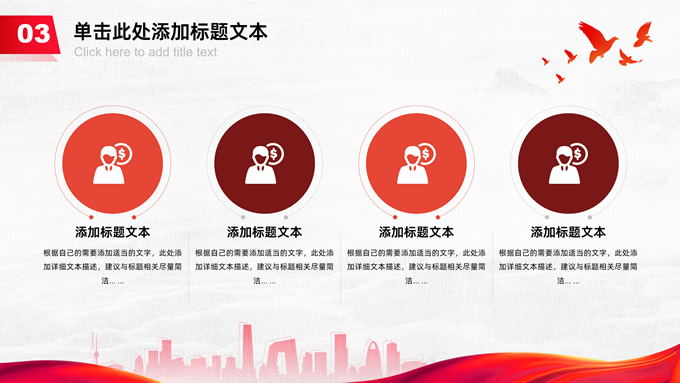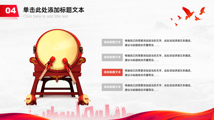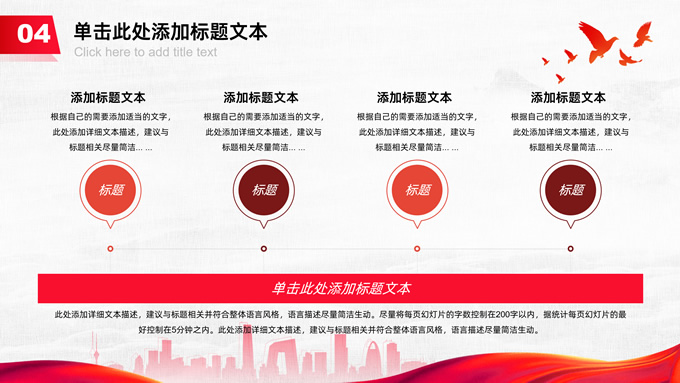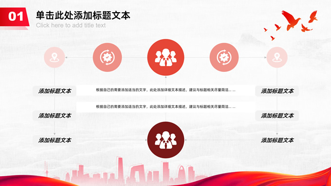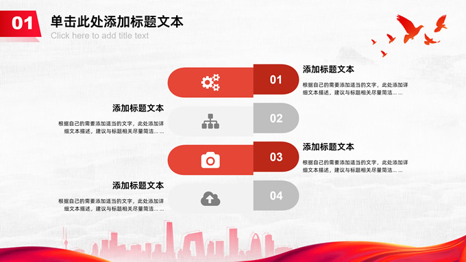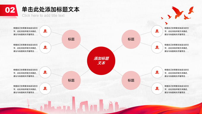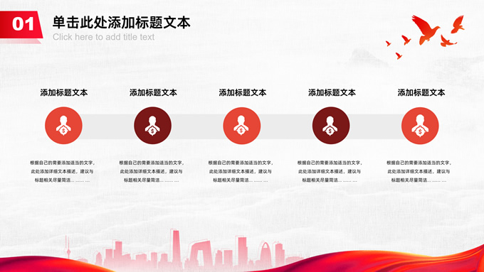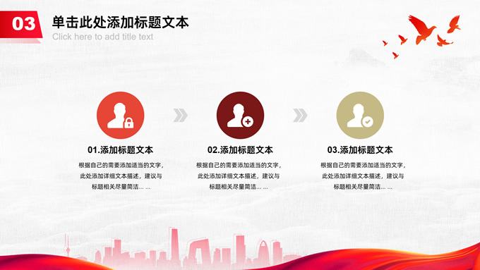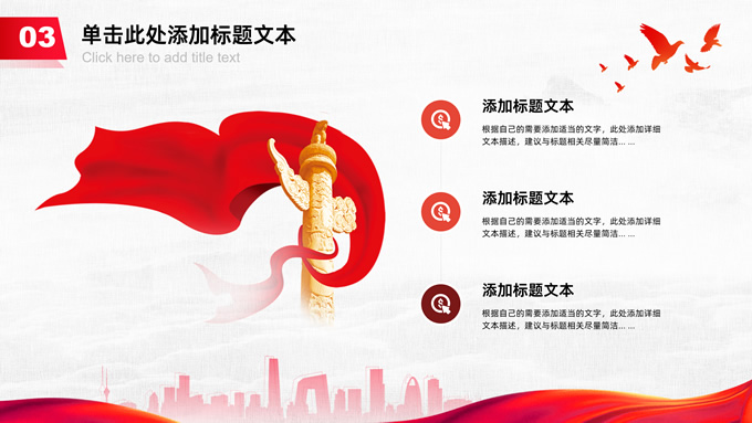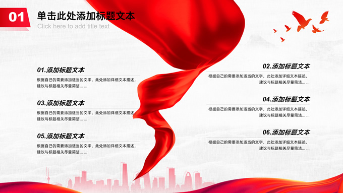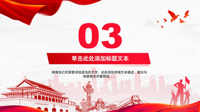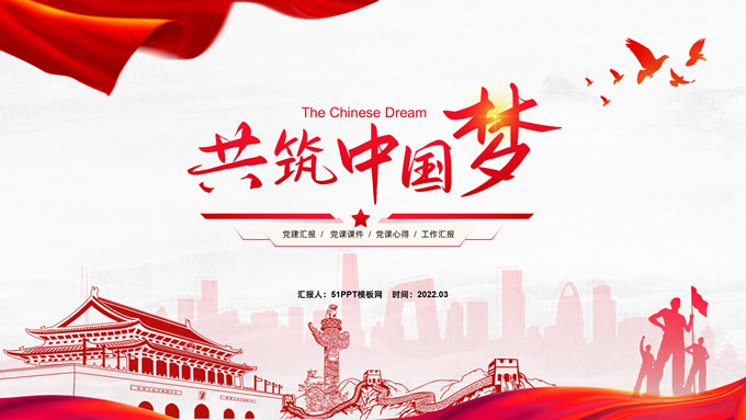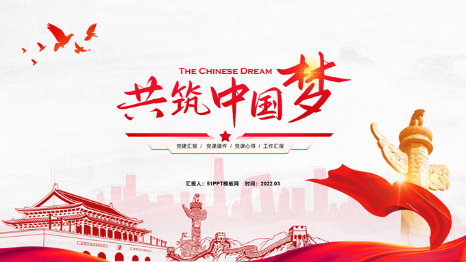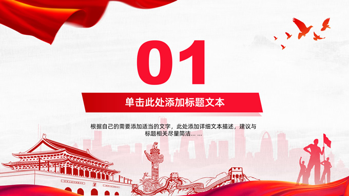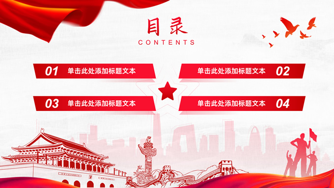 简介:共筑中国梦——极简大气党政风工作汇报通用ppt模板,本模板共25P,淡雅灰布纹纹理背景,天安门、华表、万里长城、旗帜、和平鸽、城市人物剪影元素创意封面、目录页、过渡页,中国红配色,简洁大气党政风版式内容页,适合工作汇报、党建汇报、党课课件、党课心得等场景应用的党建工作通用ppt模板。