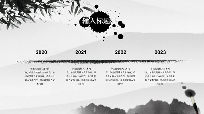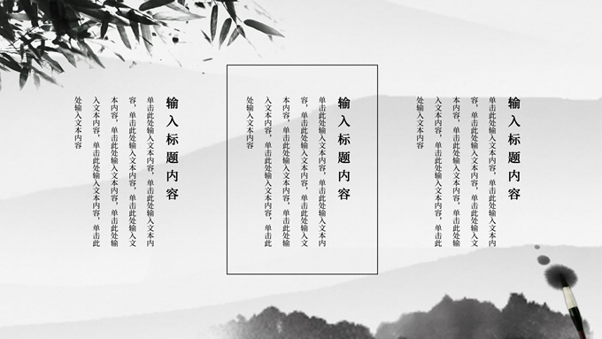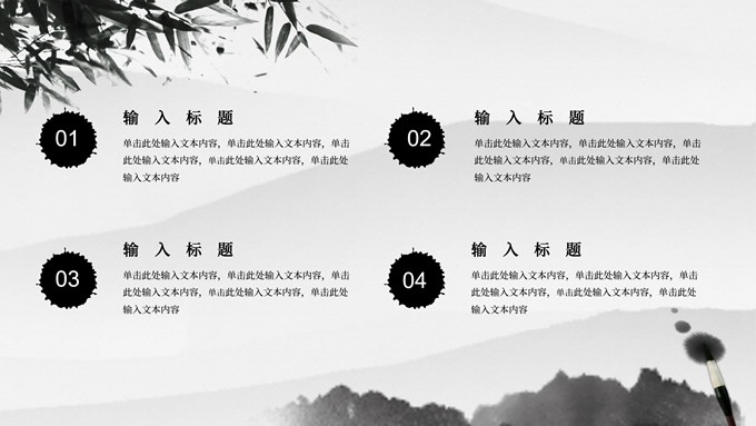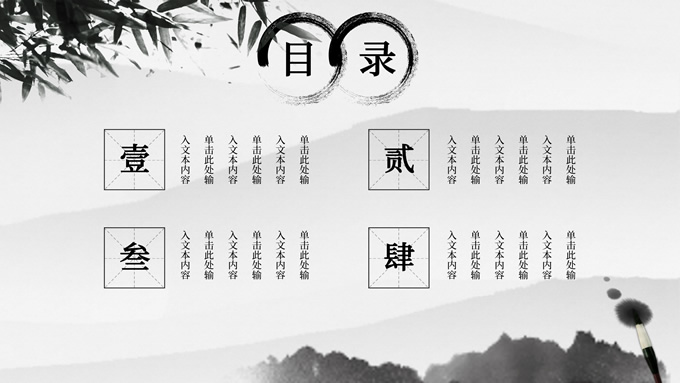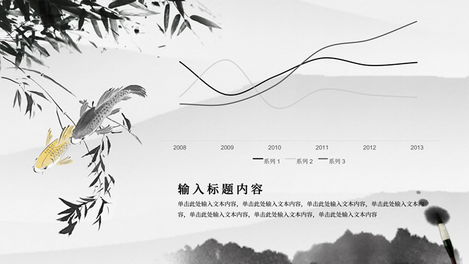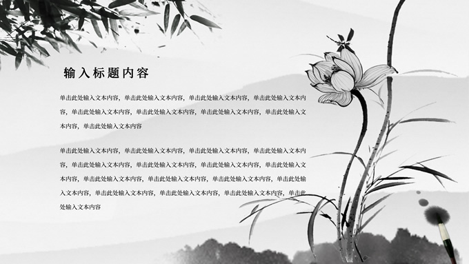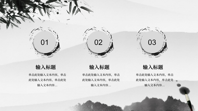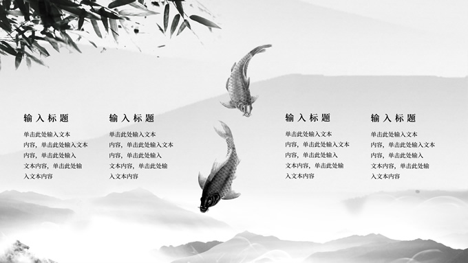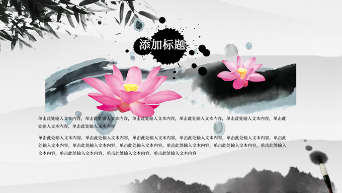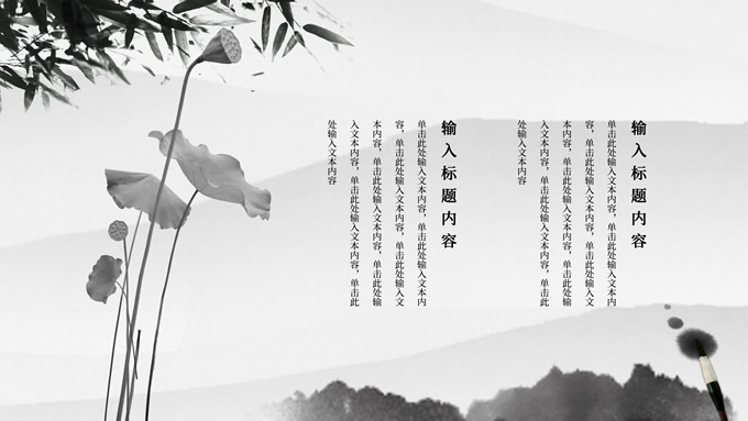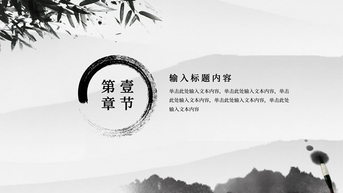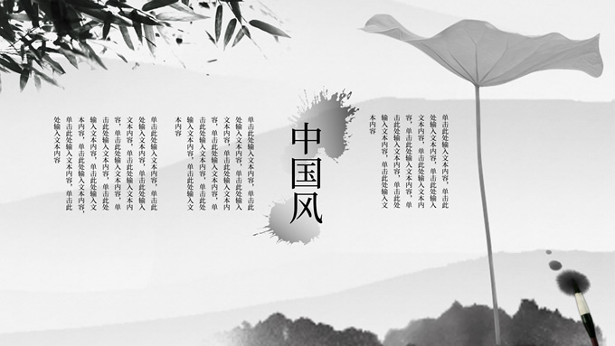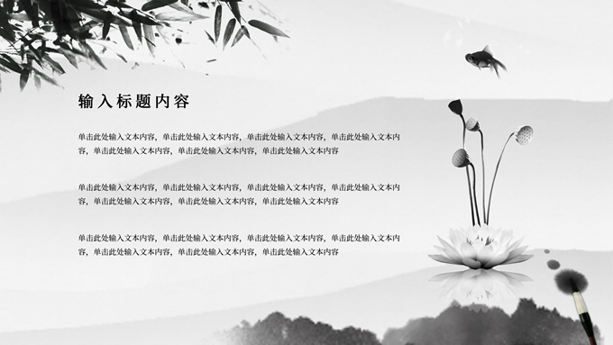 简介:极简水墨中国风工作总结报告通用ppt模板,本模板共19P,淡雅水墨山川背景,水墨墨点、墨圈、竹叶、毛笔、渔翁泛舟等中国风元素创意封面、目录页、过渡页,莲叶、莲子、莲花、金鱼等素材配图极简约中国风版式内容页,适合工作总结、工作汇报、工作计划等场景应用的水墨中国风主题ppt模板。