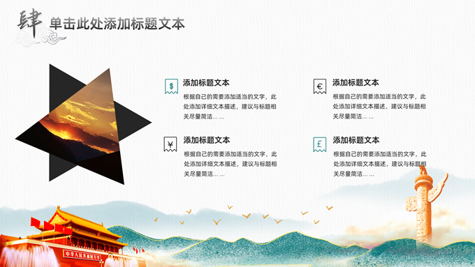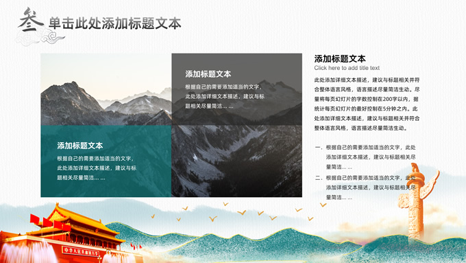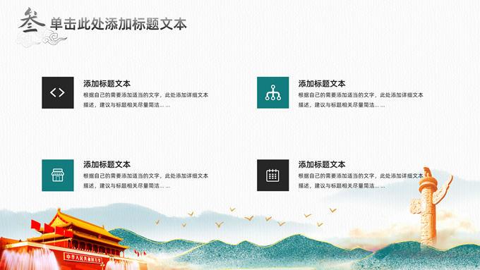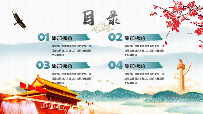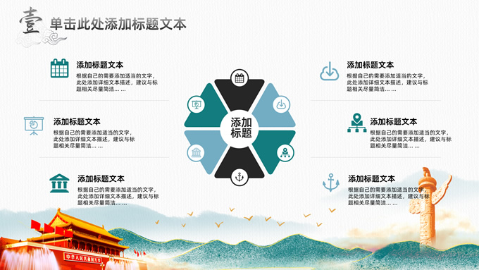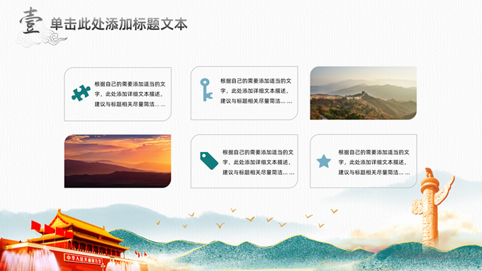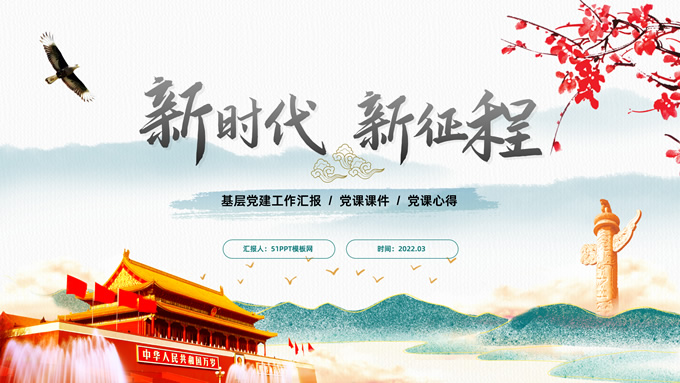 简介:简洁国潮风基层党建工作汇报通用ppt模板,本模板共25P,淡雅灰凹凸纹理条纹背景,腊梅、水墨山川、雄鹰、华表、天安门、新时代 新征程毛笔字体创意封面,刷迹中国风元素目录页、过渡页,墨绿清新风配色,扁平化图表,简约大气国潮风版式内容页,适合党建工作汇报、党课课件、党课心得等场景应用的党建通用型ppt模板。