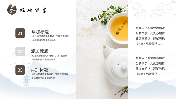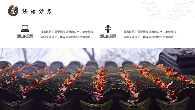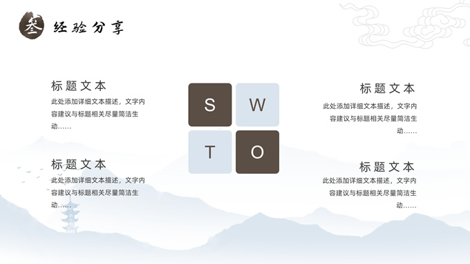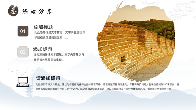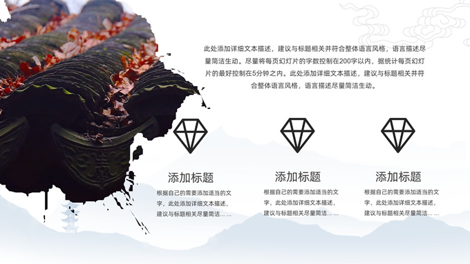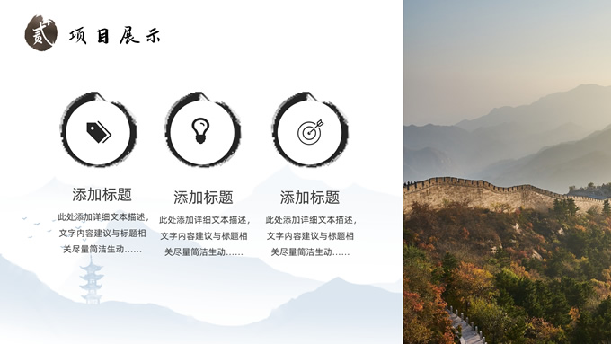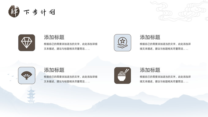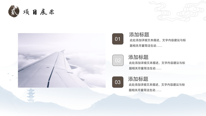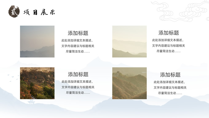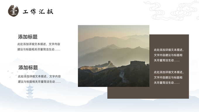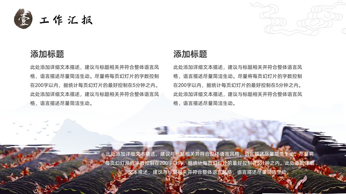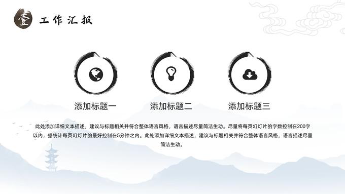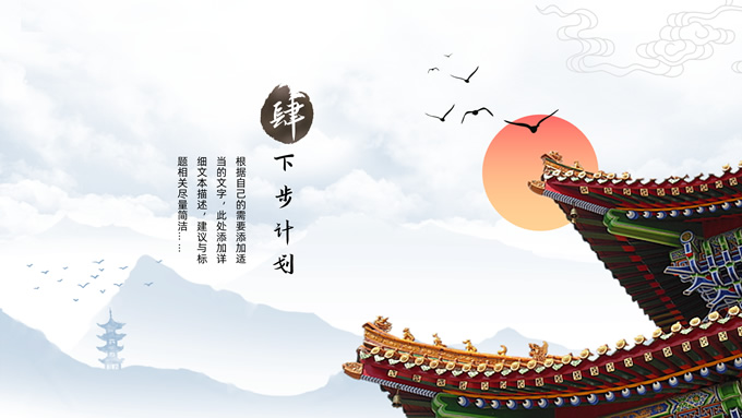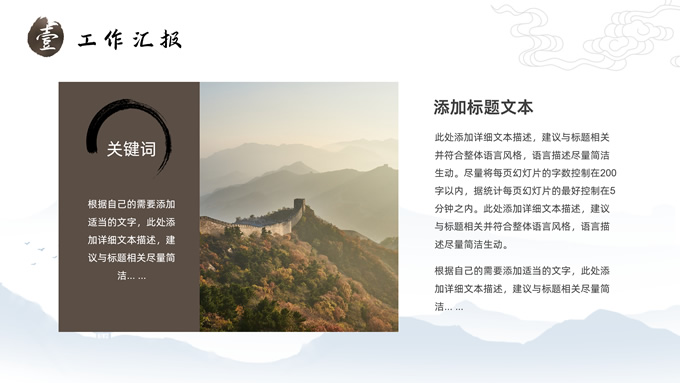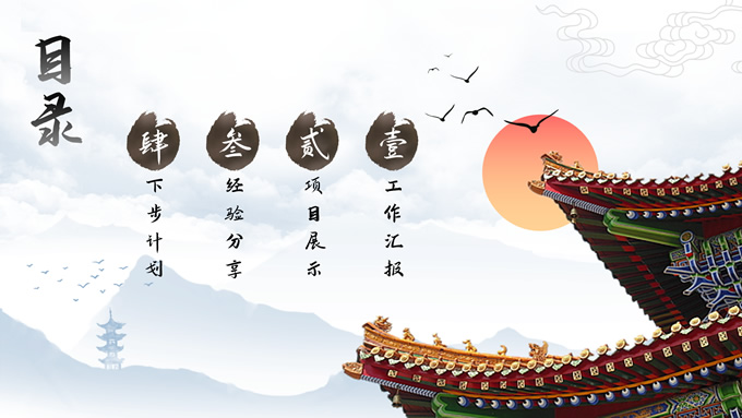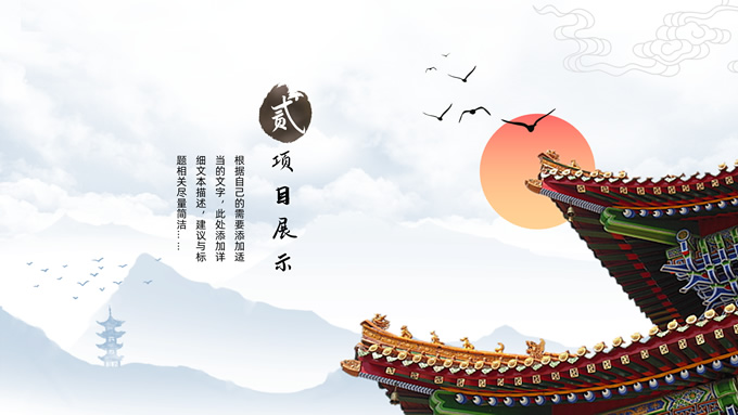 简介:极简中国风工作总结报告通用ppt模板,本模板共25P,目录:工作汇报、项目展示、经验分享、下步计划,淡雅云朵山川背景,线条祥云、红日、古建筑屋檐、大雁、刷迹元素、毛笔字极简创意封面、目录页、过渡页,棕灰配色,简约扁平化图表,极简约中国风版式内容页,适合工作汇报、工作总结、工作计划等场景应用的中国风ppt模板。