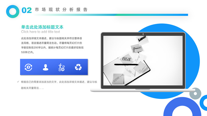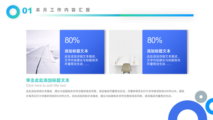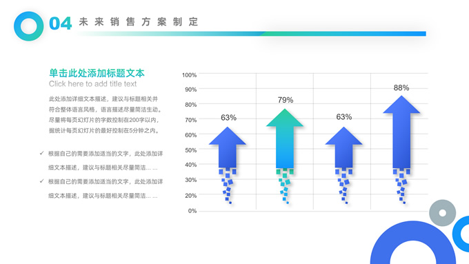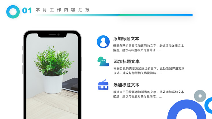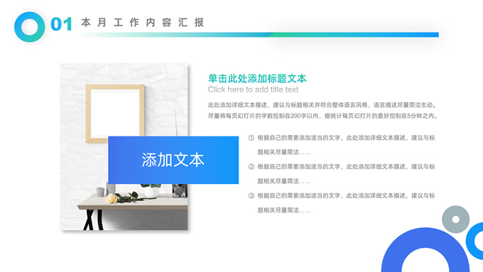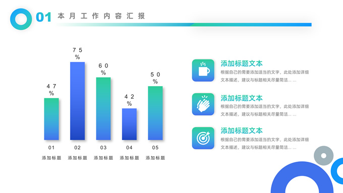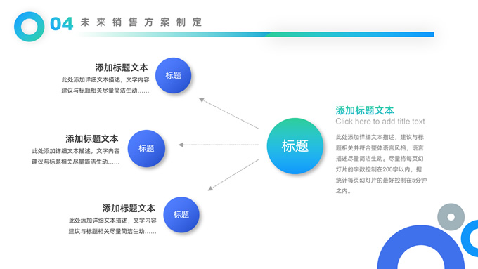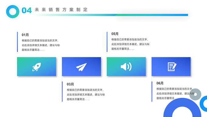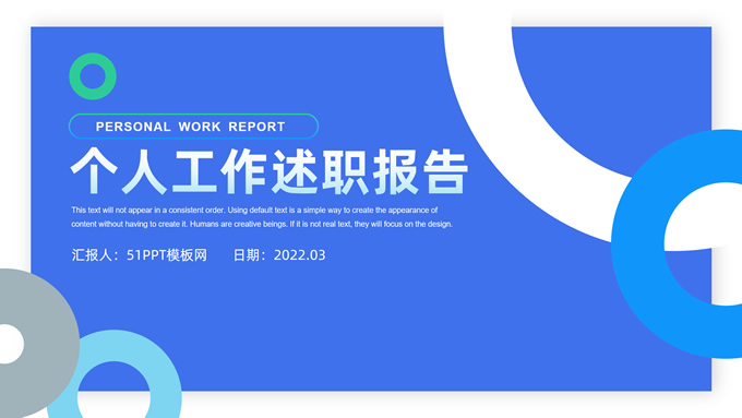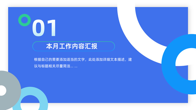简介:销售员个人工作述职报告ppt模板,本模板共20P,目录:本月工作内容汇报、市场现状分析报告、部门执行策略方案、未来销售方案制定,卡片式阴影背景,圆环几何风标题文字封面、目录页、过渡页,蓝绿清新风配色,极简阴影风格图表商务风版式内容页,适合述职报告、个人工作汇报等场景应用的销售员述职通用ppt模板。