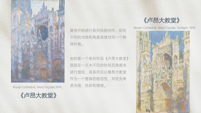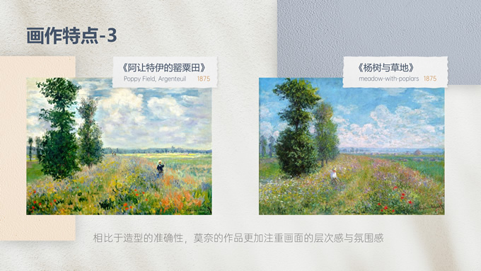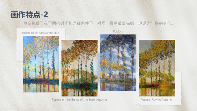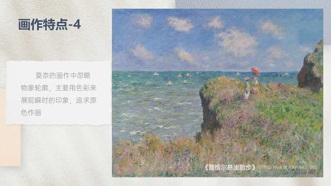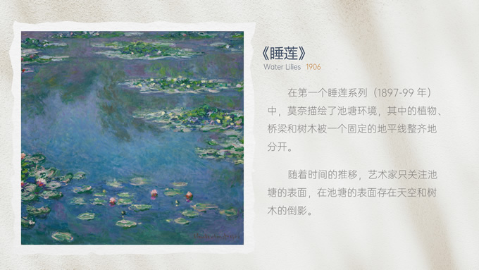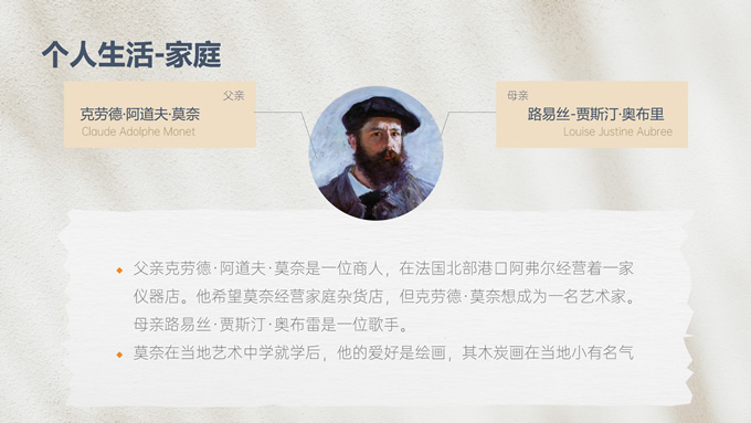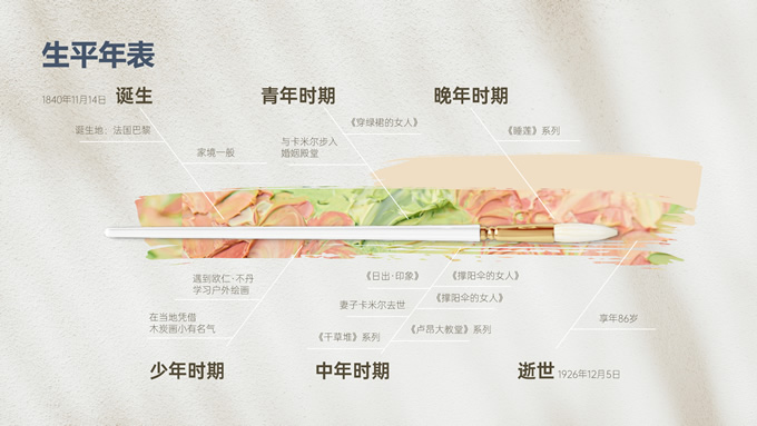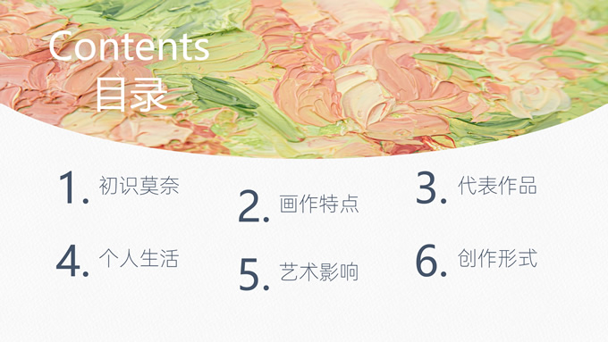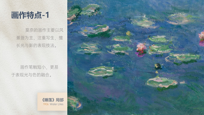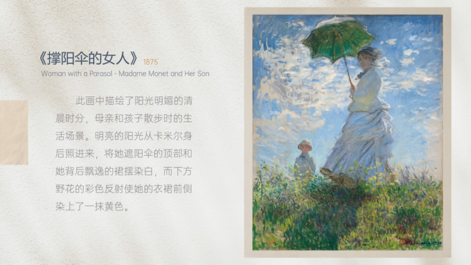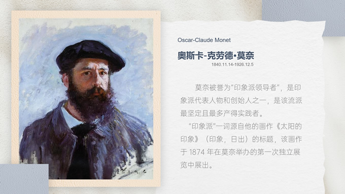 简介:油画风艺术范印象派画家莫奈介绍ppt模板,本模板共32P,目录:初识莫奈、画作特点、代表作品、个人生活、艺术影响、创作形式,暖色系配色,简约艺术风版式内容页,完整内容框架,适合油画教师说课、油画网课课件、油画艺术推介等场景应用,P界达人 喵斐 作品。