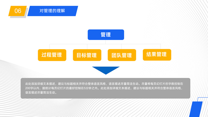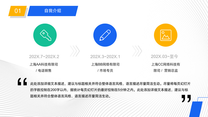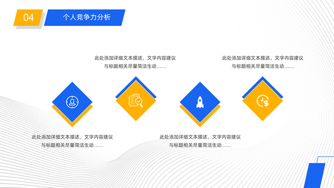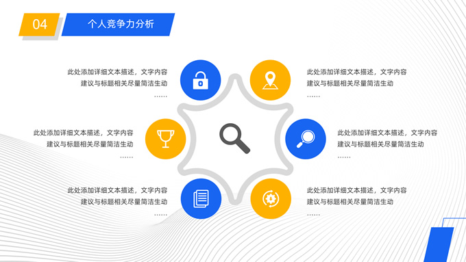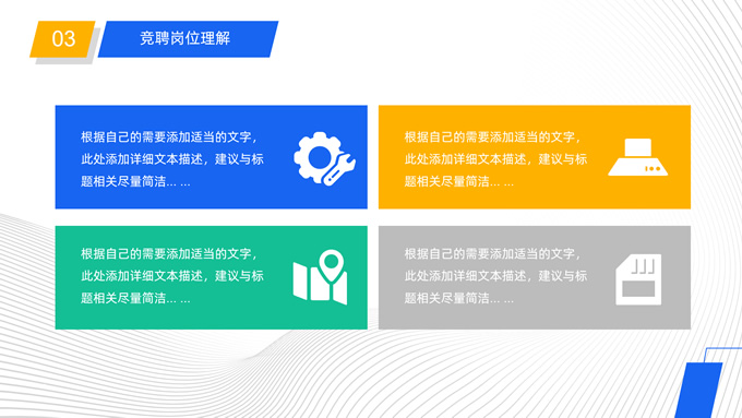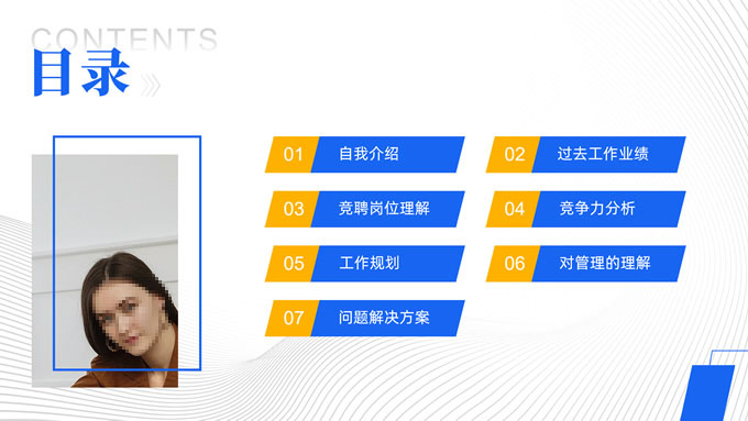 简介:公司岗位竞聘报告ppt模板,本模板共25P,目录:自我介绍、过去工作业绩、竞聘岗位理解、竞争力分析、工作规划、对管理的理解、问题解决方案,矩形框几何风创意封面、目录页、过渡页,蓝黄活力风配色,扁平化图表,完整框架商务版式内容页,适合竞聘报告、述职报告、工作总结、工作汇报等场景应用的商务通用ppt模板。