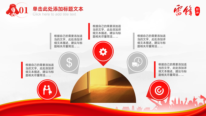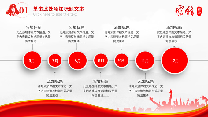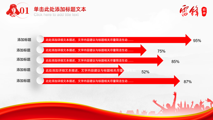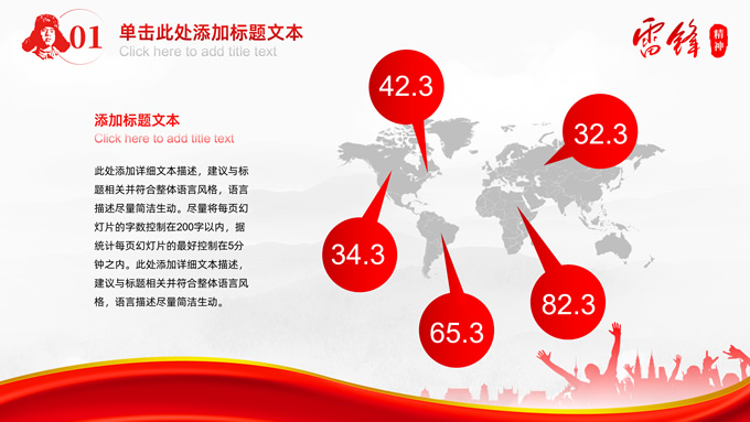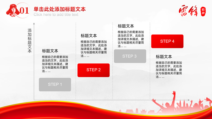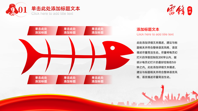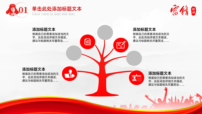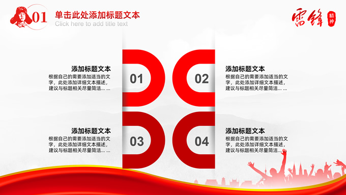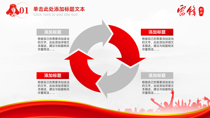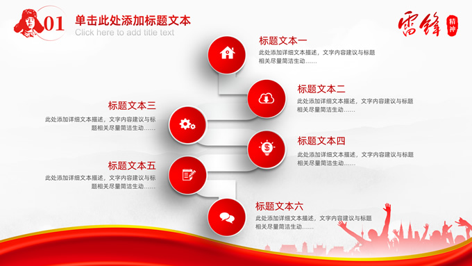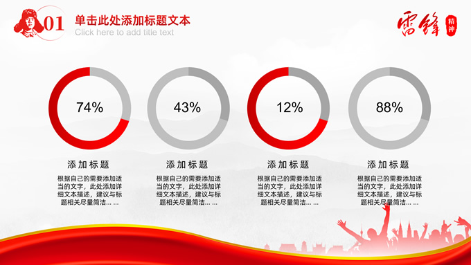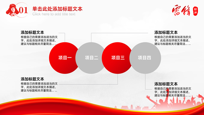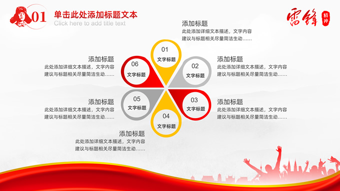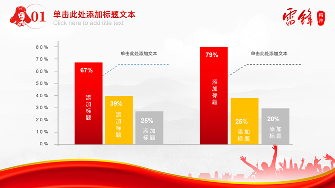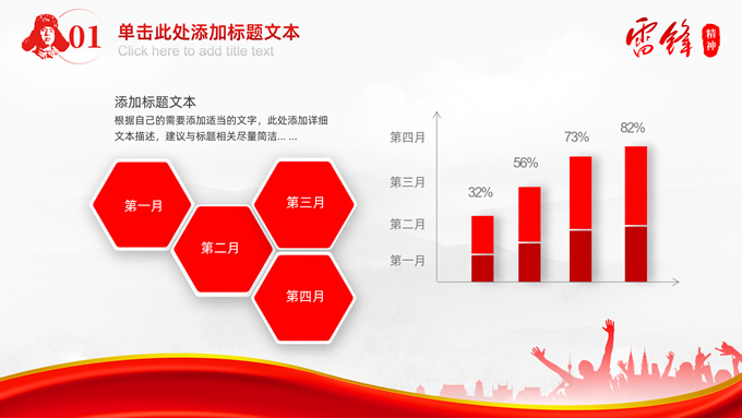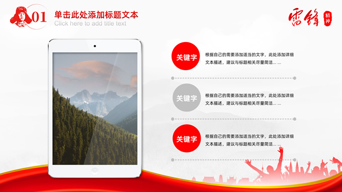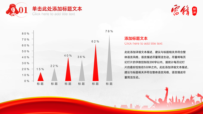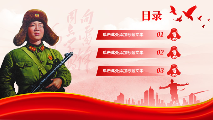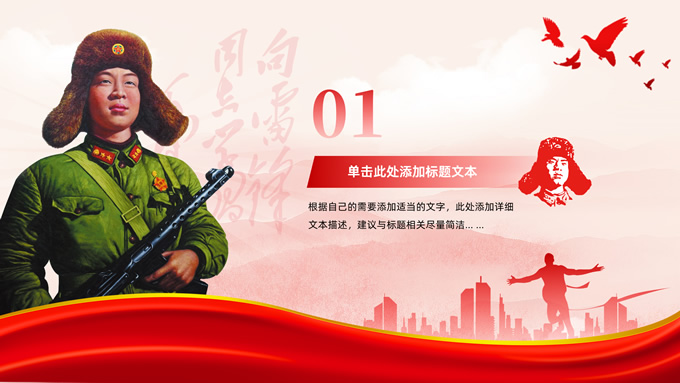 简介:学习雷锋精神主题活动ppt模板,本模板共22P,连绵山川背景,和平鸽、城市剪影、奔跑冲线的人物剪影、飘带、雷锋肖像主图创意封面、目录页、过渡页,中国红配色,扁平化图表,简约实用版式内容页,适合弘扬雷锋精神主题班会、学习雷锋精神主题活动等场景应用的通用型ppt模板。