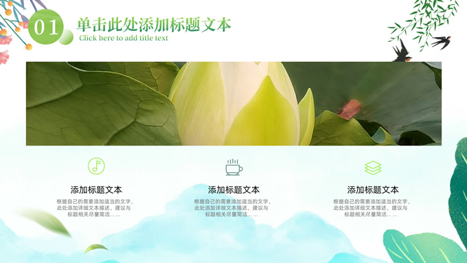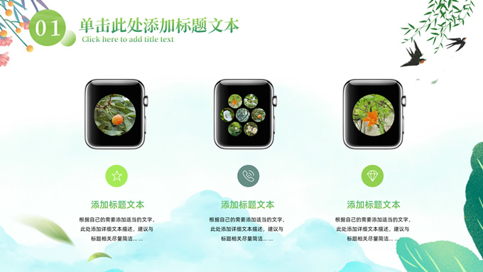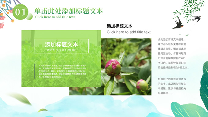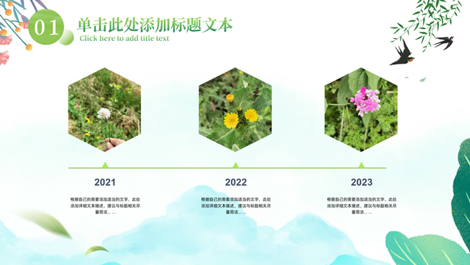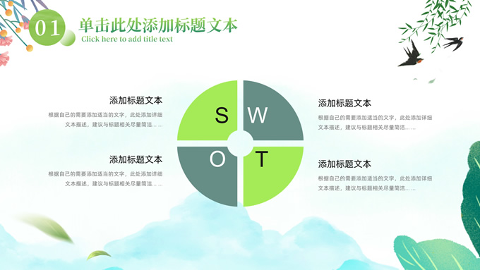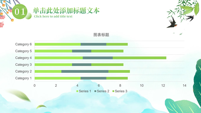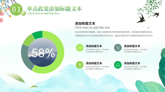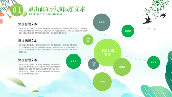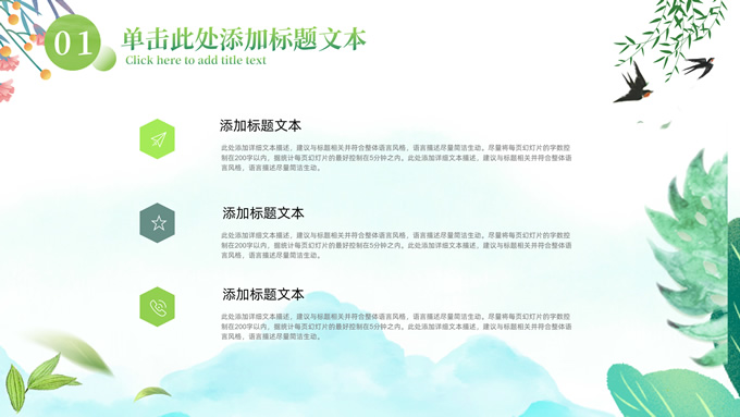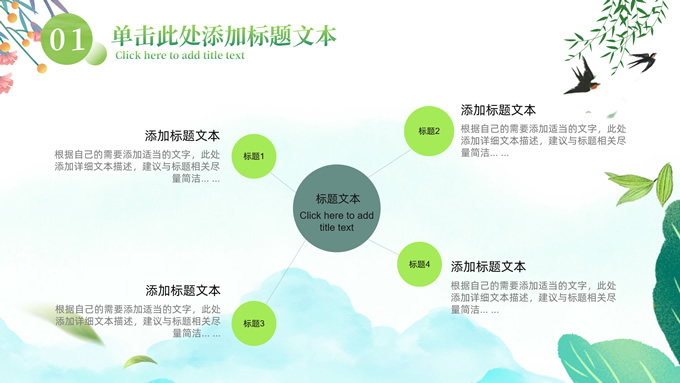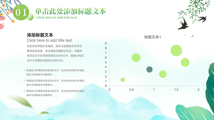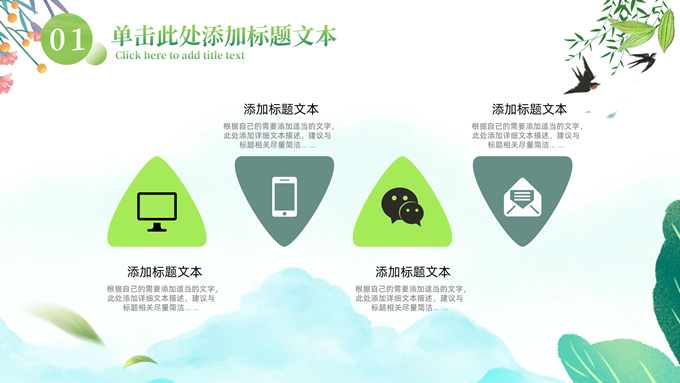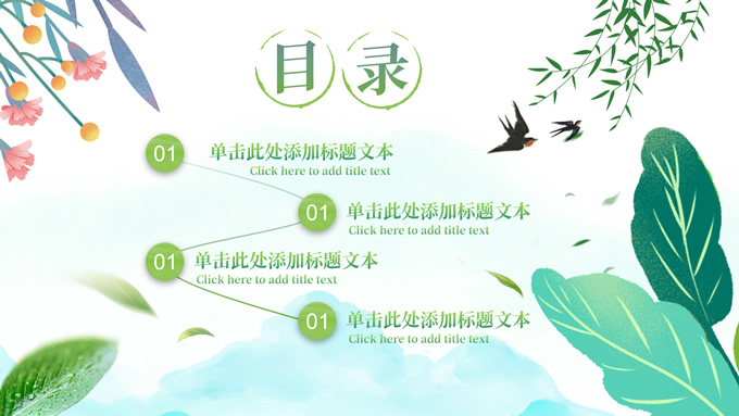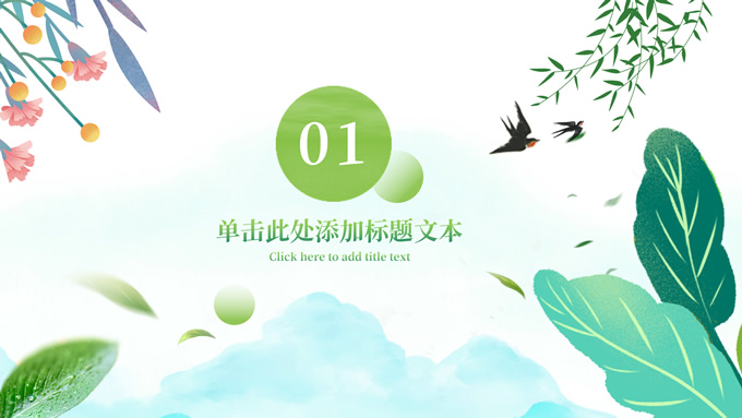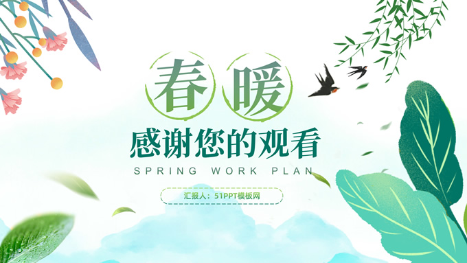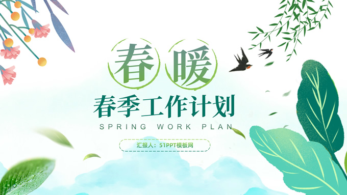 简介:春暖——活力小清新春季工作计划ppt模板,本模板共19P,淡雅蓝绿清新水墨风背景,矢量花朵、绿叶、燕子、柳枝元素创意封面、目录页、过渡页,活力新绿配色,简约扁平化图表,小清新春天风格版式内容页,适合工作计划、工作汇报等场景应用的春季主题商务通用ppt模板。