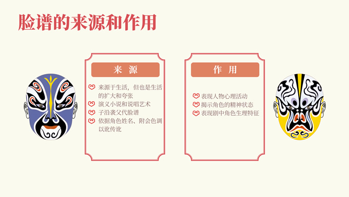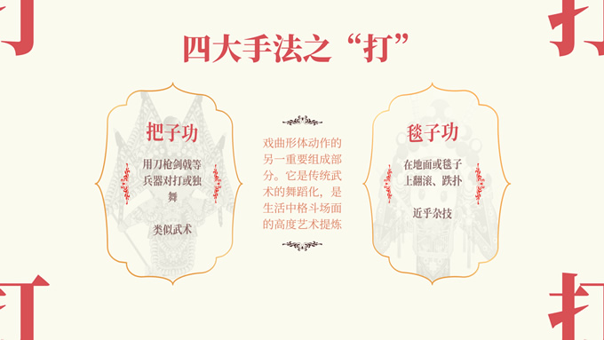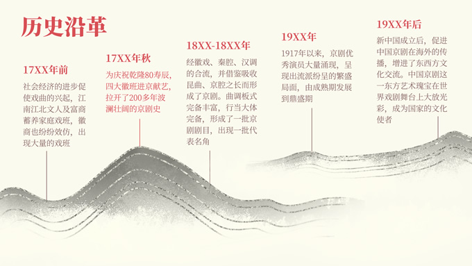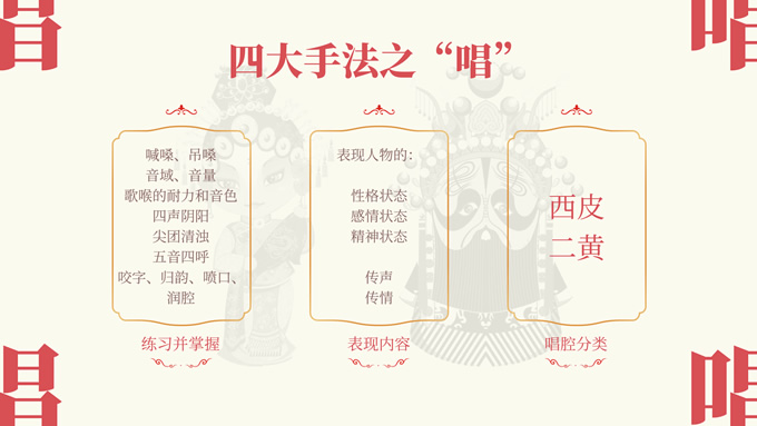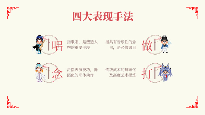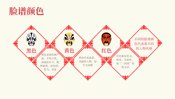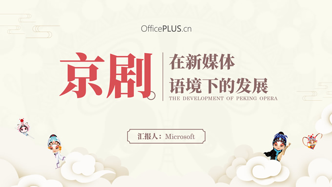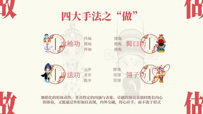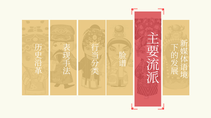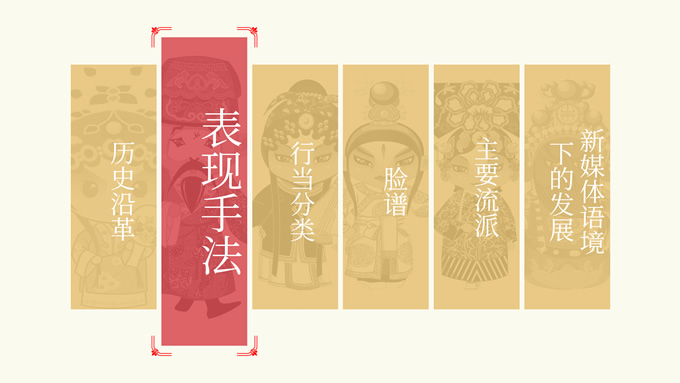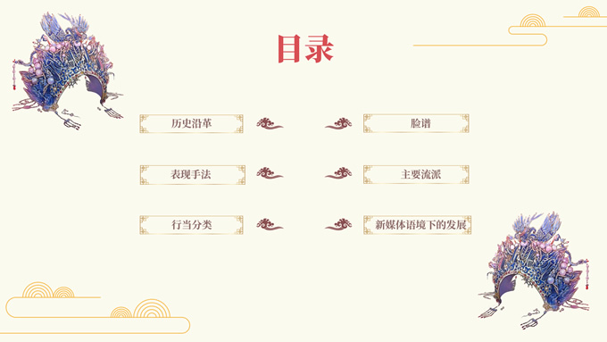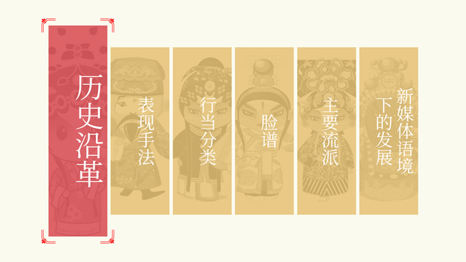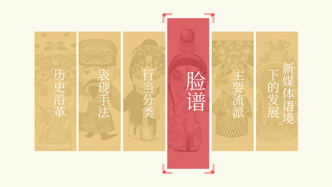 简介:京剧在新媒体语境下的发展ppt模板,本模板共31P,目录:历史沿革、表现手法、行当分类、脸谱、主要流派、新媒体语境下的发展,怀旧古风配色,京剧文化元素配图,简约现代时尚中国风创意版式内容页,适合京剧文化推介、授课课件、分析报告等场景应用的国粹京剧主题ppt模板,P界达人 锦乡悦堂 作品。