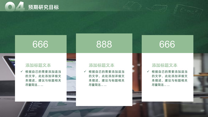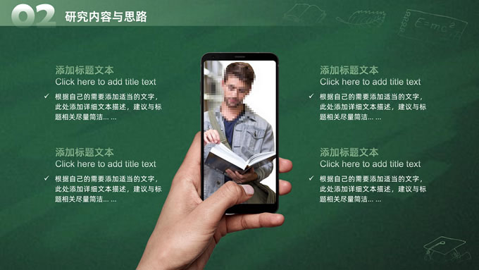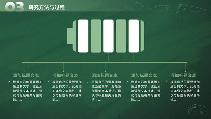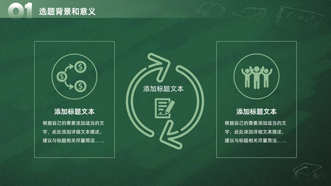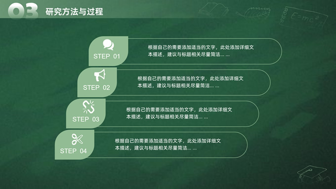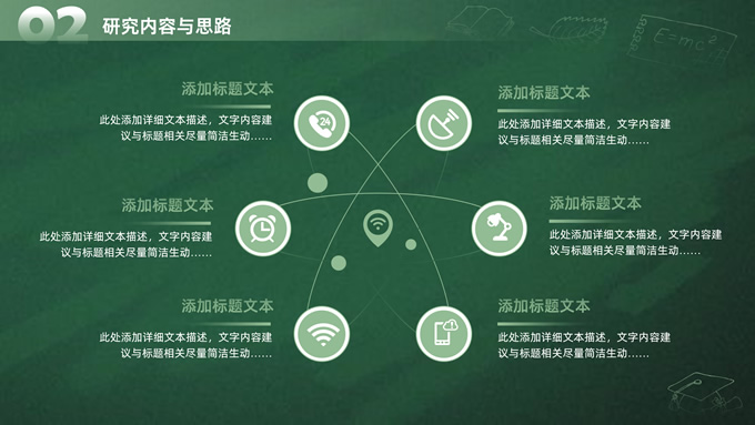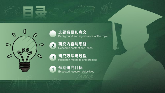 简介:简约实用墨绿清新风论文答辩通用ppt模板,本模板共20P,目录:选题背景和意义、研究内容与思路、研究方法与过程、预期研究目标,绿色黑板背景,手绘教育教学矢量图标,博士生剪影主图标题文字创意封面、目录页、过渡页,墨绿清新风配色,扁平化图表,简约实用学术风版式内容页,适合开题报告、论文答辩、学术汇报等场景应用的答辩通用ppt模板。