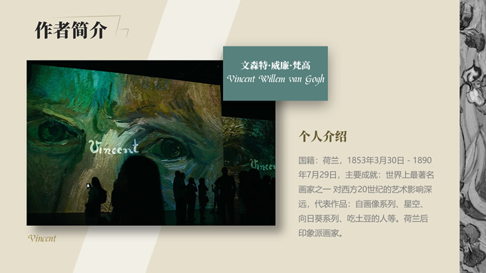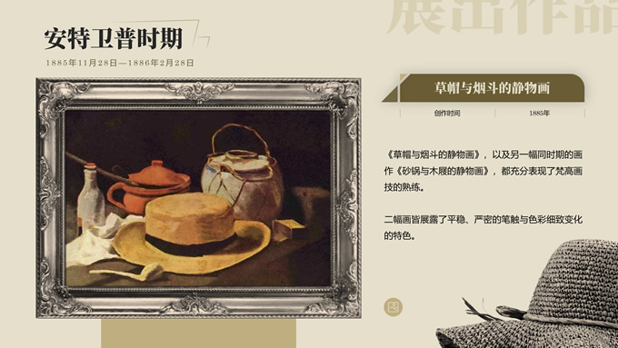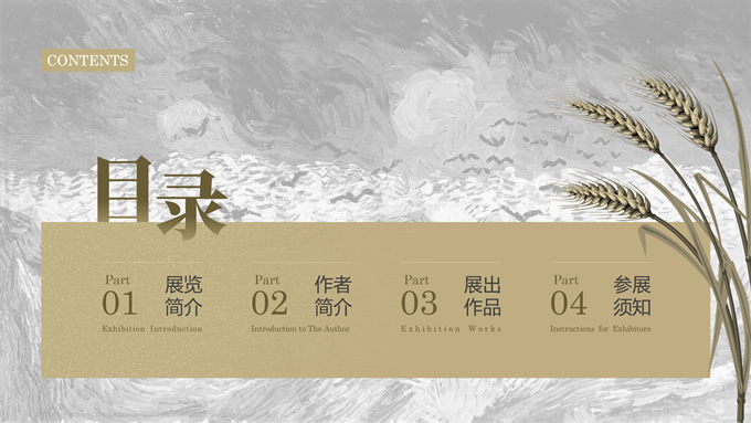 简介:复古风艺术展览介绍画展ppt模板,本模板共37P,这份模板为复古风,主要针对艺术展览、画展等活动而制作,配色使用复古油画色调茶色,搭配青色,表现艺术品的历史感,模板各版面大部分图片可以删除替换,支持一键改主题色、主题字体,本模板真实模拟了展览介绍的场景,设计了展览简介、作者简介、展出作品、参展须知4个模块,并设计了大量页面方便使用者套用,P界达人 不李不李 作品。