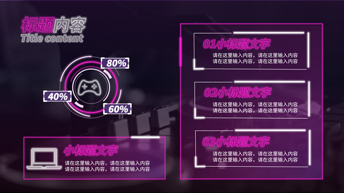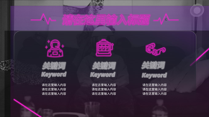 简介:霓虹灯效果赛博朋克复古电子游戏风ppt模板,本模板共13P,以粉色和紫色为主基调配色,浓浓的赛博朋克味道PPT,每一张PPT都采用了霓虹灯效果元素,搭配游戏背景图与游戏图标,炫酷时尚,适合个人汇报、营销策划、职场培训等场景应用,P界达人 常小二 作品。