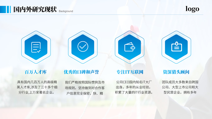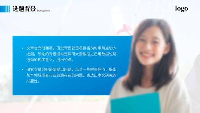 简介:校园清新文艺风毕业答辩ppt模板,本模板共10P,目录:选题背景、国内外研究现状、目的与意义 、结果与结论、创新与不足,全图形校园风背景,配色采取蓝青色,体现青春气息,适合论文答辩、学生总结、学术汇报等场景应用的毕业答辩通用ppt模板,P界达人 苏晴 作品。
