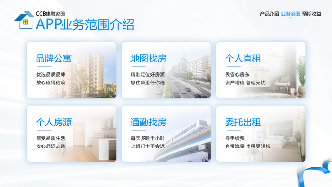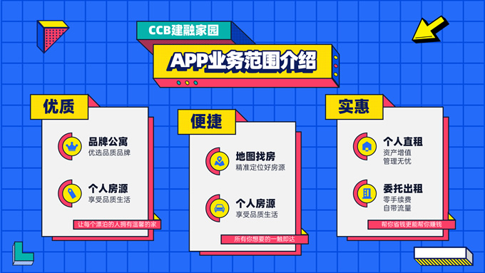 简介:【晓雄】《王牌P计划》个人PPT作品集锦,本模板共11P,主要内容为CCB建融家园APP业务范围介绍,包含商务风、科技风、黑金风、清新蓝、孟菲斯等多种风格,页面排版多样,简约大气高端设计,适合日常工作汇报、产品介绍路演、新品发布会等多场景应用,P界达人 晓雄 作品。