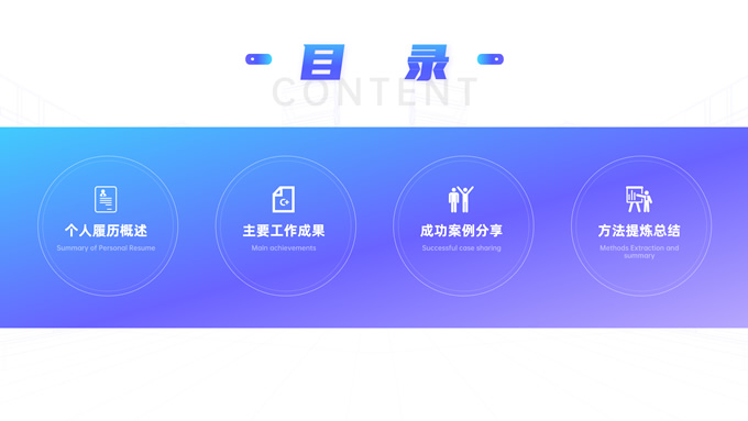 简介:科技公司商务面试陈述ppt模板,本模板共10P,蓝色和紫色的渐变色块、渐变线条搭配,主要内容页搭配图标及拆分突出的文字标题,让整份PPT在商务面试中透着一股专业和科技感,适合商务面试、职场述能、工作汇报等场景应用的通用ppt模板,主要内容页面排版重视历程时间轴、案例展示,方法分析,有较多作者在日常练习中很喜欢的逻辑页展现方式,P界达人 瓜瓜 作品。