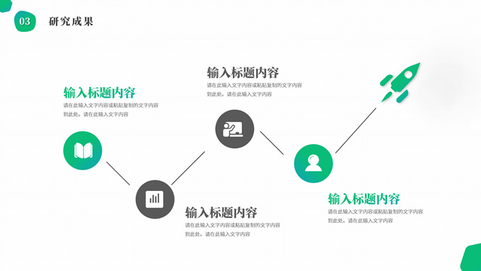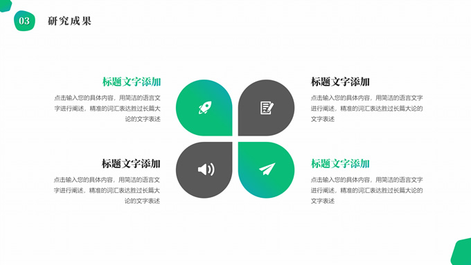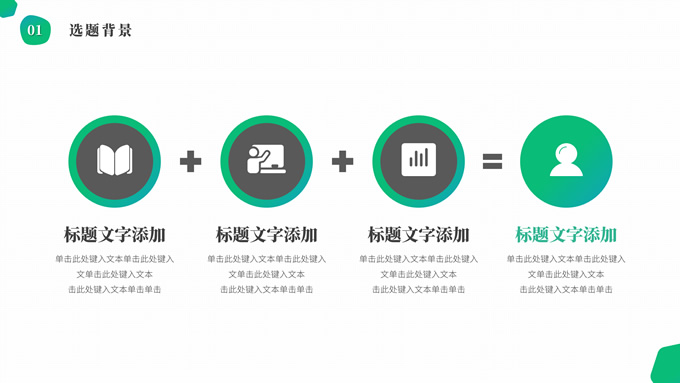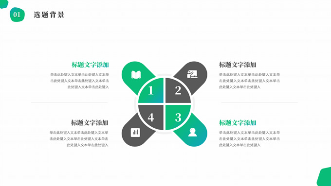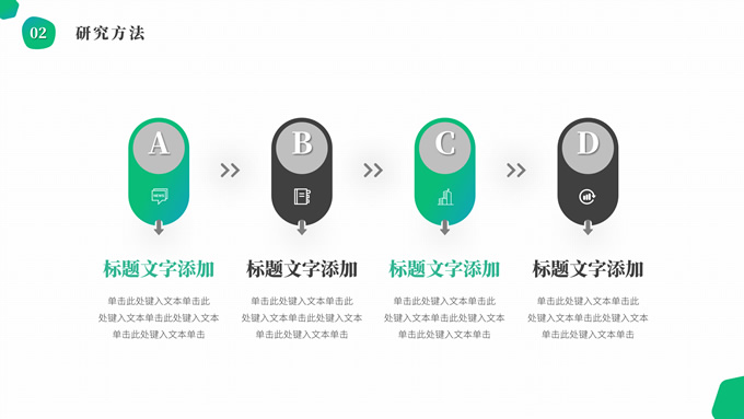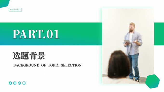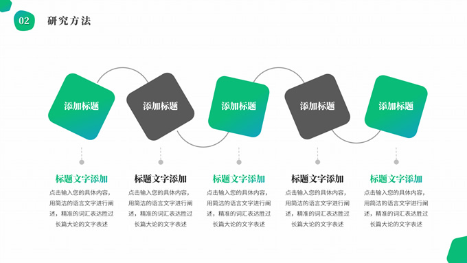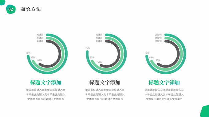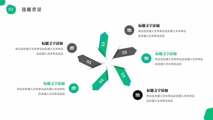 简介:渐变绿清新几何风学士论文答辩ppt模板,本模板共19P,目录:选题背景、研究方法、研究成果、设计总结,简洁几何风创意封面、目录页、过渡页,渐变绿、灰配色,纯白背景简约扁平化图表内容页,适合论文答辩、毕业汇报等场景应用的学士答辩通用ppt模板。