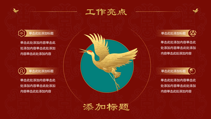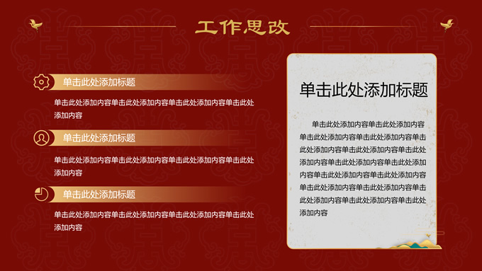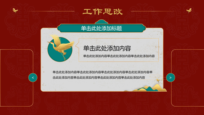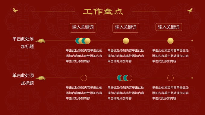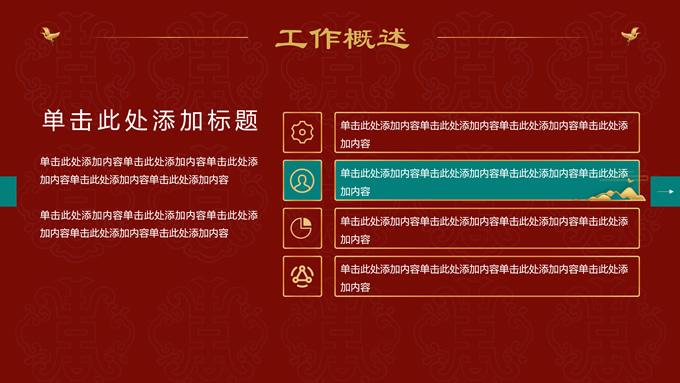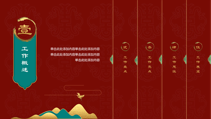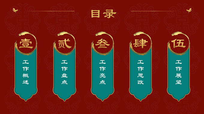 简介:现代国潮中国风红色工作汇报ppt模板,本模板共12P,支持一键换色,设计风格为红色复古中国风,适用于年终工作总结、党政类工作总结、化妆彩妆类行业商业计划工作总结等场景应用,P界达人 花生壳 作品。