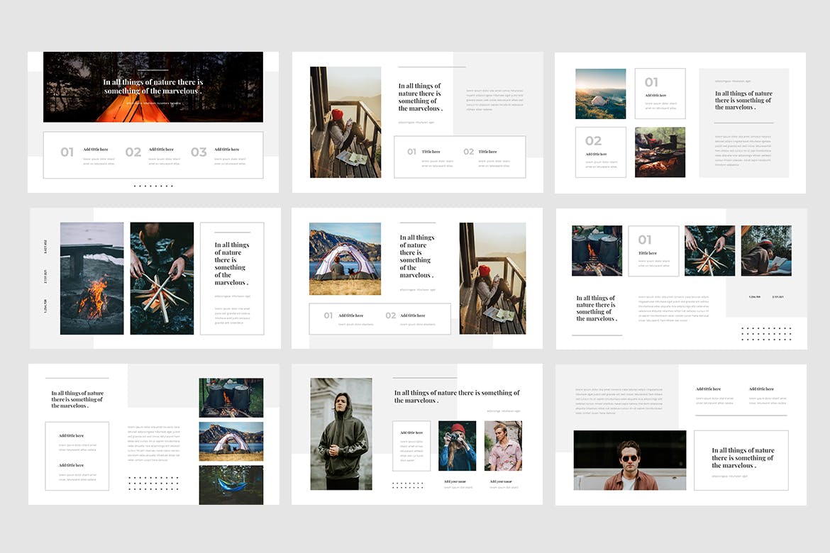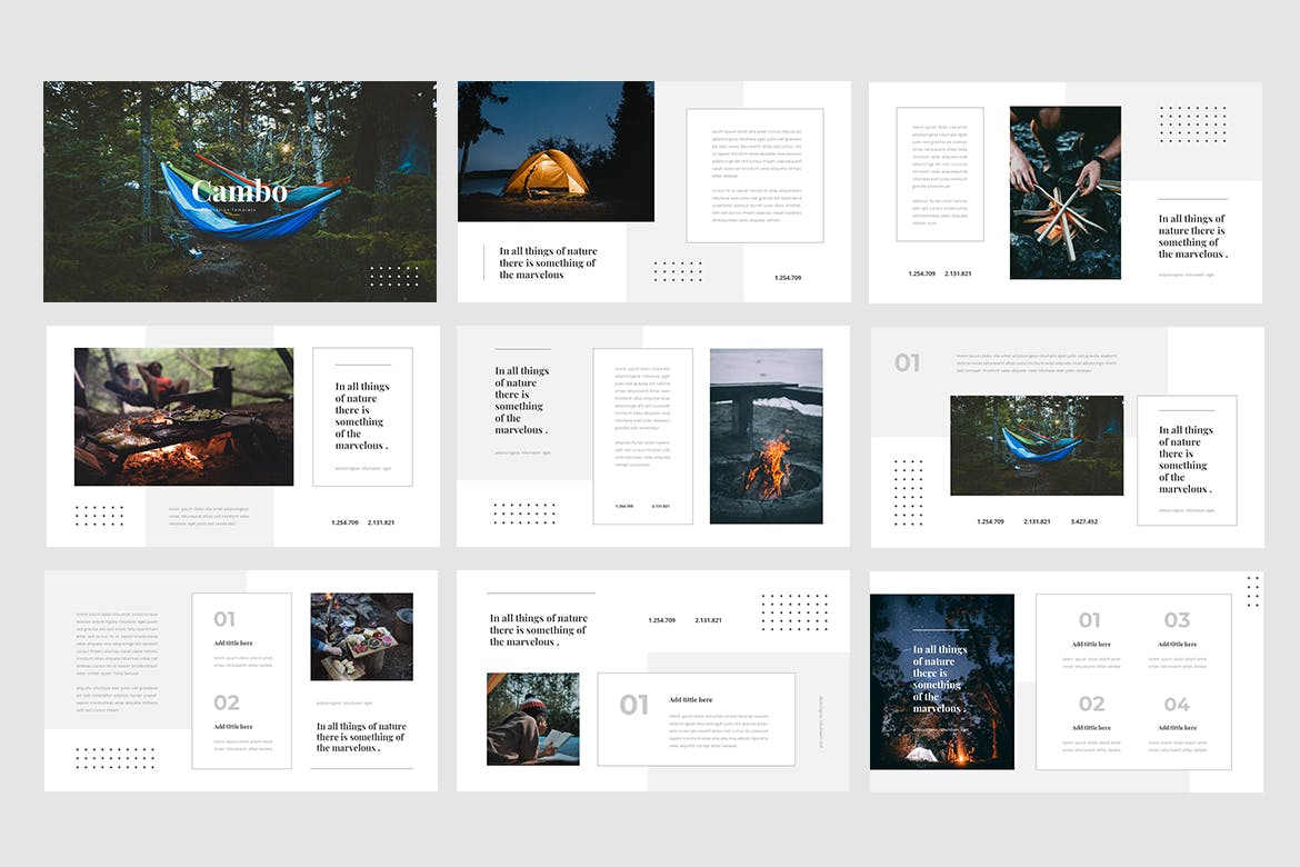 这次老不湿分享的是,时尚简约高端个性的户外露营主题的高品质powerpoint幻灯片设计模板(pptx),我们知道演示幻灯片是业务营销领域中最重要的方面之一。成功的演讲可能会带您进入其他巨大的机会。当听众理解您的信息并对大局有相同的看法时,与新客户,投资者和客户的交往也变得更加容易。进行更改以下载我们的Cambo户外露营PowerPoint演示文稿模板。整洁的布局将使您的内容结构化并以正确的流程呈现。幻灯片也很容易编辑。