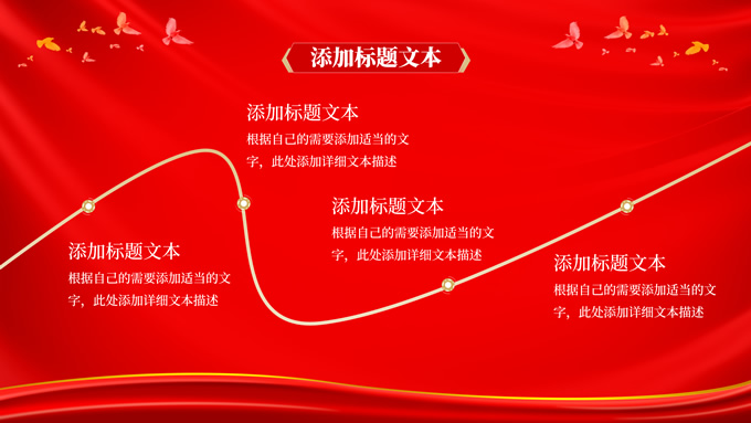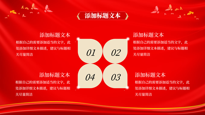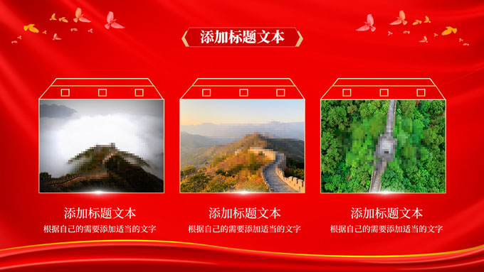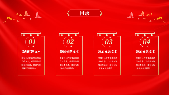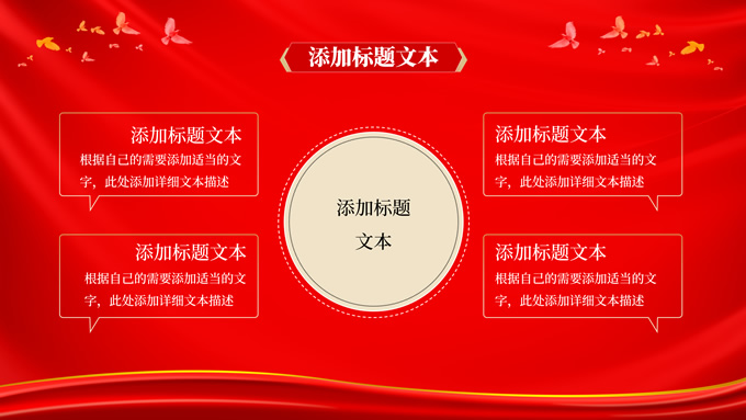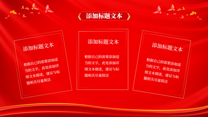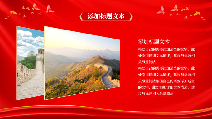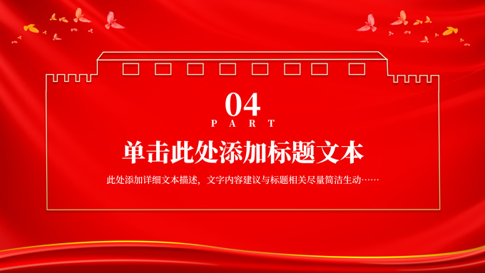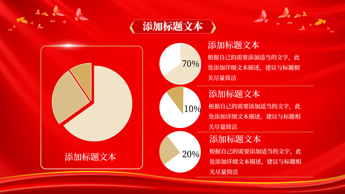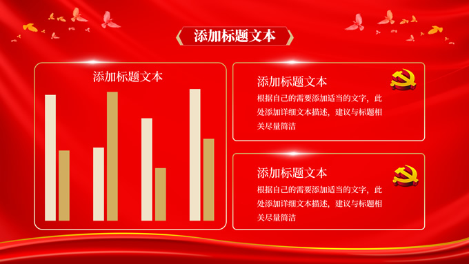 简介:高端大气党政风总结汇报通用ppt模板,本模板共15P,人民大会堂顶灯、和平鸽、旗帜、故宫等元素创意封面,中国风线条元素目录页、过渡页,中国红配色,扁平化图表,设计感满满,可应用于党政风工作汇报,党课课件制作等用途,里面包含了一键换色和文字,方便修改,简单易用,欢迎大家下载使用,P界达人 一只智慧树 作品。