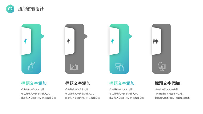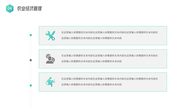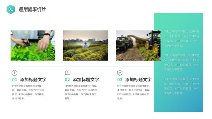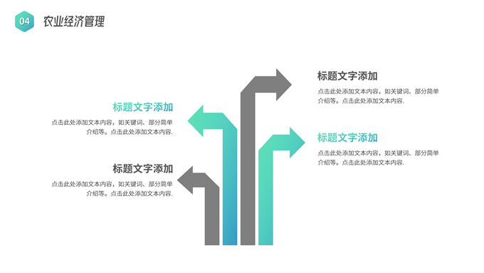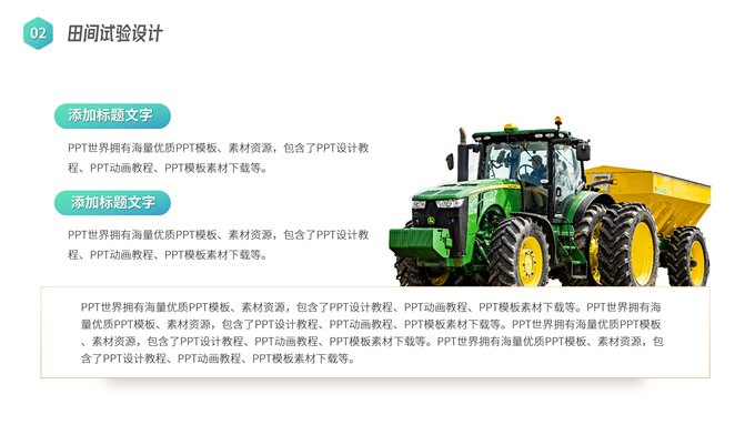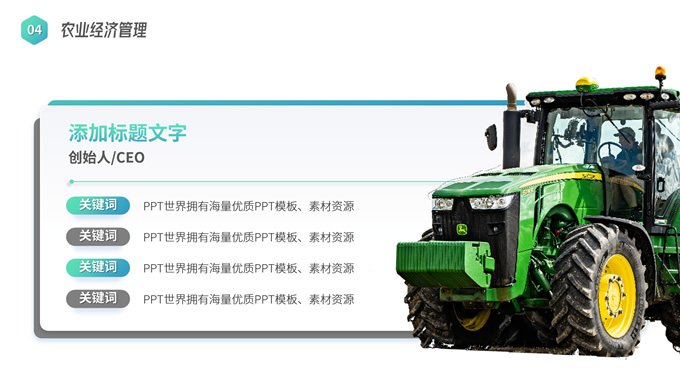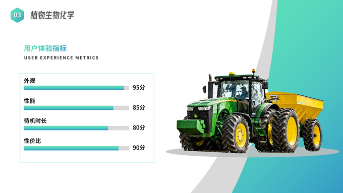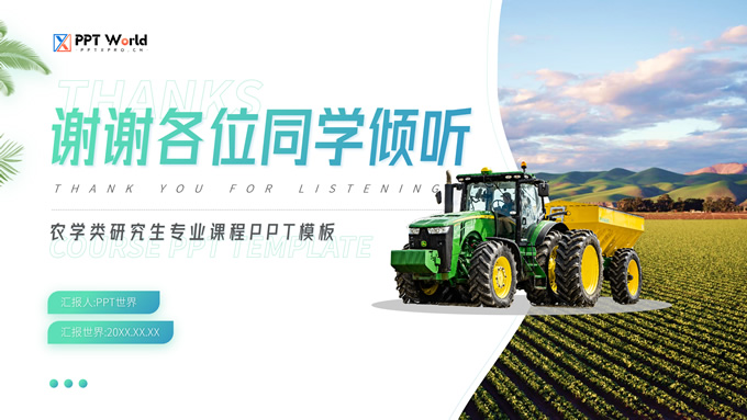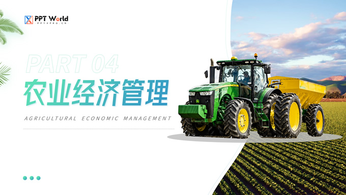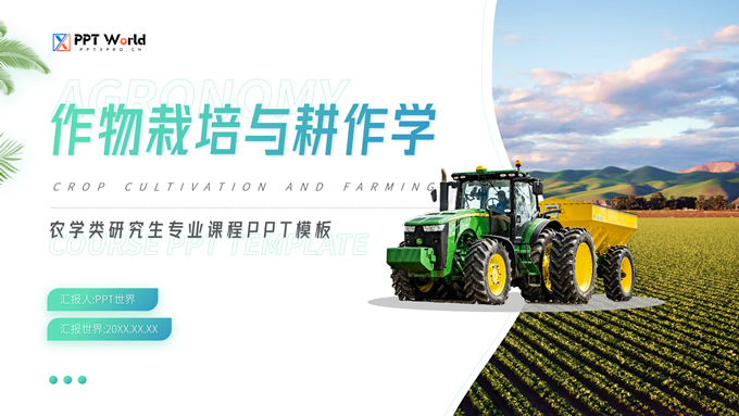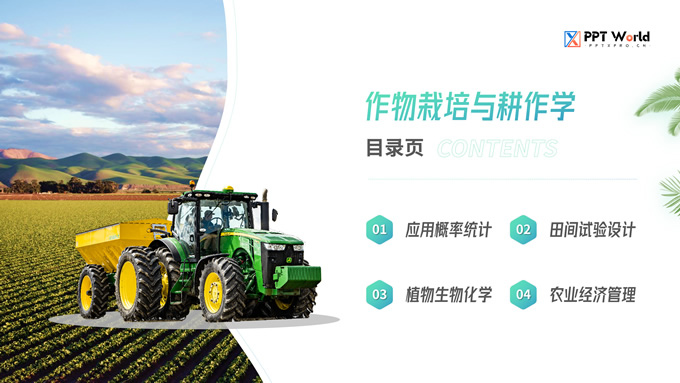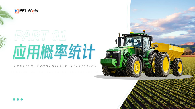 简介:农学类学生答辩课程课件ppt模板,本模板共19P,目录:应用概率统计、田间试验设计、植物生物化学、农业经济管理,几何图形裁图农田、农机主图几何风封面、目录页、过渡页,渐变绿、灰配色,简约版式内容页,适合学术汇报、论文答辩、教学课件等场景应用的农学类学生通用ppt模板。