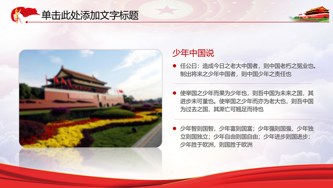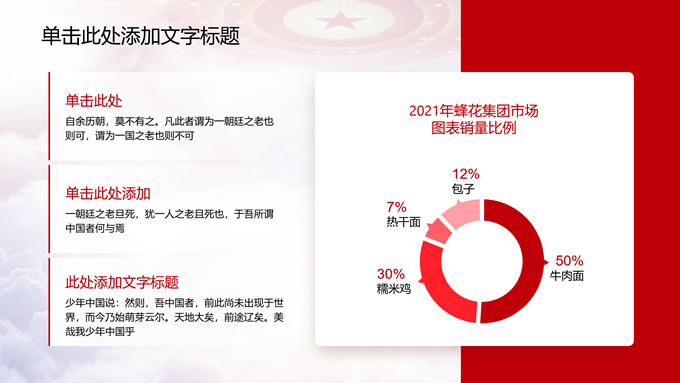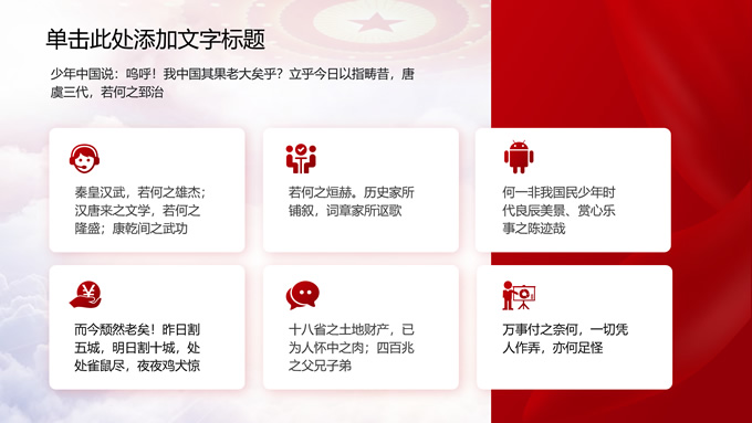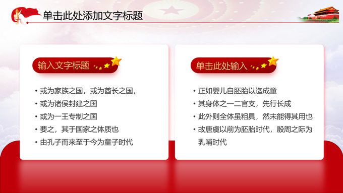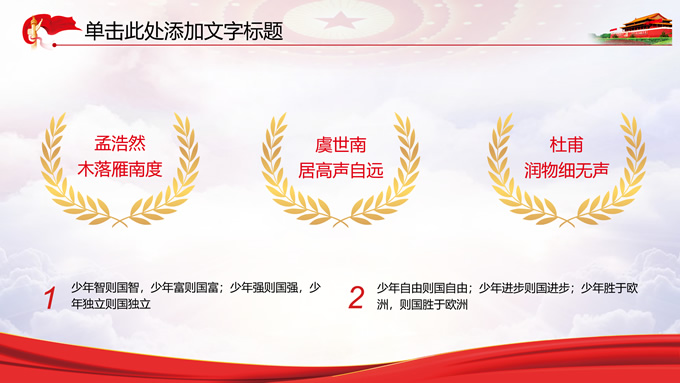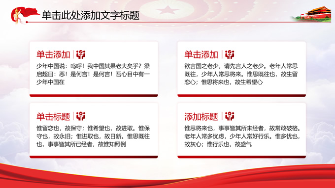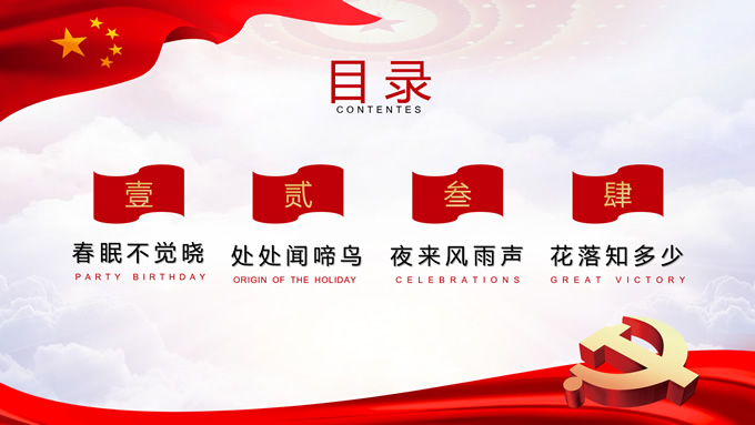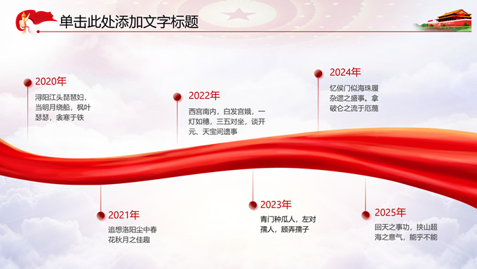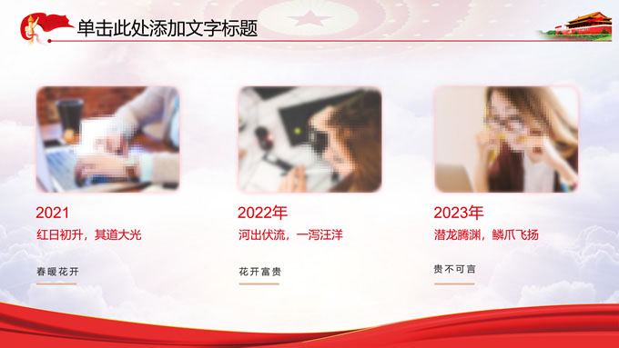 简介:党政风工作汇报通用ppt模板,本模板共11P,党徽、光芒、和平鸽、五角星、红飘带、天安门、华表等素材创意设计,中国红配色,阴影风格图表,模板可应用于工作汇报、党课心得、党课课件、工作总结等场景的党政通用型ppt模板,方便修改,简约易用,P界达人 苏晴 作品。