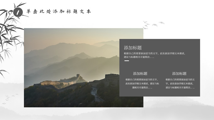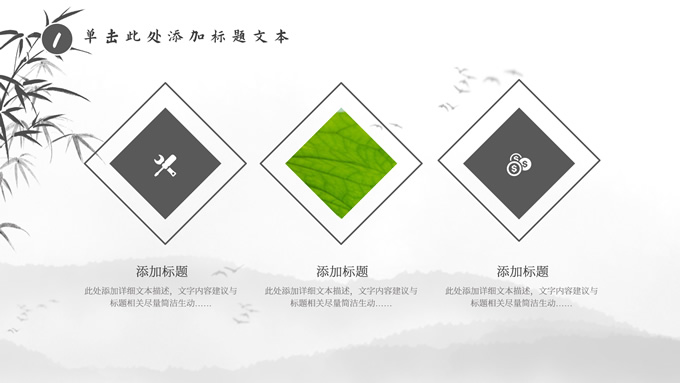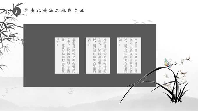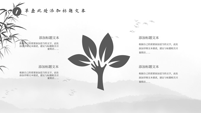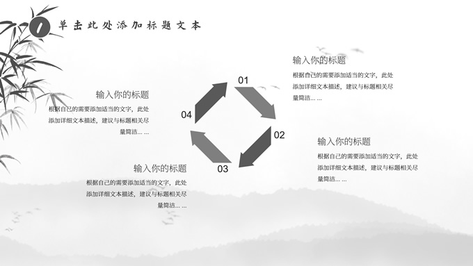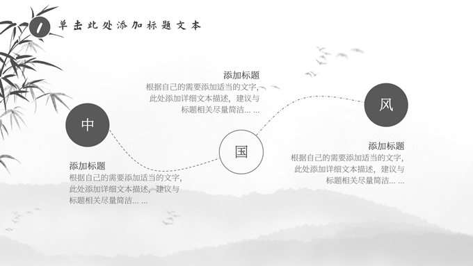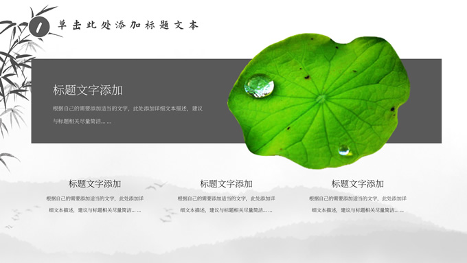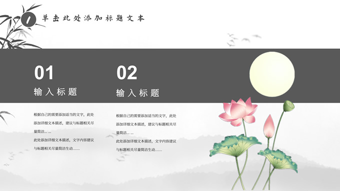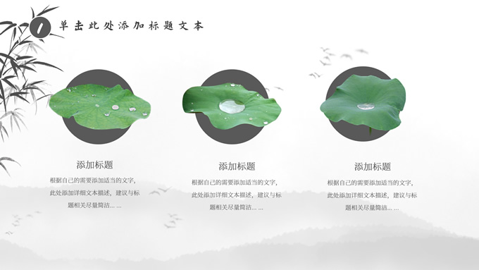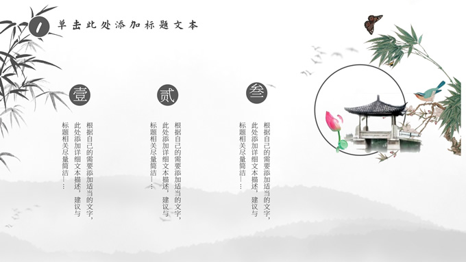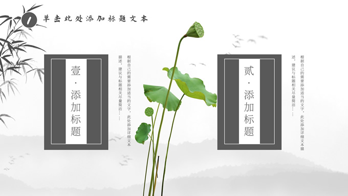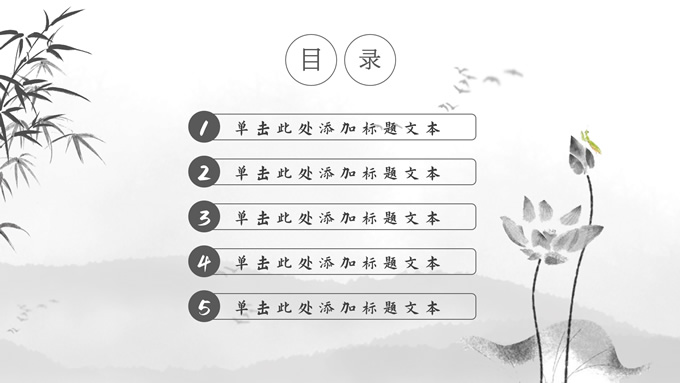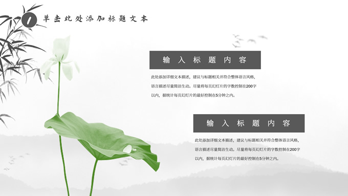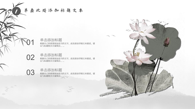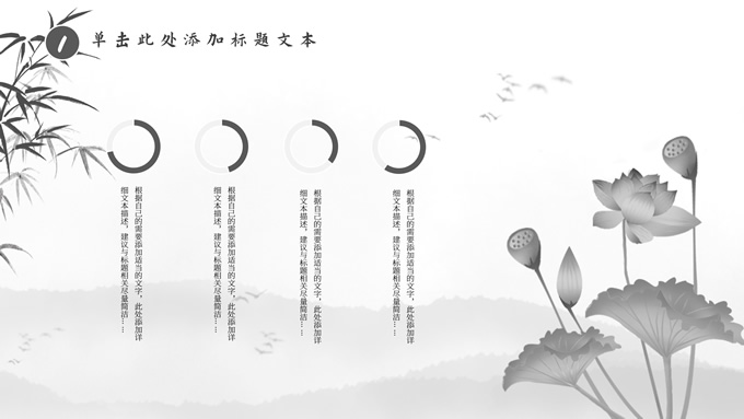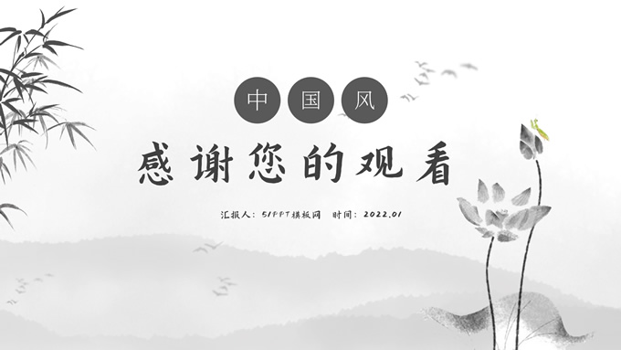 简介:经典灰极简中国风工作汇报ppt模板,本模板共20P,淡雅水墨山川背景,水墨竹、莲花、大雁、极简标题文字创意封面、目录页、过渡页,扁平化图表,莲叶、莲花、兰花素材配图中国风版式内容页,适合工作汇报、年终总结、新年工作计划等场景应用的极简中国风ppt模板。